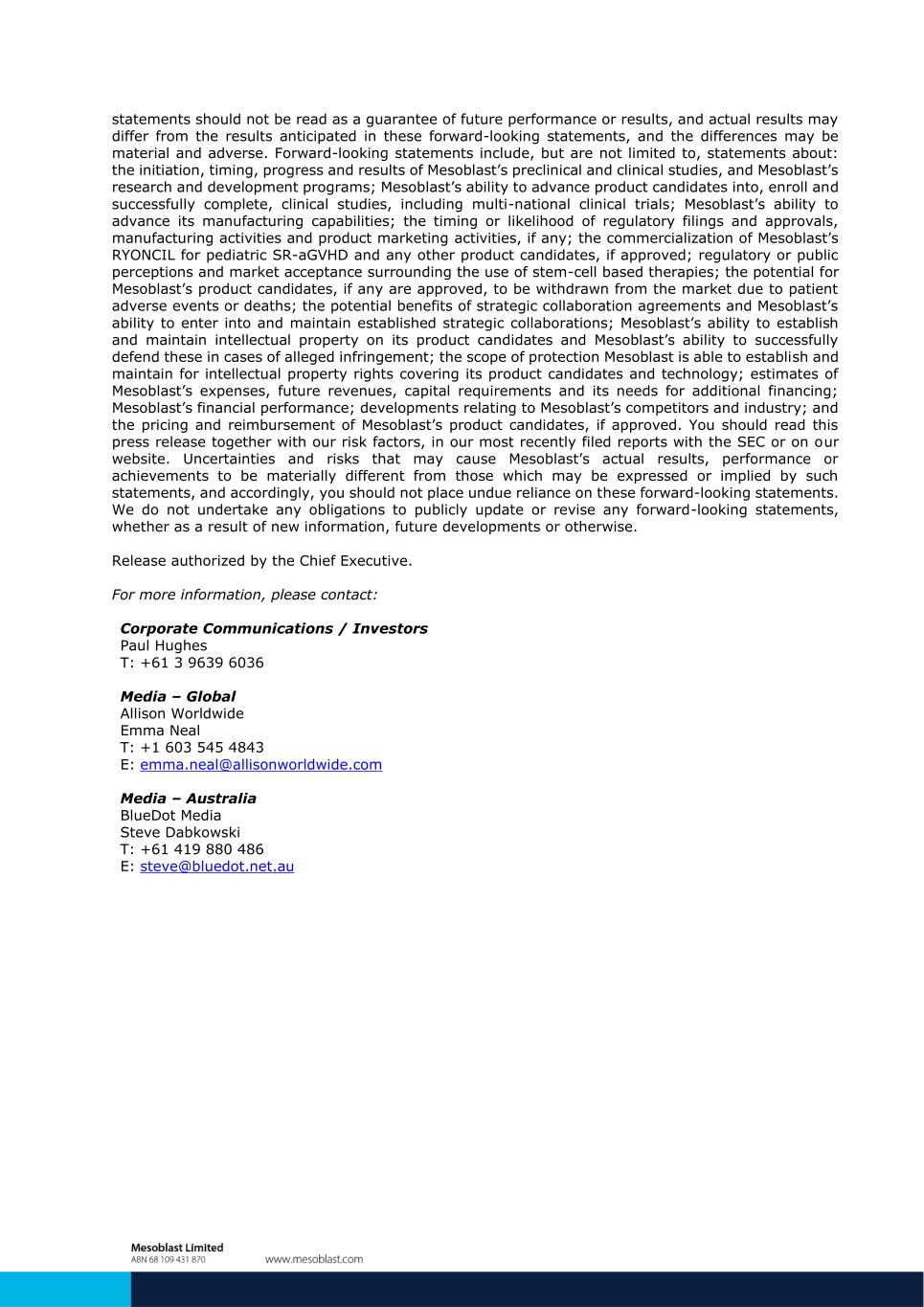 statements should not be read as a guarantee of future performance or results, and actual results may differ from the results anticipated in these forward-looking statements, and the differences may be material and adverse. Forward-looking statements include, but are not limited to, statements about: the initiation, timing, progress and results of Mesoblast’s preclinical and clinical studies, and Mesoblast’s research and development programs; Mesoblast’s ability to advance product candidates into, enroll and successfully complete, clinical studies, including multi-national clinical trials; Mesoblast’s ability to advance its manufacturing capabilities; the timing or likelihood of regulatory filings and approvals, manufacturing activities and product marketing activities, if any; the commercialization of Mesoblast’s RYONCIL for pediatric SR-aGVHD and any other product candidates, if approved; regulatory or public perceptions and market acceptance surrounding the use of stem-cell based therapies; the potential for Mesoblast’s product candidates, if any are approved, to be withdrawn from the market due to patient adverse events or deaths; the potential benefits of strategic collaboration agreements and Mesoblast’s ability to enter into and maintain established strategic collaborations; Mesoblast’s ability to establish and maintain intellectual property on its product candidates and Mesoblast’s ability to successfully defend these in cases of alleged infringement; the scope of protection Mesoblast is able to establish and maintain for intellectual property rights covering its product candidates and technology; estimates of Mesoblast’s expenses, future revenues, capital requirements and its needs for additional financing; Mesoblast’s financial performance; developments relating to Mesoblast’s competitors and industry; and the pricing and reimbursement of Mesoblast’s product candidates, if approved. You should read this press release together with our risk factors, in our most recently filed reports with the SEC or on our website. Uncertainties and risks that may cause Mesoblast’s actual results, performance or achievements to be materially different from those which may be expressed or implied by such statements, and accordingly, you should not place undue reliance on these forward-looking statements. We do not undertake any obligations to publicly update or revise any forward-looking statements, whether as a result of new information, future developments or otherwise. Release authorized by the Chief Executive. For more information, please contact: Corporate Communications / Investors Paul Hughes T: +61 3 9639 6036 Media – Global Allison Worldwide Emma Neal T: +1 603 545 4843 E: emma.neal@allisonworldwide.com Media – Australia BlueDot Media Steve Dabkowski T: +61 419 880 486 E: steve@bluedot.net.au