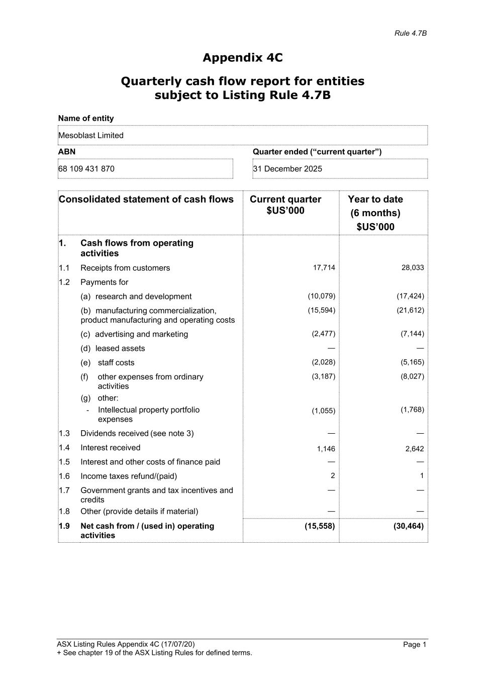 Rule 4.7B ASX Listing Rules Appendix 4C (17/07/20) + See chapter 19 of the ASX Listing Rules for defined terms. Page 1 Appendix 4C Quarterly cash flow report for entities subject to Listing Rule 4.7B Name of entity Mesoblast Limited ABN Quarter ended (“current quarter”) 68 109 431 870 31 December 2025 Consolidated statement of cash flows Current quarter $US’000 Year to date (6 months) $US’000 1. Cash flows from operating activities 1.1 Receipts from customers 17,714 28,033 1.2 Payments for (a) research and development (10,079) (17,424) (b) manufacturing commercialization, product manufacturing and operating costs (15,594) (21,612) (c) advertising and marketing (2,477) (7,144) (d) leased assets — — (e) staff costs (2,028) (5,165) (f) other expenses from ordinary activities (g) other: - Intellectual property portfolio expenses (3,187) (8,027) (1,055) (1,768) 1.3 Dividends received (see note 3) — — 1.4 Interest received 1,146 2,642 1.5 Interest and other costs of finance paid — — 1.6 Income taxes refund/(paid) 2 1 1.7 Government grants and tax incentives and credits — — 1.8 Other (provide details if material) — — 1.9 Net cash from / (used in) operating activities (15,558) (30,464)