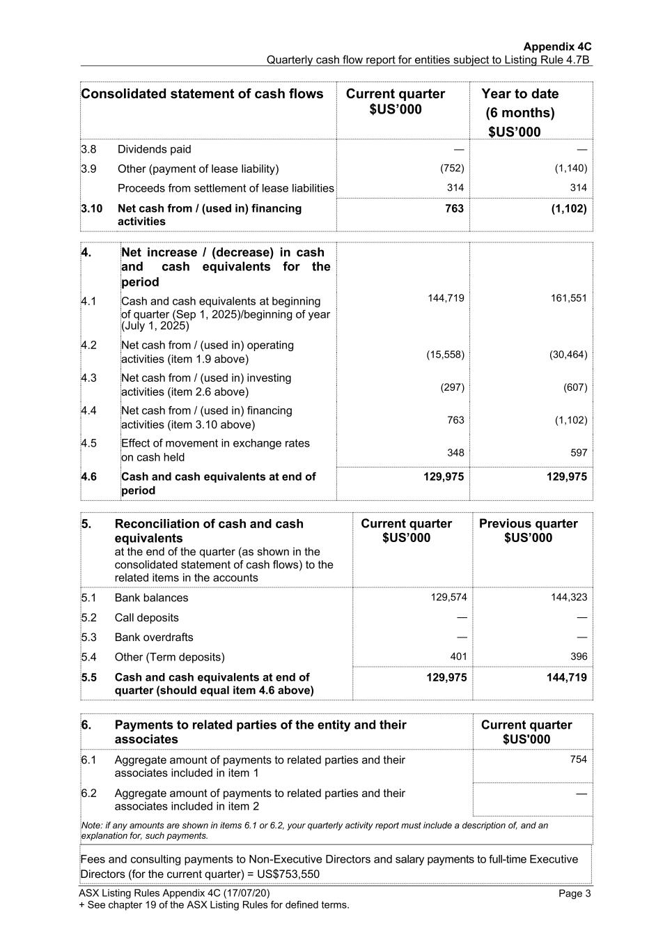 Appendix 4C Quarterly cash flow report for entities subject to Listing Rule 4.7B ASX Listing Rules Appendix 4C (17/07/20) + See chapter 19 of the ASX Listing Rules for defined terms. Page 3 Consolidated statement of cash flows Current quarter $US’000 Year to date (6 months) $US’000 3.8 Dividends paid — — 3.9 Other (payment of lease liability) (752) (1,140) Proceeds from settlement of lease liabilities 314 314 3.10 Net cash from / (used in) financing activities 763 (1,102) 4. Net increase / (decrease) in cash 144,719 (15,558) (297) 763 348 161,551 (30,464) (607) (1,102) 597 and cash equivalents for the period 4.1 Cash and cash equivalents at beginning of quarter (Sep 1, 2025)/beginning of year (July 1, 2025) 4.2 Net cash from / (used in) operating activities (item 1.9 above) 4.3 Net cash from / (used in) investing activities (item 2.6 above) 4.4 Net cash from / (used in) financing activities (item 3.10 above) 4.5 Effect of movement in exchange rates on cash held 4.6 Cash and cash equivalents at end of 129,975 129,975 period 5. Reconciliation of cash and cash equivalents at the end of the quarter (as shown in the consolidated statement of cash flows) to the related items in the accounts Current quarter $US’000 Previous quarter $US’000 5.1 Bank balances 129,574 144,323 5.2 Call deposits — — 5.3 Bank overdrafts — — 5.4 Other (Term deposits) 401 396 5.5 Cash and cash equivalents at end of quarter (should equal item 4.6 above) 129,975 144,719 6. Payments to related parties of the entity and their associates Current quarter $US'000 6.1 Aggregate amount of payments to related parties and their associates included in item 1 754 6.2 Aggregate amount of payments to related parties and their associates included in item 2 — Note: if any amounts are shown in items 6.1 or 6.2, your quarterly activity report must include a description of, and an explanation for, such payments. Fees and consulting payments to Non-Executive Directors and salary payments to full-time Executive Directors (for the current quarter) = US$753,550