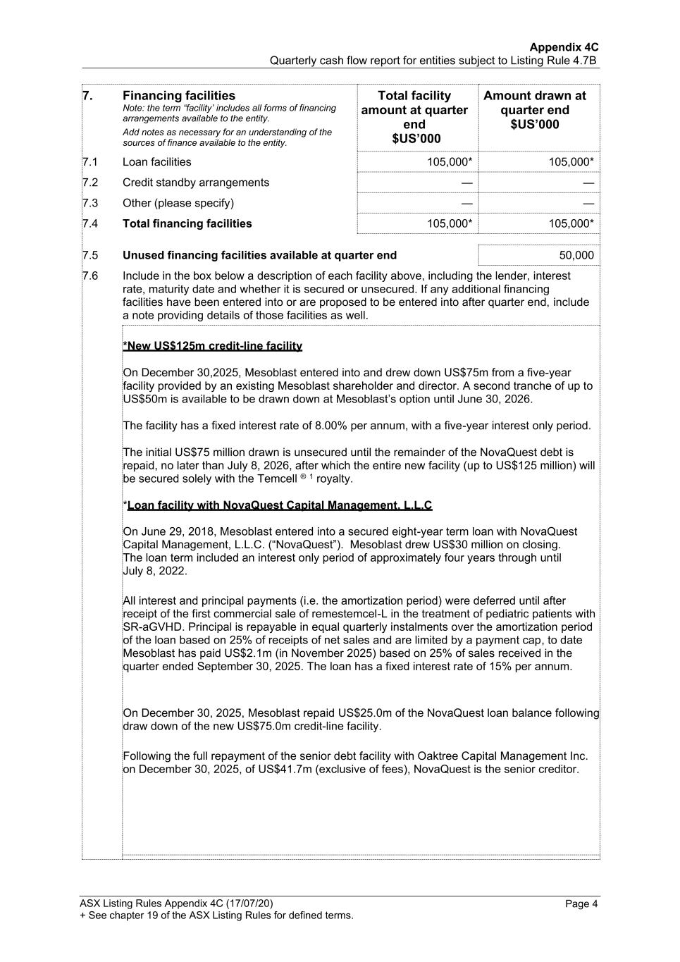 Appendix 4C Quarterly cash flow report for entities subject to Listing Rule 4.7B ASX Listing Rules Appendix 4C (17/07/20) + See chapter 19 of the ASX Listing Rules for defined terms. Page 4 7. Financing facilities Note: the term “facility’ includes all forms of financing arrangements available to the entity. Add notes as necessary for an understanding of the sources of finance available to the entity. Total facility amount at quarter end $US’000 Amount drawn at quarter end $US’000 7.1 Loan facilities 105,000* 105,000* 7.2 Credit standby arrangements — — 7.3 Other (please specify) — — 7.4 Total financing facilities 105,000* 105,000* 7.5 Unused financing facilities available at quarter end 50,000 7.6 Include in the box below a description of each facility above, including the lender, interest rate, maturity date and whether it is secured or unsecured. If any additional financing facilities have been entered into or are proposed to be entered into after quarter end, include a note providing details of those facilities as well. *New US$125m credit-line facility On December 30,2025, Mesoblast entered into and drew down US$75m from a five-year facility provided by an existing Mesoblast shareholder and director. A second tranche of up to US$50m is available to be drawn down at Mesoblast’s option until June 30, 2026. The facility has a fixed interest rate of 8.00% per annum, with a five-year interest only period. The initial US$75 million drawn is unsecured until the remainder of the NovaQuest debt is repaid, no later than July 8, 2026, after which the entire new facility (up to US$125 million) will be secured solely with the Temcell ® 1 royalty. *Loan facility with NovaQuest Capital Management, L.L.C On June 29, 2018, Mesoblast entered into a secured eight-year term loan with NovaQuest Capital Management, L.L.C. (“NovaQuest”). Mesoblast drew US$30 million on closing. The loan term included an interest only period of approximately four years through until July 8, 2022. All interest and principal payments (i.e. the amortization period) were deferred until after receipt of the first commercial sale of remestemcel-L in the treatment of pediatric patients with SR-aGVHD. Principal is repayable in equal quarterly instalments over the amortization period of the loan based on 25% of receipts of net sales and are limited by a payment cap, to date Mesoblast has paid US$2.1m (in November 2025) based on 25% of sales received in the quarter ended September 30, 2025. The loan has a fixed interest rate of 15% per annum. On December 30, 2025, Mesoblast repaid US$25.0m of the NovaQuest loan balance following draw down of the new US$75.0m credit-line facility. Following the full repayment of the senior debt facility with Oaktree Capital Management Inc. on December 30, 2025, of US$41.7m (exclusive of fees), NovaQuest is the senior creditor.