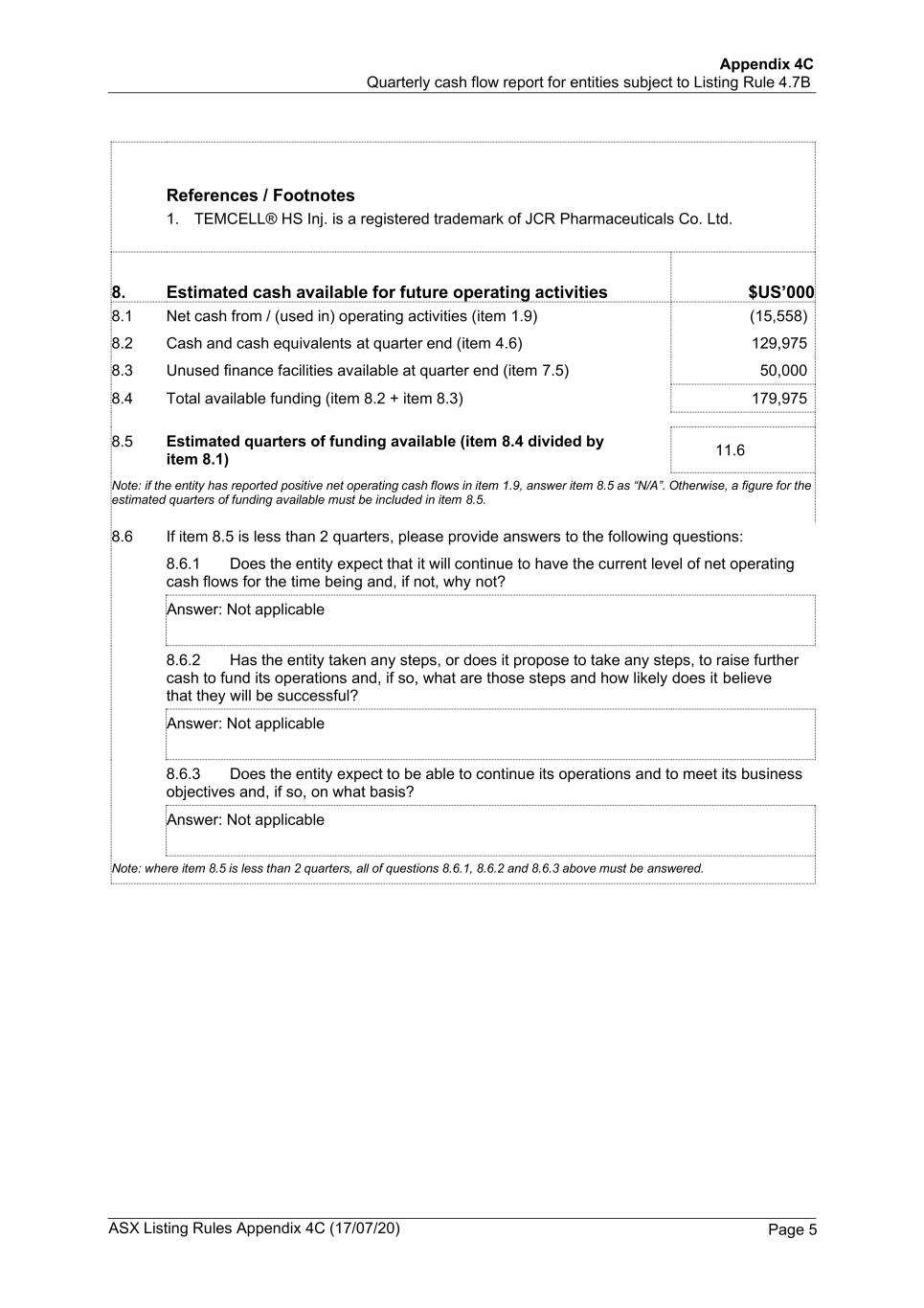 Appendix 4C Quarterly cash flow report for entities subject to Listing Rule 4.7B ASX Listing Rules Appendix 4C (17/07/20) + See chapter 19 of the ASX Listing Rules for defined terms. Page 5 References / Footnotes 1. TEMCELL® HS Inj. is a registered trademark of JCR Pharmaceuticals Co. Ltd. 8. Estimated cash available for future operating activities $US’000 8.1 Net cash from / (used in) operating activities (item 1.9) (15,558) 8.2 Cash and cash equivalents at quarter end (item 4.6) 129,975 8.3 Unused finance facilities available at quarter end (item 7.5) 50,000 8.4 Total available funding (item 8.2 + item 8.3) 179,975 8.5 Estimated quarters of funding available (item 8.4 divided by item 8.1) 11.6 Note: if the entity has reported positive net operating cash flows in item 1.9, answer item 8.5 as “N/A”. Otherwise, a figure for the estimated quarters of funding available must be included in item 8.5. 8.6 If item 8.5 is less than 2 quarters, please provide answers to the following questions: 8.6.1 Does the entity expect that it will continue to have the current level of net operating cash flows for the time being and, if not, why not? Answer: Not applicable 8.6.2 Has the entity taken any steps, or does it propose to take any steps, to raise further cash to fund its operations and, if so, what are those steps and how likely does it believe that they will be successful? Answer: Not applicable 8.6.3 Does the entity expect to be able to continue its operations and to meet its business objectives and, if so, on what basis? Answer: Not applicable Note: where item 8.5 is less than 2 quarters, all of questions 8.6.1, 8.6.2 and 8.6.3 above must be answered.