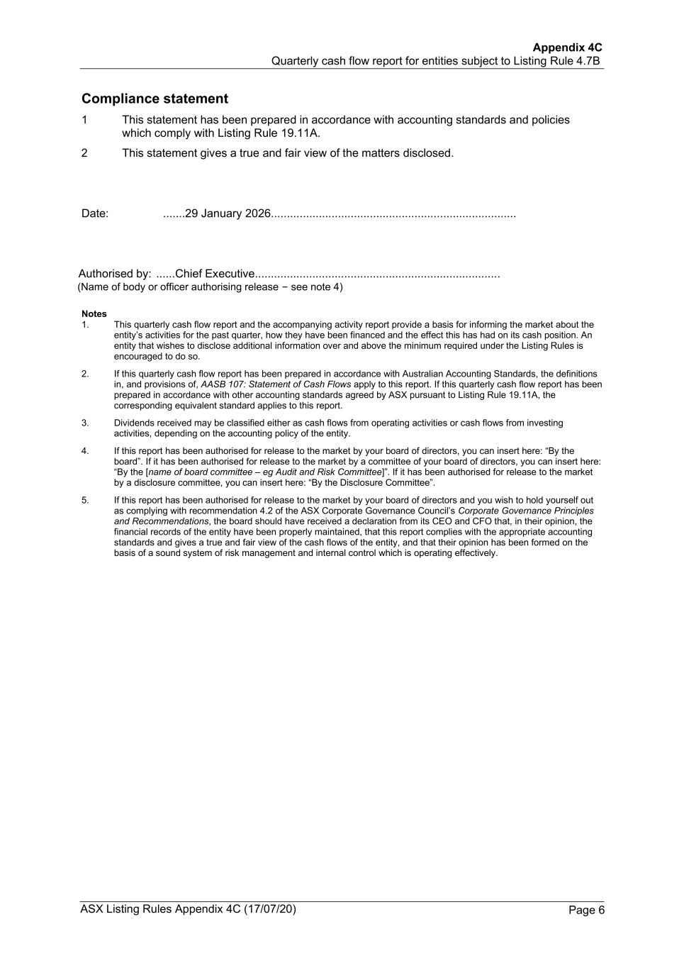 Appendix 4C Quarterly cash flow report for entities subject to Listing Rule 4.7B ASX Listing Rules Appendix 4C (17/07/20) + See chapter 19 of the ASX Listing Rules for defined terms. Page 6 Compliance statement 1 This statement has been prepared in accordance with accounting standards and policies which comply with Listing Rule 19.11A. 2 This statement gives a true and fair view of the matters disclosed. Date: .......29 January 2026............................................................................. Authorised by: ......Chief Executive............................................................................. (Name of body or officer authorising release – see note 4) Notes 1. This quarterly cash flow report and the accompanying activity report provide a basis for informing the market about the entity’s activities for the past quarter, how they have been financed and the effect this has had on its cash position. An entity that wishes to disclose additional information over and above the minimum required under the Listing Rules is encouraged to do so. 2. If this quarterly cash flow report has been prepared in accordance with Australian Accounting Standards, the definitions in, and provisions of, AASB 107: Statement of Cash Flows apply to this report. If this quarterly cash flow report has been prepared in accordance with other accounting standards agreed by ASX pursuant to Listing Rule 19.11A, the corresponding equivalent standard applies to this report. 3. Dividends received may be classified either as cash flows from operating activities or cash flows from investing activities, depending on the accounting policy of the entity. 4. If this report has been authorised for release to the market by your board of directors, you can insert here: “By the board”. If it has been authorised for release to the market by a committee of your board of directors, you can insert here: “By the [name of board committee – eg Audit and Risk Committee]”. If it has been authorised for release to the market by a disclosure committee, you can insert here: “By the Disclosure Committee”. 5. If this report has been authorised for release to the market by your board of directors and you wish to hold yourself out as complying with recommendation 4.2 of the ASX Corporate Governance Council’s Corporate Governance Principles and Recommendations, the board should have received a declaration from its CEO and CFO that, in their opinion, the financial records of the entity have been properly maintained, that this report complies with the appropriate accounting standards and gives a true and fair view of the cash flows of the entity, and that their opinion has been formed on the basis of a sound system of risk management and internal control which is operating effectively.