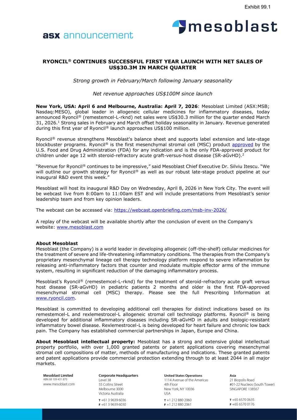 RYONCIL® CONTINUES SUCCESSFUL FIRST YEAR LAUNCH WITH NET SALES OF US$30.3M IN MARCH QUARTER Strong growth in February/March following January seasonality Net revenue approaches US$100M since launch New York, USA: April 6 and Melbourne, Australia: April 7, 2026: Mesoblast Limited (ASX:MSB; Nasdaq:MESO), global leader in allogeneic cellular medicines for inflammatory diseases, today announced Ryoncil® (remestemcel-L-rknd) net sales were US$30.3 million for the quarter ended March 31, 2026.1 Strong sales in February and March offset holiday seasonality in January. Revenue generated during this first year of Ryoncil® launch approaches US$100 million. Ryoncil® revenue strengthens Mesoblast's balance sheet and supports label extension and late-stage blockbuster programs. Ryoncil® is the first mesenchymal stromal cell (MSC) product approved by the U.S. Food and Drug Administration (FDA) for any indication and is the only FDA-approved product for children under age 12 with steroid-refractory acute graft-versus-host disease (SR-aGvHD).2 “Revenue for Ryoncil® continues to be impressive,” said Mesoblast Chief Executive Dr. Silviu Itescu. “We will outline our growth strategy for Ryoncil® as well as our robust late-stage product pipeline at our inaugural R&D event this week.” Mesoblast will host its inaugural R&D Day on Wednesday, April 8, 2026 in New York City. The event will be webcast live from 8:00am to 11:00am EST and will include presentations from Mesoblast’s senior leadership team and from key opinion leaders. The webcast can be accessed via: https://webcast.openbriefing.com/msb-inv-2026/ A replay of the webcast will be available shortly after the conclusion of event on the Company’s website: www.mesoblast.com About Mesoblast Mesoblast (the Company) is a world leader in developing allogeneic (off-the-shelf) cellular medicines for the treatment of severe and life-threatening inflammatory conditions. The therapies from the Company’s proprietary mesenchymal lineage cell therapy technology platform respond to severe inflammation by releasing anti-inflammatory factors that counter and modulate multiple effector arms of the immune system, resulting in significant reduction of the damaging inflammatory process. Mesoblast’s Ryoncil® (remestemcel-L-rknd) for the treatment of steroid-refractory acute graft versus host disease (SR-aGvHD) in pediatric patients 2 months and older is the first FDA-approved mesenchymal stromal cell (MSC) therapy. Please see the full Prescribing Information at www.ryoncil.com. Mesoblast is committed to developing additional cell therapies for distinct indications based on its remestemcel-L and rexlemestrocel-L allogeneic stromal cell technology platforms. Ryoncil® is being developed for additional inflammatory diseases including SR-aGvHD in adults and biologic-resistant inflammatory bowel disease. Rexlemestrocel-L is being developed for heart failure and chronic low back pain. The Company has established commercial partnerships in Japan, Europe and China. About Mesoblast intellectual property: Mesoblast has a strong and extensive global intellectual property portfolio, with over 1,000 granted patents or patent applications covering mesenchymal stromal cell compositions of matter, methods of manufacturing and indications. These granted patents and patent applications provide commercial protection extending through to at least 2044 in all major markets.