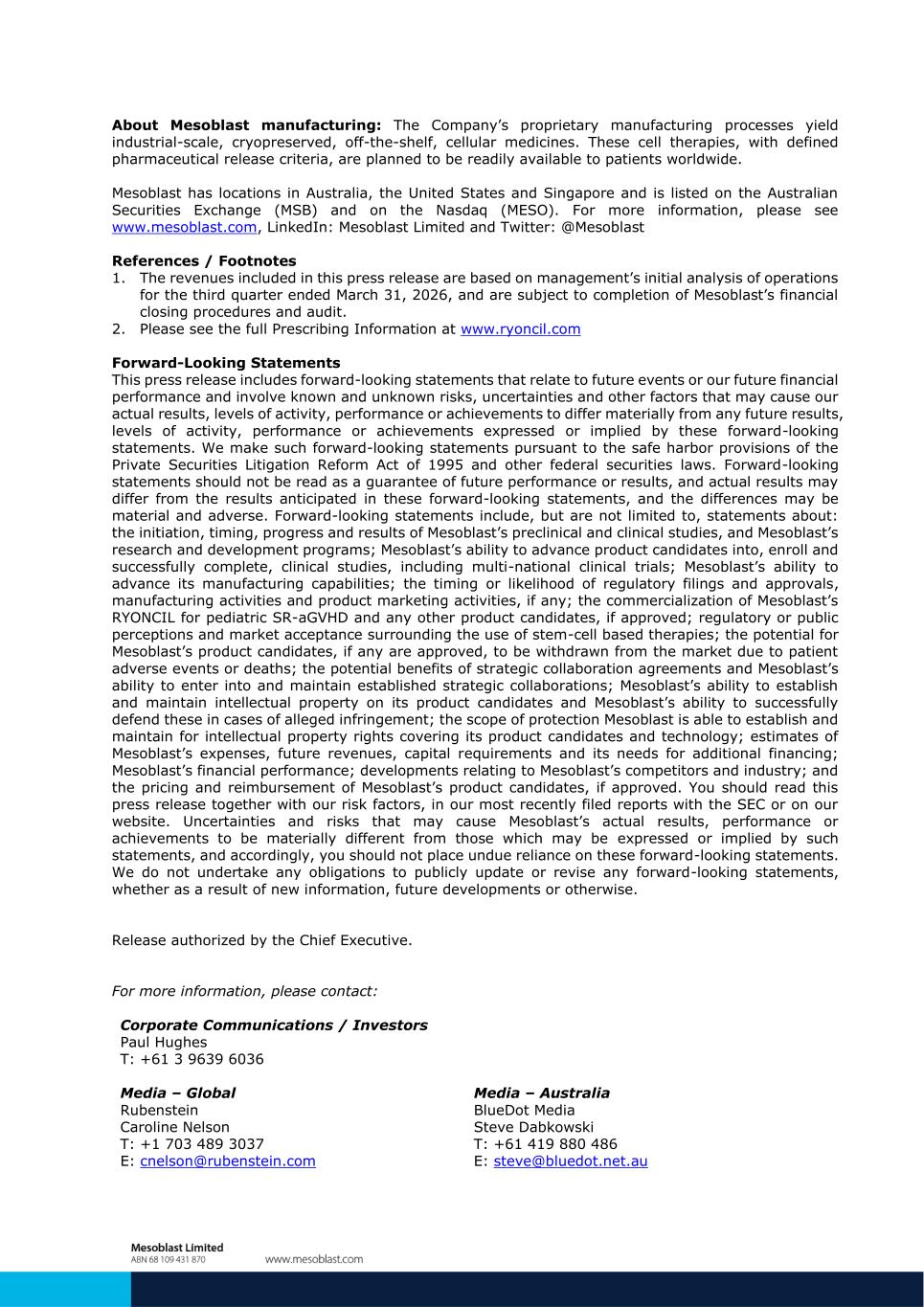 About Mesoblast manufacturing: The Company’s proprietary manufacturing processes yield industrial-scale, cryopreserved, off-the-shelf, cellular medicines. These cell therapies, with defined pharmaceutical release criteria, are planned to be readily available to patients worldwide. Mesoblast has locations in Australia, the United States and Singapore and is listed on the Australian Securities Exchange (MSB) and on the Nasdaq (MESO). For more information, please see www.mesoblast.com, LinkedIn: Mesoblast Limited and Twitter: @Mesoblast References / Footnotes 1. The revenues included in this press release are based on management’s initial analysis of operations for the third quarter ended March 31, 2026, and are subject to completion of Mesoblast’s financial closing procedures and audit. 2. Please see the full Prescribing Information at www.ryoncil.com Forward-Looking Statements This press release includes forward-looking statements that relate to future events or our future financial performance and involve known and unknown risks, uncertainties and other factors that may cause our actual results, levels of activity, performance or achievements to differ materially from any future results, levels of activity, performance or achievements expressed or implied by these forward-looking statements. We make such forward-looking statements pursuant to the safe harbor provisions of the Private Securities Litigation Reform Act of 1995 and other federal securities laws. Forward-looking statements should not be read as a guarantee of future performance or results, and actual results may differ from the results anticipated in these forward-looking statements, and the differences may be material and adverse. Forward-looking statements include, but are not limited to, statements about: the initiation, timing, progress and results of Mesoblast’s preclinical and clinical studies, and Mesoblast’s research and development programs; Mesoblast’s ability to advance product candidates into, enroll and successfully complete, clinical studies, including multi-national clinical trials; Mesoblast’s ability to advance its manufacturing capabilities; the timing or likelihood of regulatory filings and approvals, manufacturing activities and product marketing activities, if any; the commercialization of Mesoblast’s RYONCIL for pediatric SR-aGVHD and any other product candidates, if approved; regulatory or public perceptions and market acceptance surrounding the use of stem-cell based therapies; the potential for Mesoblast’s product candidates, if any are approved, to be withdrawn from the market due to patient adverse events or deaths; the potential benefits of strategic collaboration agreements and Mesoblast’s ability to enter into and maintain established strategic collaborations; Mesoblast’s ability to establish and maintain intellectual property on its product candidates and Mesoblast’s ability to successfully defend these in cases of alleged infringement; the scope of protection Mesoblast is able to establish and maintain for intellectual property rights covering its product candidates and technology; estimates of Mesoblast’s expenses, future revenues, capital requirements and its needs for additional financing; Mesoblast’s financial performance; developments relating to Mesoblast’s competitors and industry; and the pricing and reimbursement of Mesoblast’s product candidates, if approved. You should read this press release together with our risk factors, in our most recently filed reports with the SEC or on our website. Uncertainties and risks that may cause Mesoblast’s actual results, performance or achievements to be materially different from those which may be expressed or implied by such statements, and accordingly, you should not place undue reliance on these forward-looking statements. We do not undertake any obligations to publicly update or revise any forward-looking statements, whether as a result of new information, future developments or otherwise. Release authorized by the Chief Executive. For more information, please contact: Corporate Communications / Investors Paul Hughes T: +61 3 9639 6036 Media – Global Media – Australia Rubenstein BlueDot Media Caroline Nelson Steve Dabkowski T: +1 703 489 3037 T: +61 419 880 486 E: cnelson@rubenstein.com E: steve@bluedot.net.au