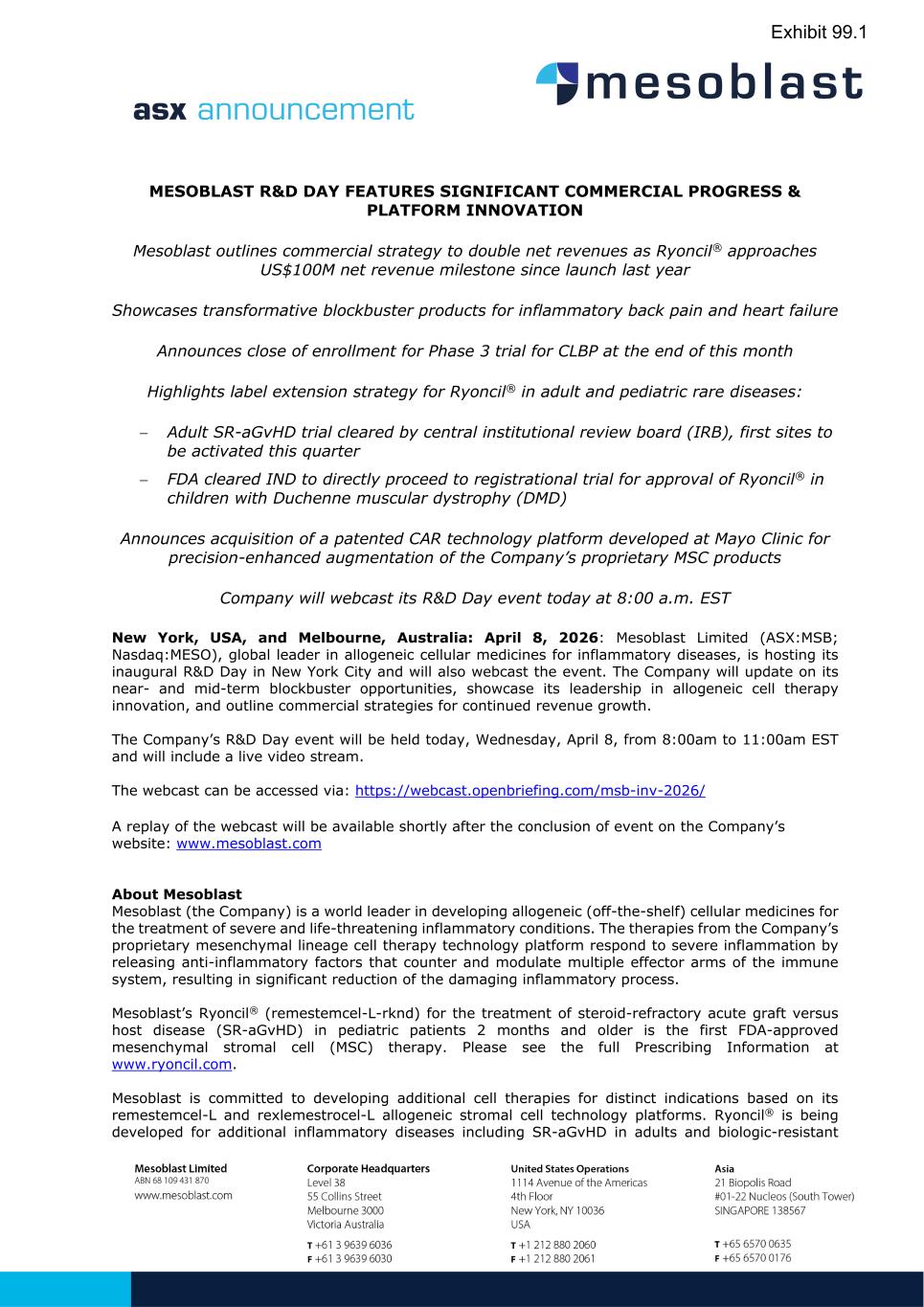 MESOBLAST R&D DAY FEATURES SIGNIFICANT COMMERCIAL PROGRESS & PLATFORM INNOVATION Mesoblast outlines commercial strategy to double net revenues as Ryoncil® approaches US$100M net revenue milestone since launch last year Showcases transformative blockbuster products for inflammatory back pain and heart failure Announces close of enrollment for Phase 3 trial for CLBP at the end of this month Highlights label extension strategy for Ryoncil® in adult and pediatric rare diseases: − Adult SR-aGvHD trial cleared by central institutional review board (IRB), first sites to be activated this quarter − FDA cleared IND to directly proceed to registrational trial for approval of Ryoncil® in children with Duchenne muscular dystrophy (DMD) Announces acquisition of a patented CAR technology platform developed at Mayo Clinic for precision-enhanced augmentation of the Company’s proprietary MSC products Company will webcast its R&D Day event today at 8:00 a.m. EST New York, USA, and Melbourne, Australia: April 8, 2026: Mesoblast Limited (ASX:MSB; Nasdaq:MESO), global leader in allogeneic cellular medicines for inflammatory diseases, is hosting its inaugural R&D Day in New York City and will also webcast the event. The Company will update on its near- and mid-term blockbuster opportunities, showcase its leadership in allogeneic cell therapy innovation, and outline commercial strategies for continued revenue growth. The Company’s R&D Day event will be held today, Wednesday, April 8, from 8:00am to 11:00am EST and will include a live video stream. The webcast can be accessed via: https://webcast.openbriefing.com/msb-inv-2026/ A replay of the webcast will be available shortly after the conclusion of event on the Company’s website: www.mesoblast.com About Mesoblast Mesoblast (the Company) is a world leader in developing allogeneic (off-the-shelf) cellular medicines for the treatment of severe and life-threatening inflammatory conditions. The therapies from the Company’s proprietary mesenchymal lineage cell therapy technology platform respond to severe inflammation by releasing anti-inflammatory factors that counter and modulate multiple effector arms of the immune system, resulting in significant reduction of the damaging inflammatory process. Mesoblast’s Ryoncil® (remestemcel-L-rknd) for the treatment of steroid-refractory acute graft versus host disease (SR-aGvHD) in pediatric patients 2 months and older is the first FDA-approved mesenchymal stromal cell (MSC) therapy. Please see the full Prescribing Information at www.ryoncil.com. Mesoblast is committed to developing additional cell therapies for distinct indications based on its remestemcel-L and rexlemestrocel-L allogeneic stromal cell technology platforms. Ryoncil® is being developed for additional inflammatory diseases including SR-aGvHD in adults and biologic-resistant