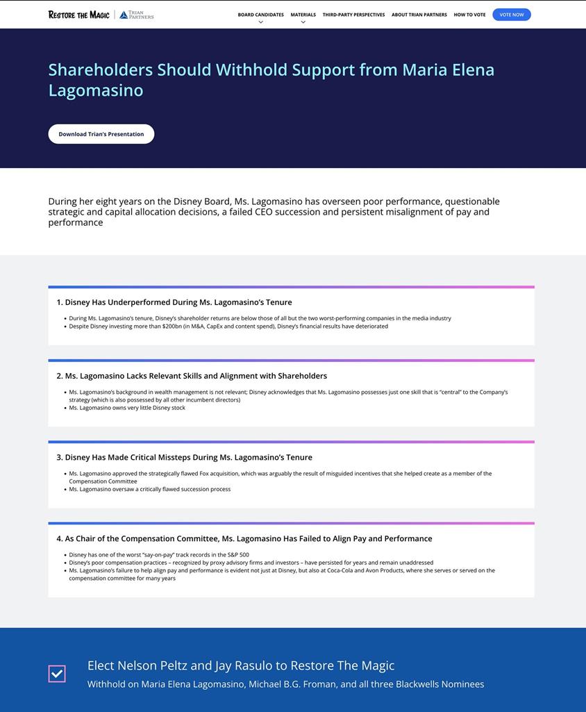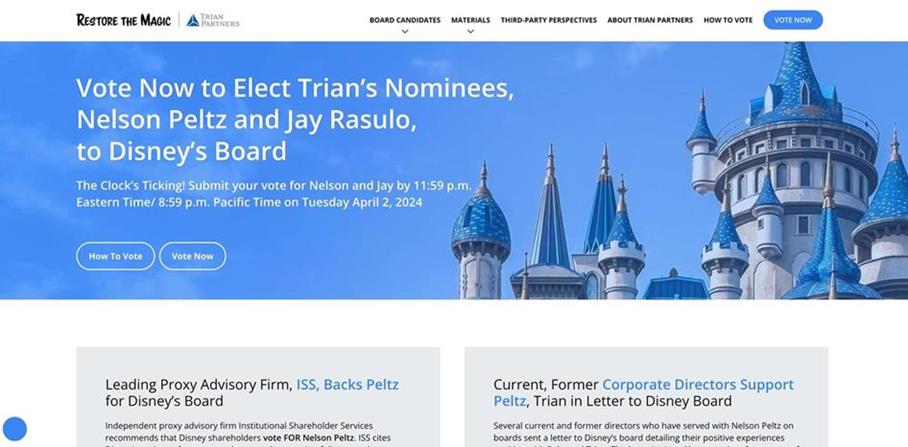 From time to time, Trian Fund Management, L.P., in connection with its solicitation of proxies for the 2024 annual meeting of shareholders of The Walt Disney Company (the “Company”), may publish the material filed herewith as Exhibit 1 (the “Website Material”), or portions thereof, to its website, www.RestoretheMagic.com, or to its X (formerly known as Twitter), LinkedIn, Facebook, Instagram, Reddit and YouTube pages or various other social media channels, or may otherwise disseminate the Website Material to the Company’s shareholders.