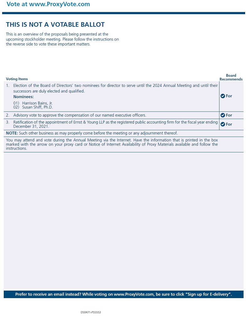 Vote at www.ProxyVote.com THIS IS NOT A VOTABLE BALLOT This is an overview of the proposals being presented at the upcoming stockholder meeting. Please follow the instructions on the reverse side to vote these important matters. Board Recommends Voting Items D50471-P55553 Prefer to receive an email instead? While voting on www.ProxyVote.com, be sure to click “Sign up for E-delivery”. 1. Election of the Board of Directors’ two nominees for director to serve until the 2024 Annual Meeting and until their successors are duly elected and qualified. Nominees: 01) Harrison Bains, Jr. 02) Susan Shiff, Ph.D. For 2. Advisory vote to approve the compensation of our named executive officers. For 3. Ratification of the appointment of Ernst & Young LLP as the registered public accounting firm for the fiscal year ending December 31, 2021. For NOTE: Such other business as may properly come before the meeting or any adjournment thereof. You may attend and vote during the Annual Meeting via the Internet. Have the information that is printed in the box marked with the arrow on your proxy card or Notice of Internet Availability of Proxy Materials available and follow the instructions. Prefer to receive an email instead? While voting on www.ProxyVote.com, be sure to click “Sign up for E-delivery”.