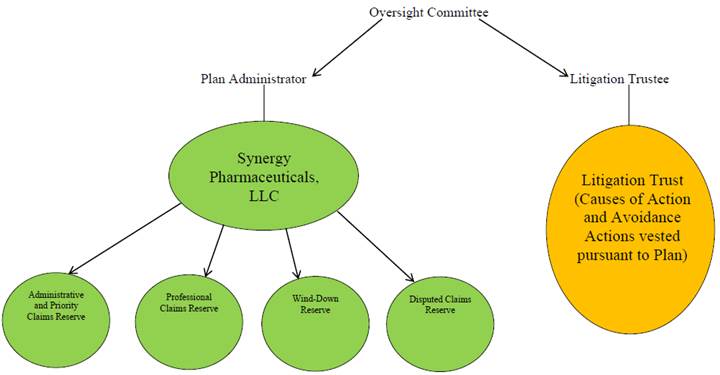 Debtor Affiliate [Docket No. 267] and the Amended Disclosure Statement for the Amended Joint Plan of Reorganization of Synergy Pharmaceuticals Inc. and Its Debtor Affiliate [Docket No. 269]. On February 28, 2019, the Debtors filed the Second Amended Joint Plan of Reorganization of Synergy Pharmaceuticals Inc. and Its Debtor Affiliate [Docket No. 474] and the Second Amended Disclosure Statement for the Second Amended Joint Plan of Reorganization of Synergy Pharmaceuticals Inc. and Its Debtor Affiliate [Docket No. 476]. On March 11, 2019, the Debtors filed the Third Amended Joint Plan of Reorganization of Synergy Pharmaceuticals Inc. and Its Debtor Affiliate [Docket No. 516] and the Third Amended Disclosure Statement for the Third Amended Joint Plan of Reorganization of Synergy Pharmaceuticals Inc. and Its Debtor Affiliate [Docket No. 518]. On March 13, 2019, the Debtors filed the solicitation versions of the Third Amended Joint Plan of Reorganization of Synergy Pharmaceuticals Inc. and Its Debtor Affiliate [Docket No. 545] and the Third Amended Disclosure Statement for the Third Amended Joint Plan of Reorganization of Synergy Pharmaceuticals Inc. and Its Debtor Affiliate [Docket No. 546]. On April 18, 2019 the Debtors filed the Fourth Amended Joint Plan of Reorganization of Synergy Pharmaceuticals Inc. and Its Debtor Affiliate [Docket No. 685]. On April 4, 2019, the Debtors filed the Plan Supplement [Docket No. 632], which contained the following documents: (i) the Plan Administrator Agreement; (ii) the Litigation Trust Agreement; (iii) a notice of assumption of Executory Contracts by the Debtors and the Schedule of Assumed Executory Contracts; (iv) amended corporate organization documents, including the certificate of conversion, certificate of formation, and limited liability company agreement for Synergy Pharmaceuticals, LLC; (v) a summary of Retained Causes of Action; (vi) a notice designating the membership of the Oversight Committee; and (vii) the Administrative Claim Request Form. The Plan Supplement was served in the manner set forth in the Affidavit of Service of Ryan