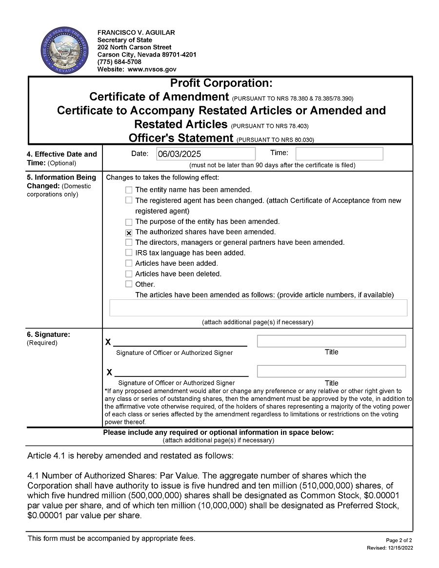 “Upon the effectiveness of the filing (the “Effective Time”) of the Amendment of Restated Articles of Incorporation pursuant to the Chapter 78 of the NRS, each [ ] shares of the Corporation’s Common Stock issued and outstanding immediately prior to the Effective Time shall be reclassified and combined into one (1) validly issued, fully paid and non-assessable share of the Corporation’s Common Stock automatically and without any further action by the Corporation or the holder thereof, subject to the treatment of fractional share interests as described below (the “Reverse Stock Split”). The Corporation shall not issue to any holder a fractional share of Common Stock on account of the Reverse Stock Split. [Rather, any fractional share of Common Stock resulting from such change shall be rounded upward to the nearest whole share of Common Stock. Share interests issued due to rounding are given solely to save the expense and inconvenience of issuing fractional shares of Common Stock and do not represent separately bargained for consideration.][The Corporation shall, in lieu of such fractional share, pay to the holder a sum in cash equal to such fraction multiplied by the closing sales price of the Common Stock as reported on the Nasdaq Capital Market on the last trading day before the Effective Time (as adjusted to give effect to the Reverse Stock Split).] Until surrendered, each certificate that immediately prior to the Effective Time represented shares of Common Stock (“Old Certificates”) shall only represent the number of whole shares of Common Stock into which the shares of Common Stock formerly represented by such Old Certificate were combined into as a result of the Reverse Stock Split.”