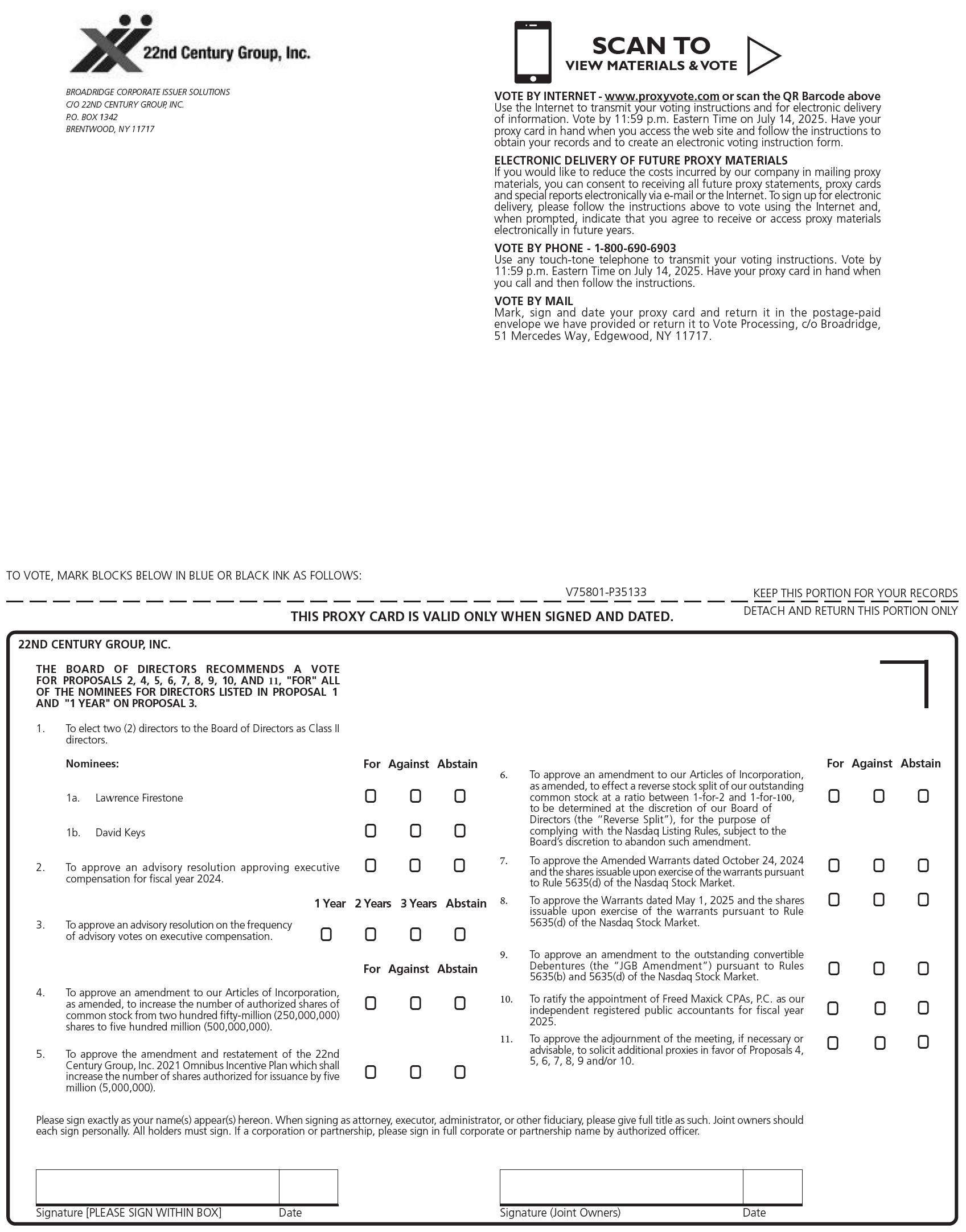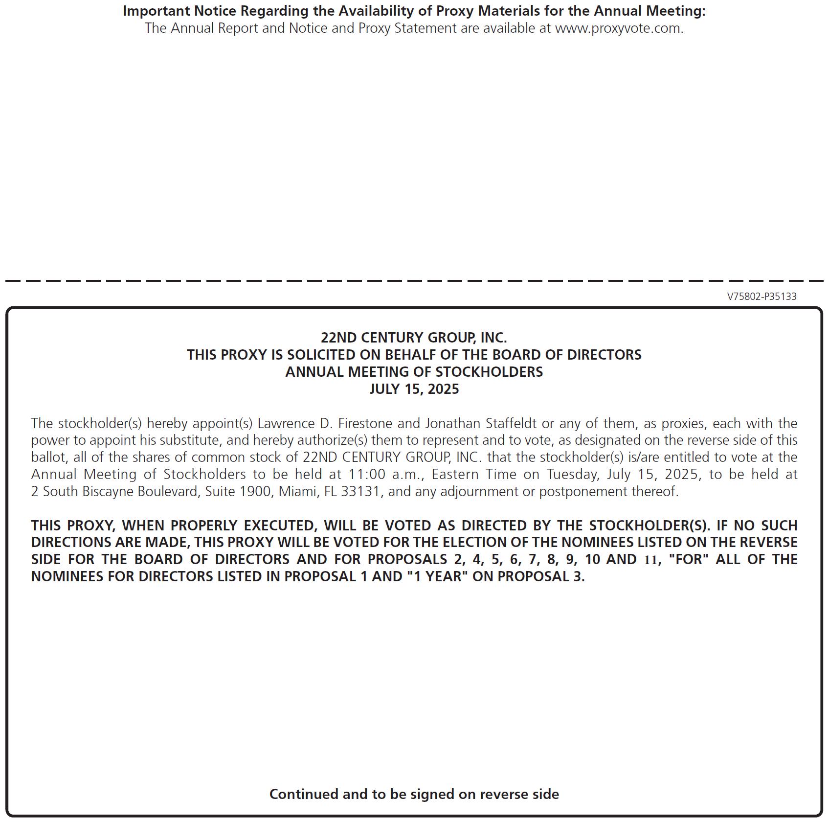 PLEASE TAKE NOTICE that the Annual Meeting of stockholders of 22nd Century Group, Inc. (the “Company”) will be held at 2 South Biscayne Boulevard, Suite 1900, Miami, FL 33131 on Tuesday, July 15, 2025, beginning at 11:00 A.M., Eastern Time.