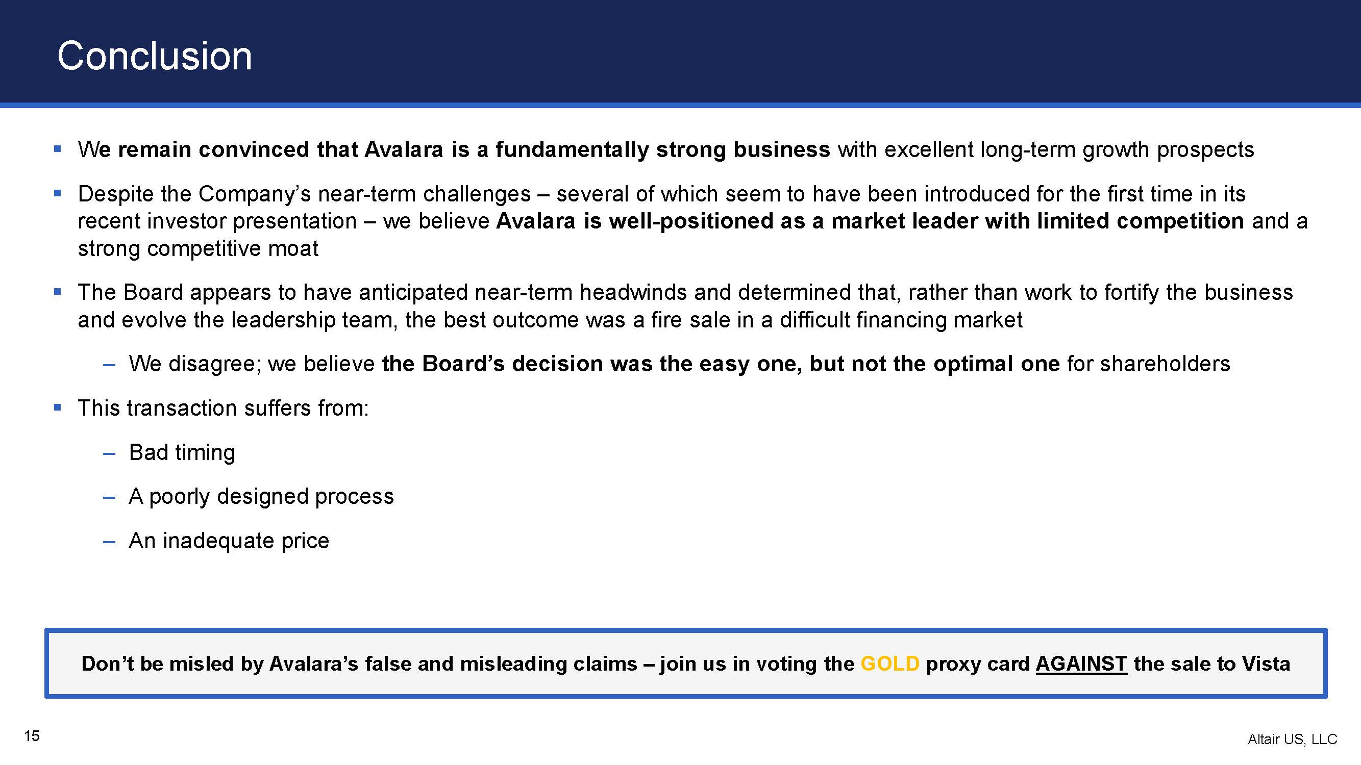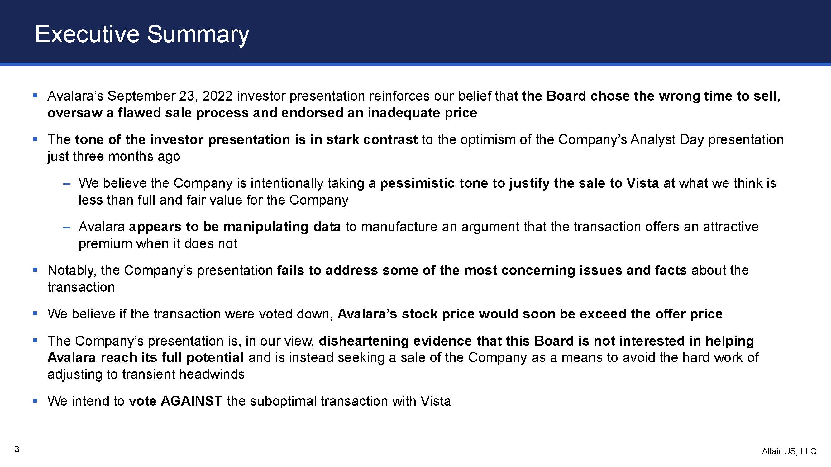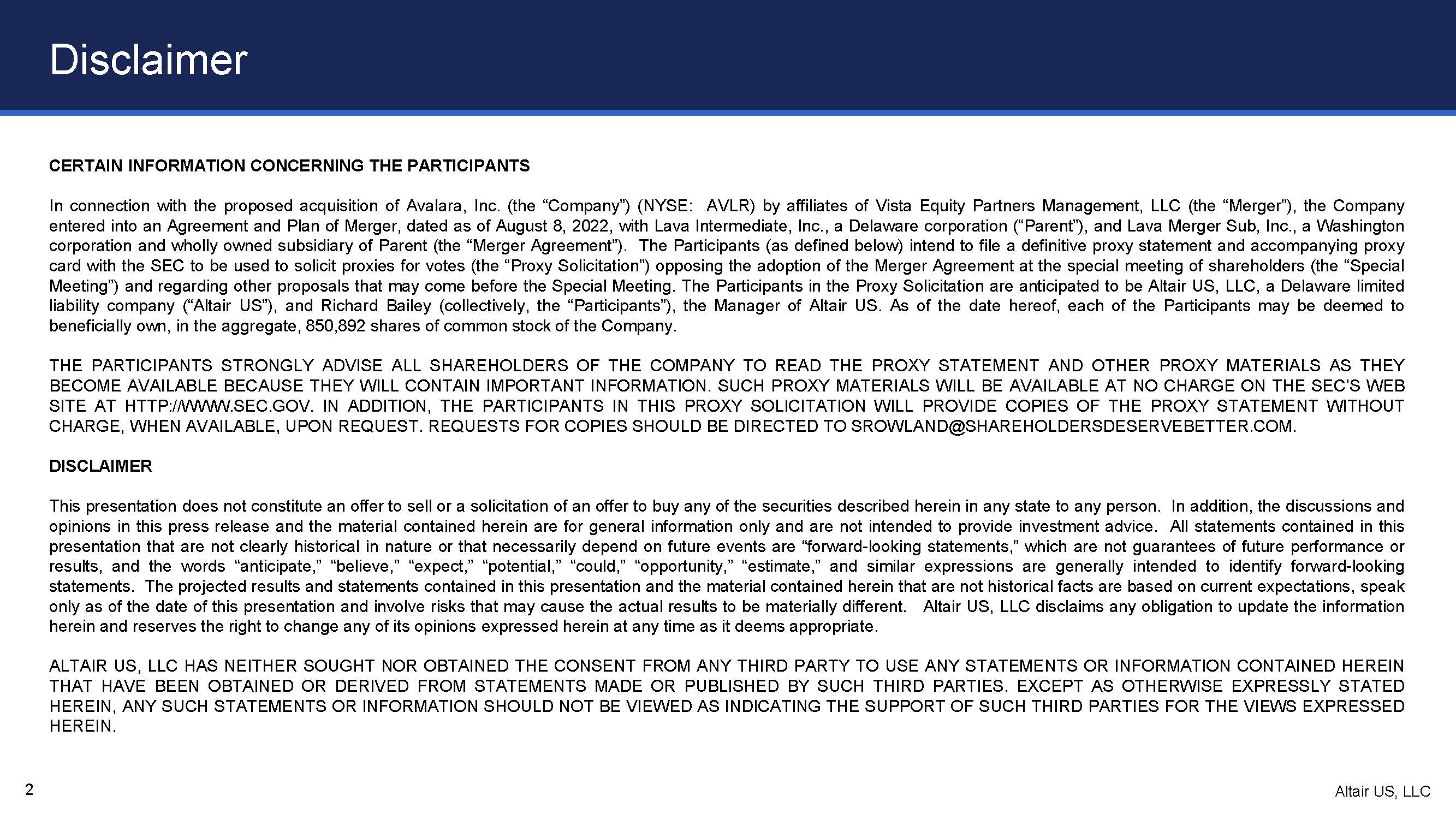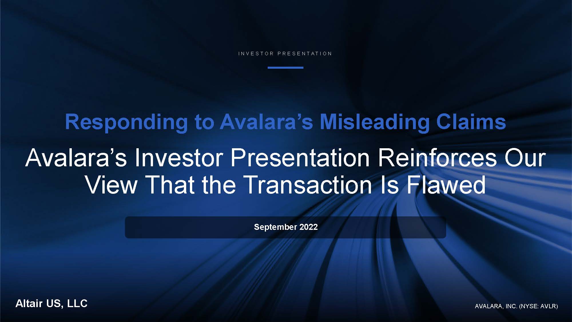 SANTA ROSA, Calif., Sept. 28, 2022 /PRNewswire/ -- Altair US, LLC ("Altair" or "we"), a pre-IPO angel investor in Avalara, Inc. (NYSE: AVLR) (the "Company" or "Avalara") and one of the Company's largest shareholders, today released a presentation in response to Avalara’s recent, disingenuous claims about its proposed sale to Vista Equity Partners (“Vista”). The transaction is subject to a vote of shareholders at the Company’s Special Meeting of Shareholders scheduled to be held on October 14, 2022. We will vote against the transaction.