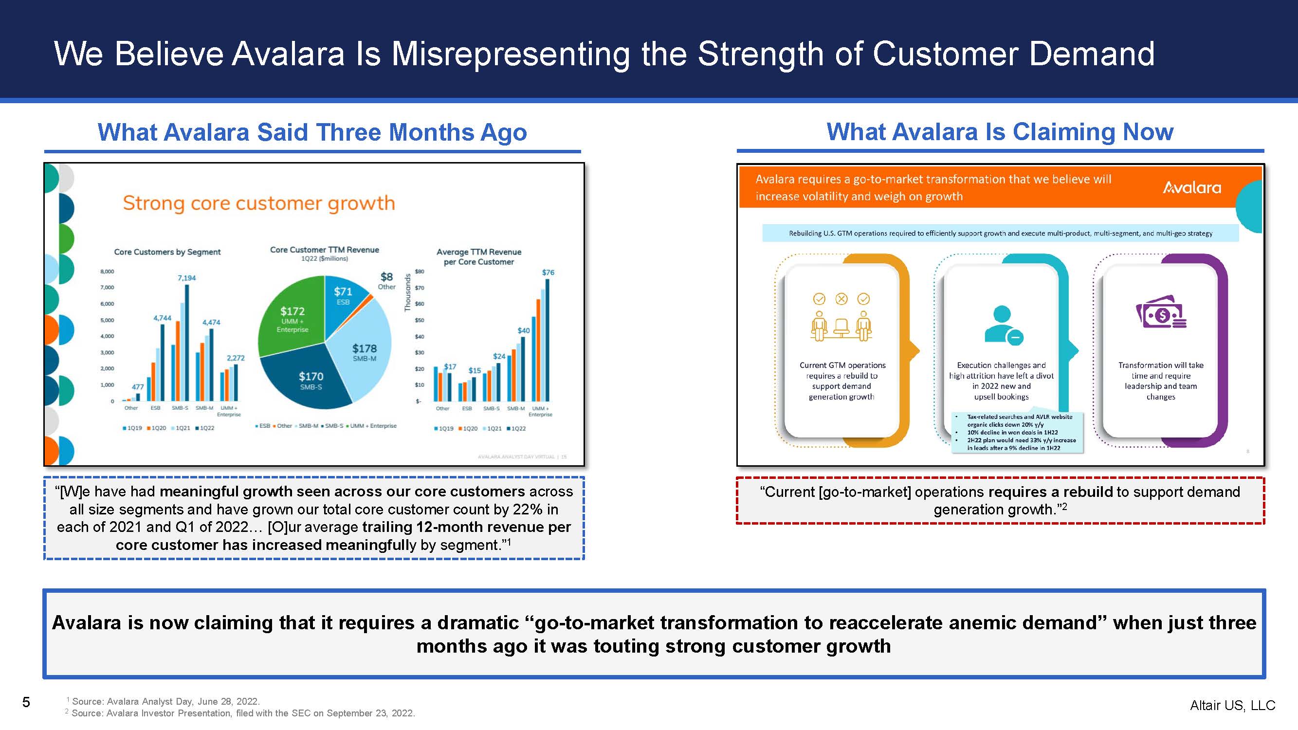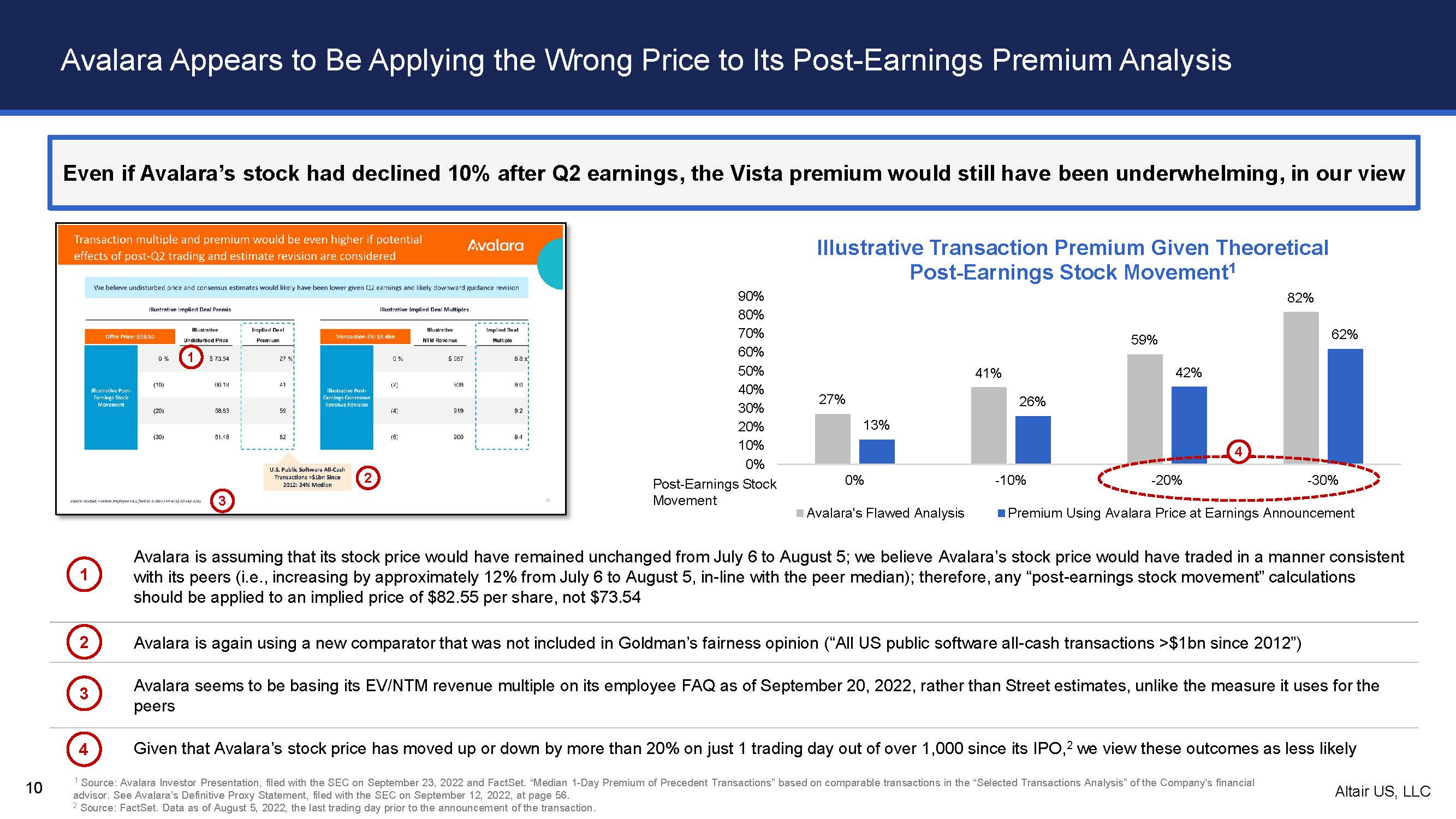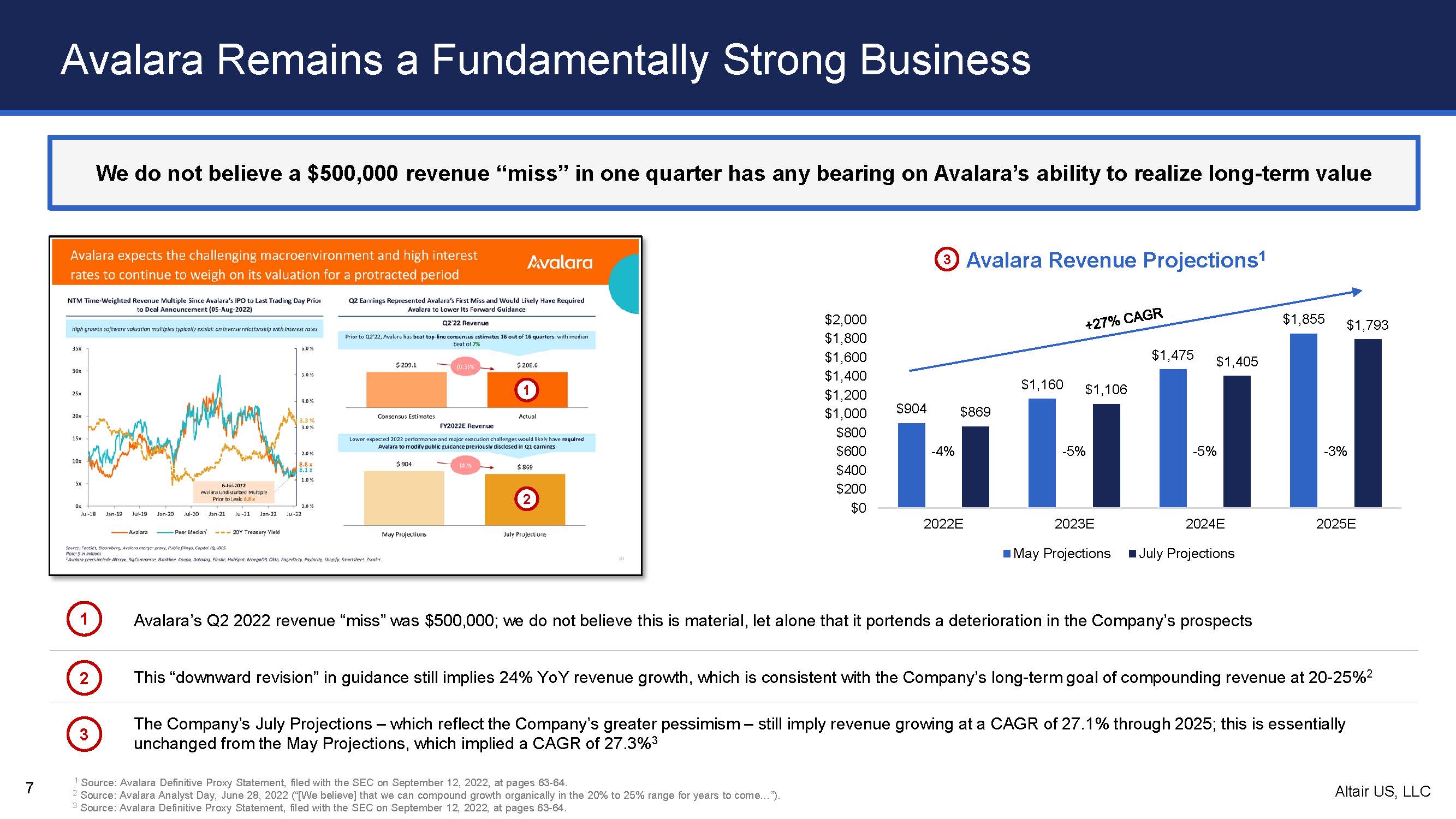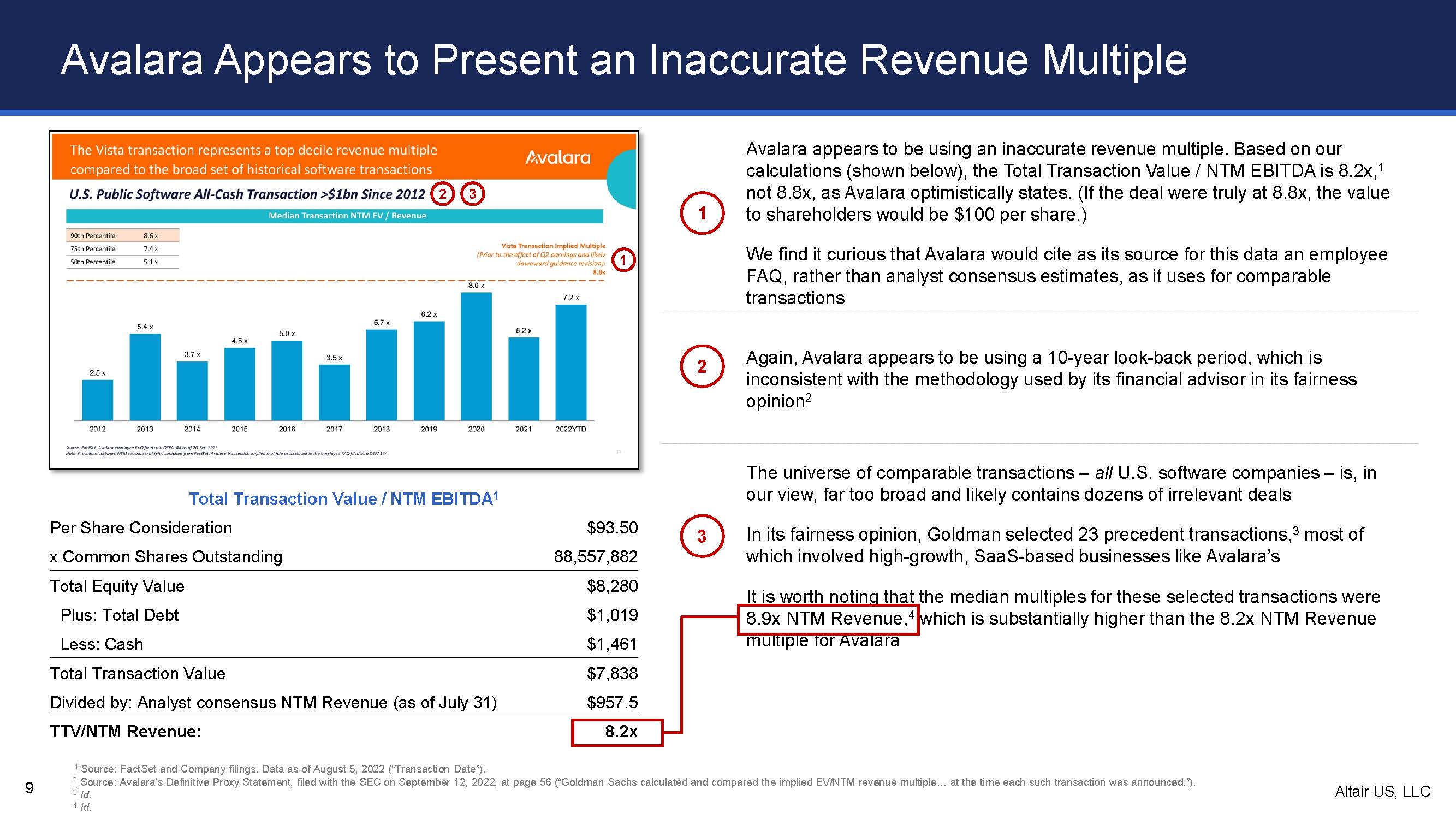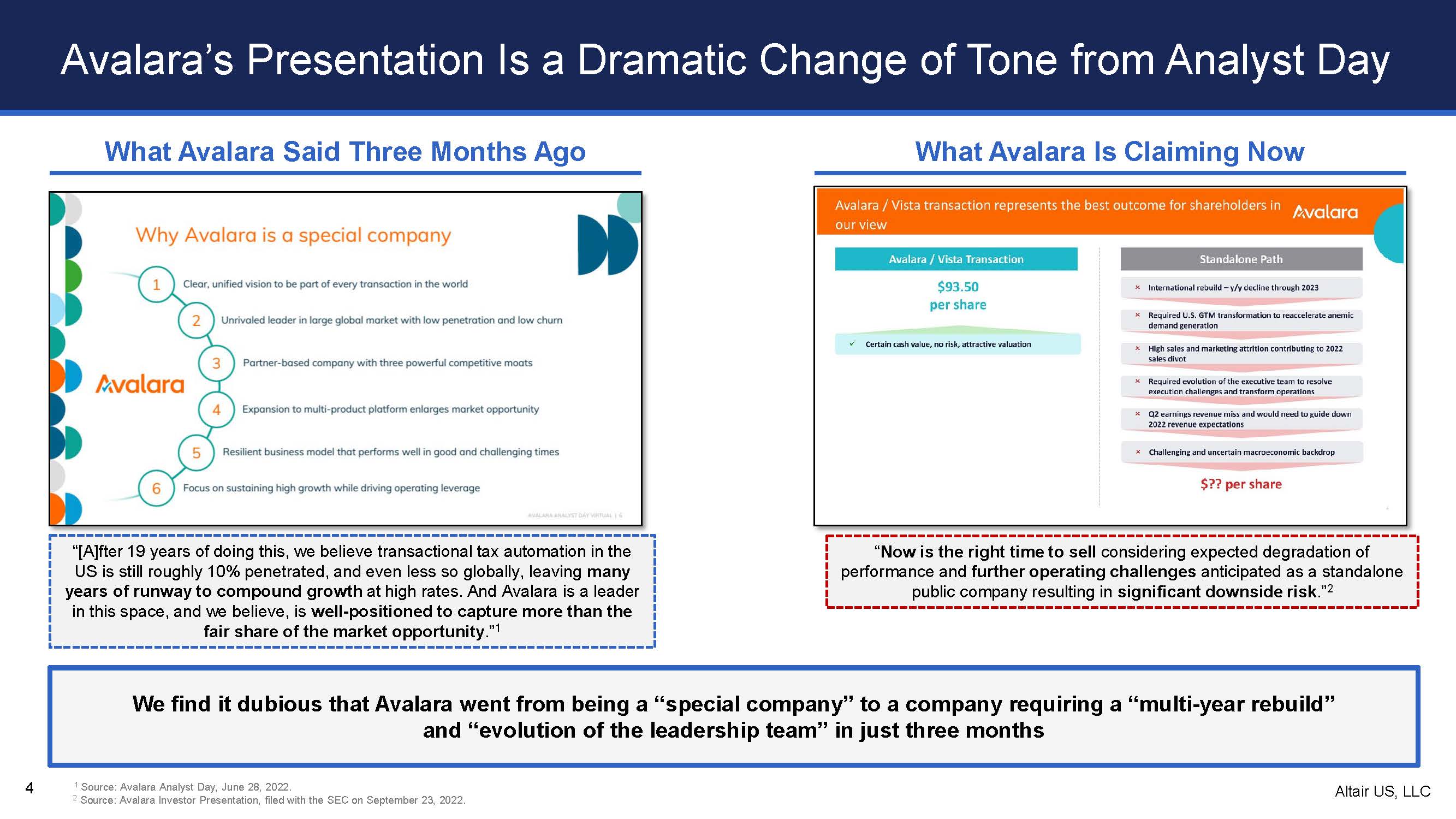 SANTA ROSA, Calif., Sept. 28, 2022 /PRNewswire/ -- Altair US, LLC ("Altair" or "we"), a pre-IPO angel investor in Avalara, Inc. (NYSE: AVLR) (the "Company" or "Avalara") and one of the Company's largest shareholders, today released a presentation in response to Avalara’s recent, disingenuous claims about its proposed sale to Vista Equity Partners (“Vista”). The transaction is subject to a vote of shareholders at the Company’s Special Meeting of Shareholders scheduled to be held on October 14, 2022. We will vote against the transaction.