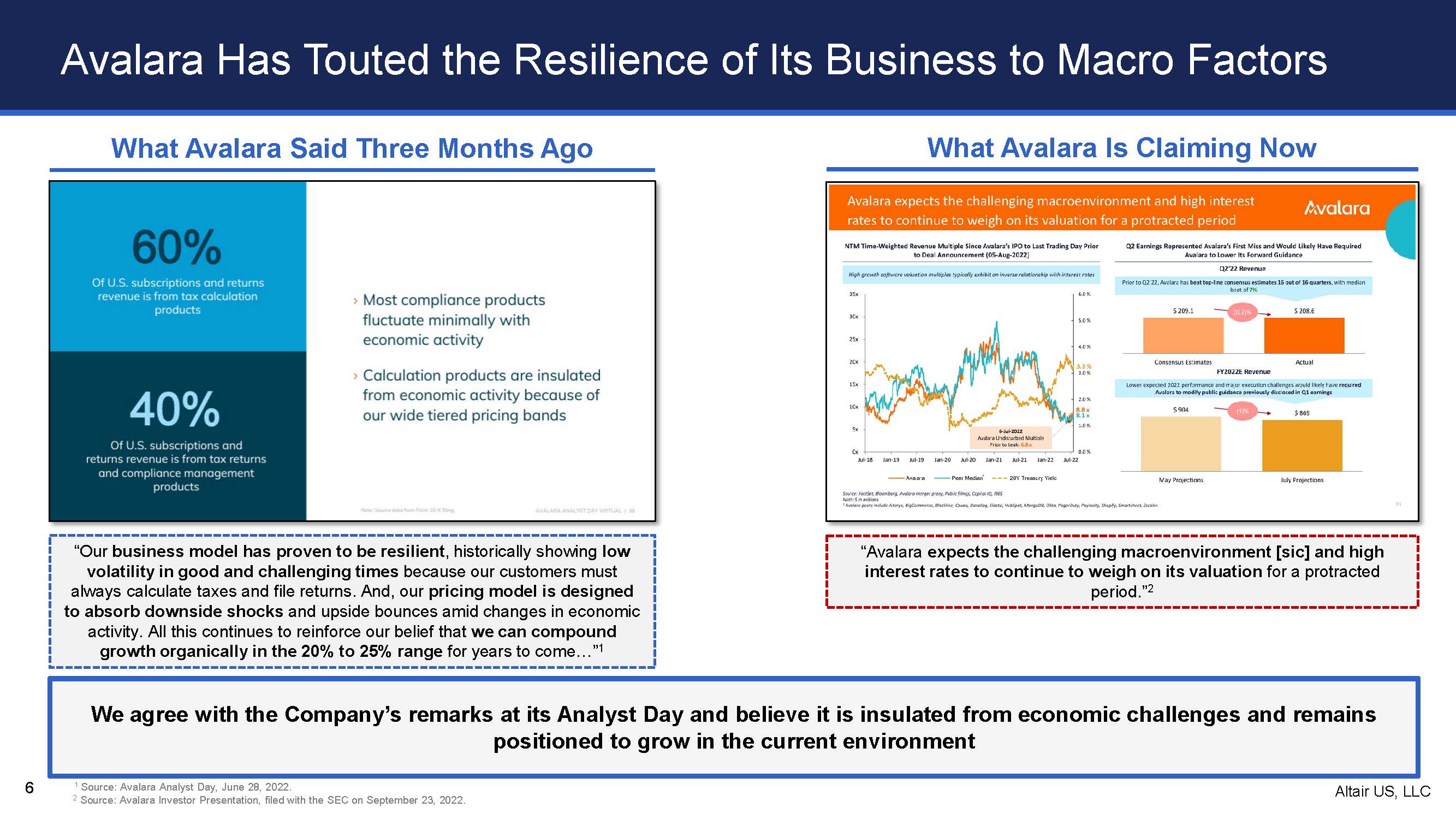 | · | The Company is intentionally taking a pessimistic tone, in stark contrast to the optimism of its Analyst Day presentation just three months ago. We believe there is no urgent need to sell the Company. Avalara has ample cash and a bright future; its near- and long-term prospects are not meaningfully different than they were three months ago when the Company reiterated its belief that Avalara can become part of every transaction in the world. |