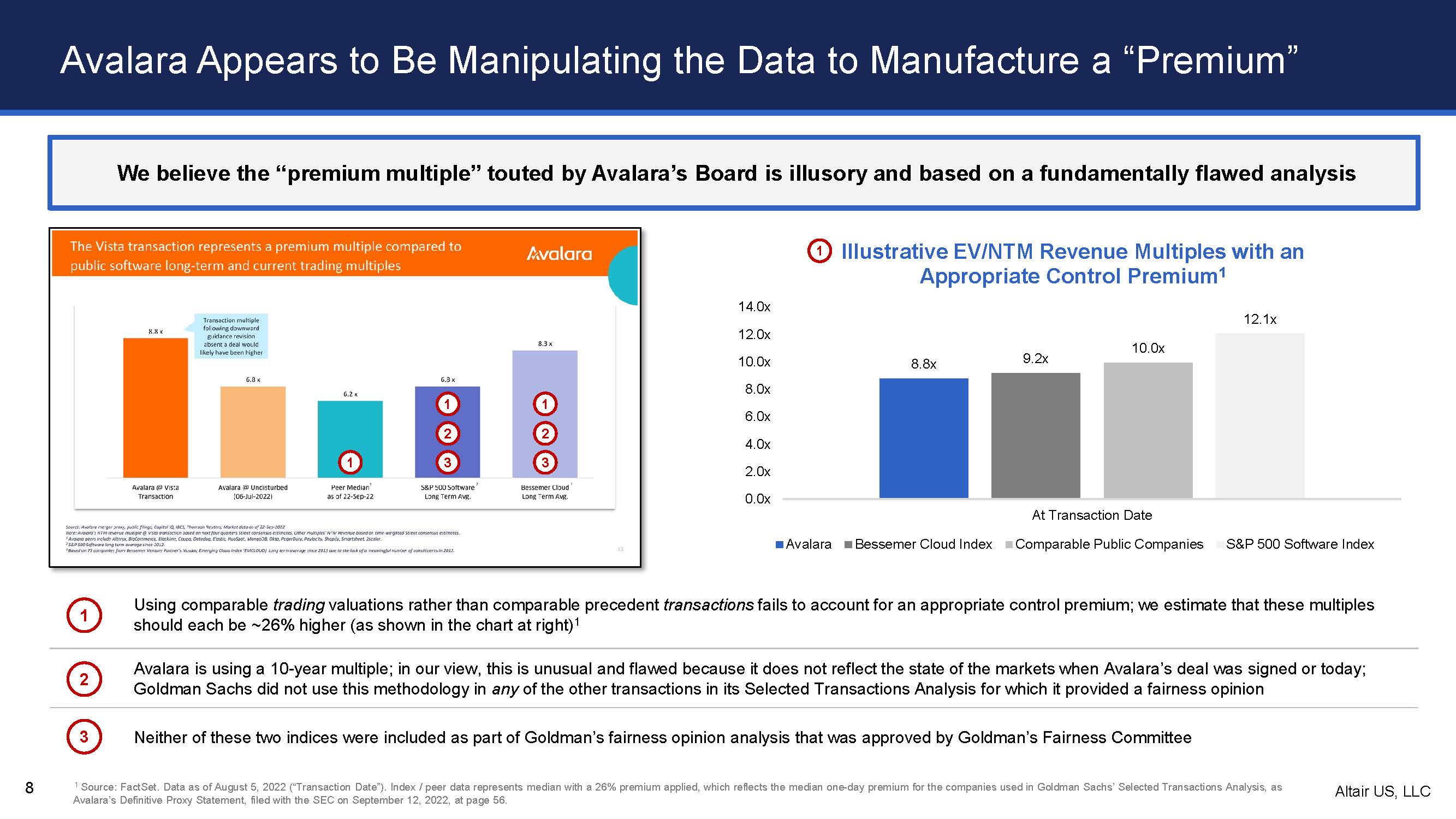 | · | Avalara appears to be manipulating the data, including by using new and inapposite peer groups and using varying dates and prices without explanation, to manufacture an argument that the Company is being sold at a “premium” valuation. We believe Vista’s offer price – which is well below sell-side analyst price targets prior to the deal and below Avalara’s historical valuation multiple – fails to sufficiently compensate Avalara shareholders for relinquishing their claim on Avalara’s future earnings. |