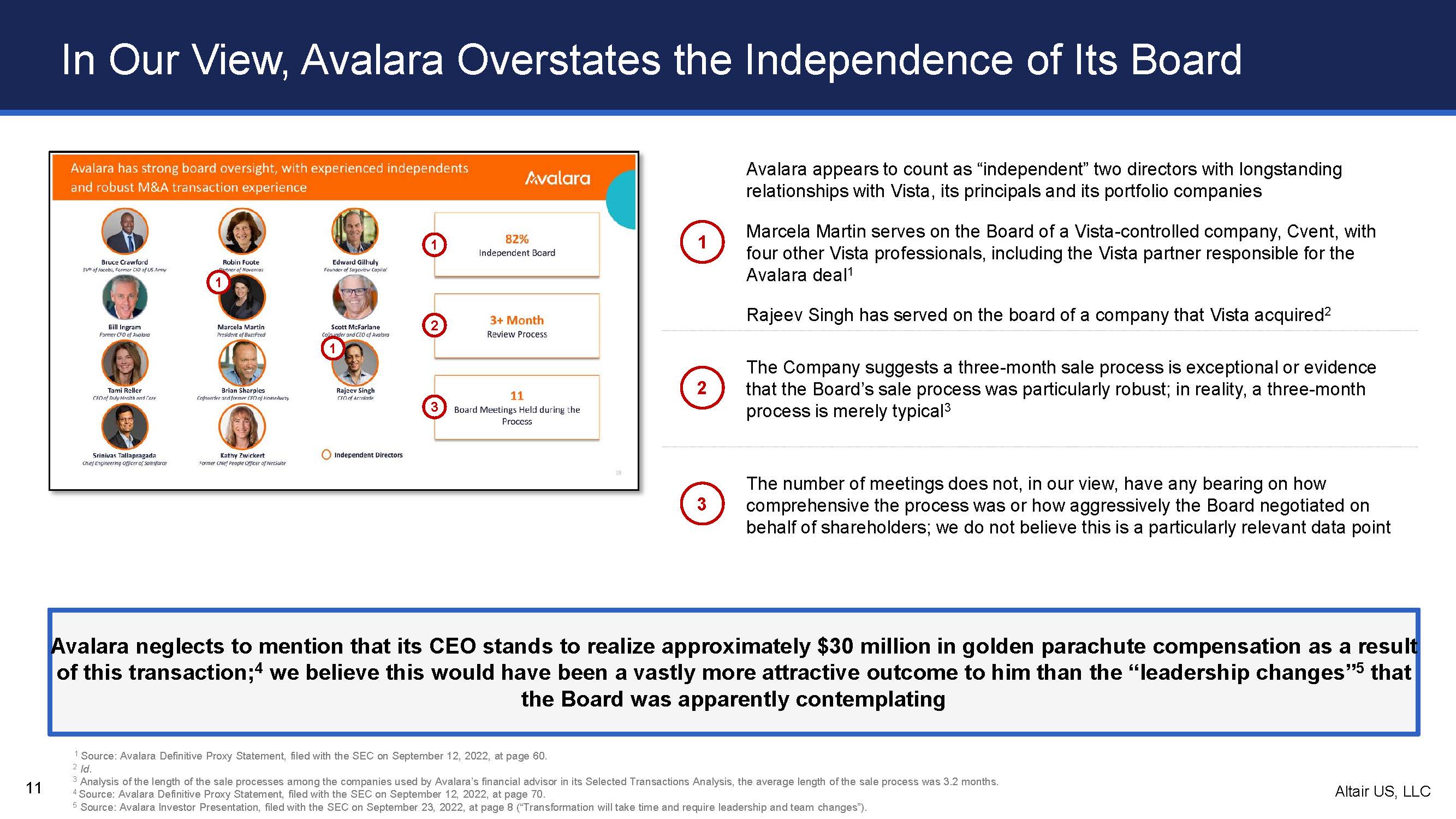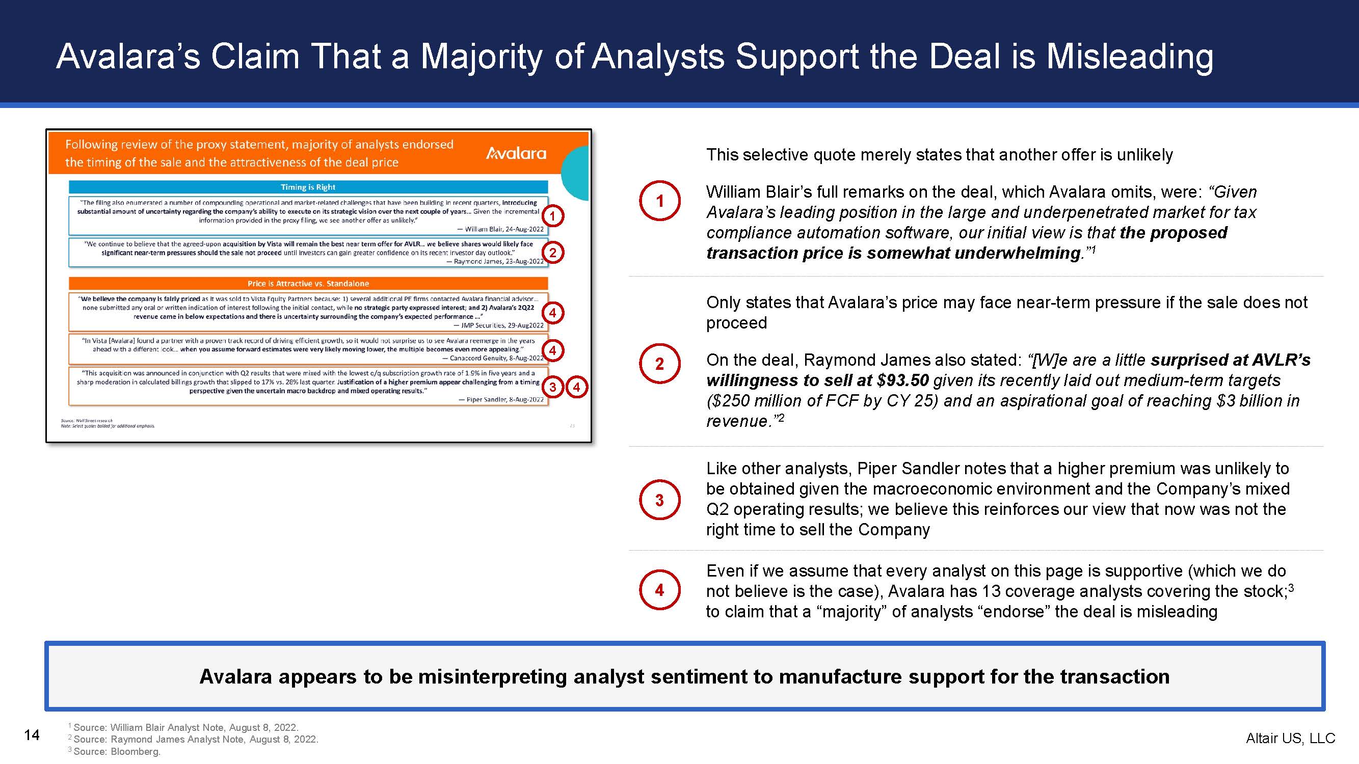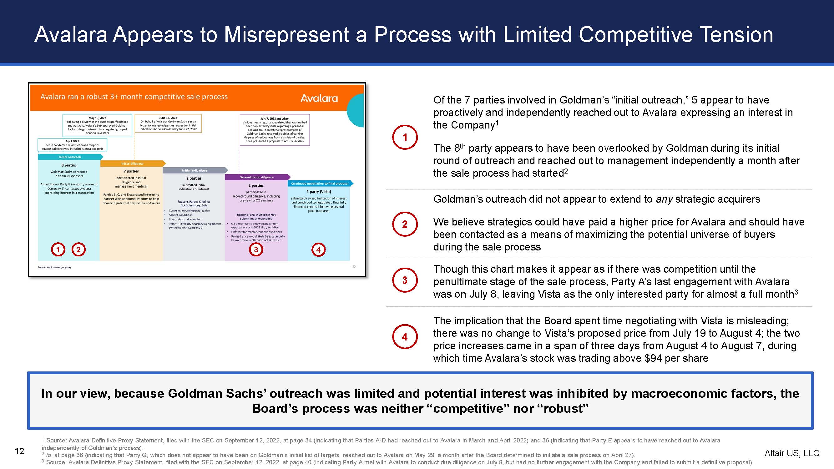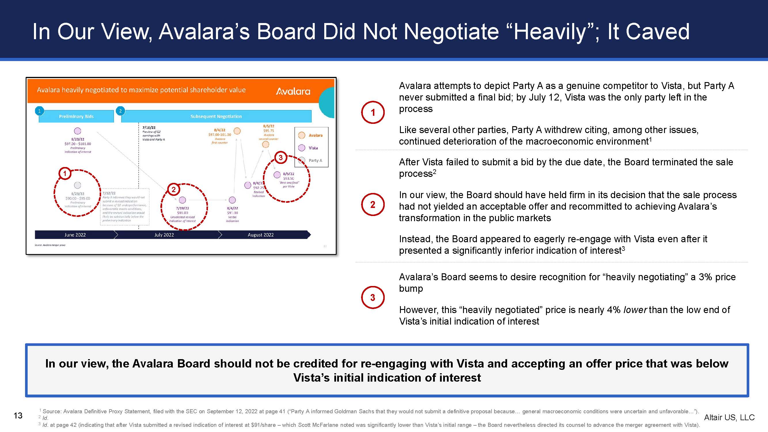 | · | The Company’s presentation fails to address some of the most troubling aspects of the deal. The Company has not responded to concerns about the lucrative and long standing relationship between Vista and Avalara’s financial advisor, Goldman Sachs, which has received $80 million from Vista and Vista affiliates over the last two years; the Board's failure to obtain a fairness opinion from an independent financial adviser (i.e. one that did not stand to receive over $70 million contingent upon closing of the deal); and connections between Vista and members of the Board who supported this deal. Nor has Avalara provided rationale for the Board’s decision to re-engage with Vista at a price lower than Vista’s initial indication of interest, even after the Board had terminated the sale process, nor for the Board’s decision to sell the Company during a time of macroeconomic uncertainty and capital markets volatility, which we believe had a significant negative impact on the level of interest from potential acquirers and their ability to finance a transaction and pay a fair price. |