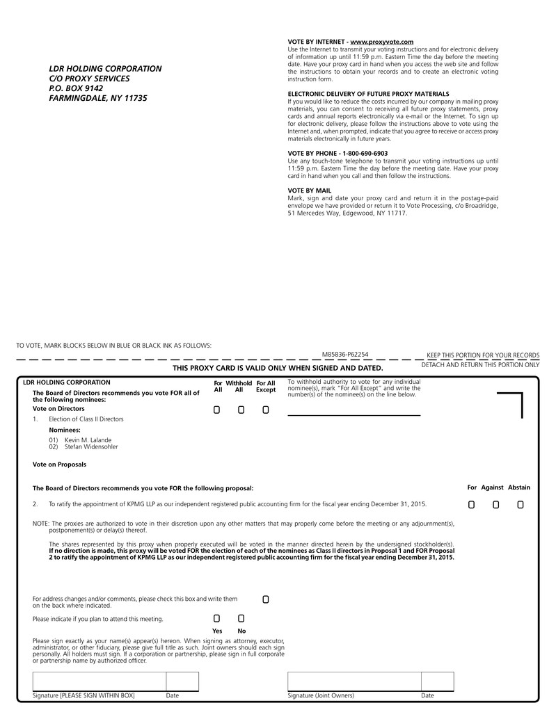 You may either vote “For” each of the nominees to serve as Class II directors or you may “Withhold” your vote for each of the nominees. You may vote “For” the ratification of the appointment by the audit committee of our Board of KPMG LLP as LDR’s independent registered public accounting firm for the fiscal year ending December 31, 2015, or you may vote “Against” or “Abstain” from voting.