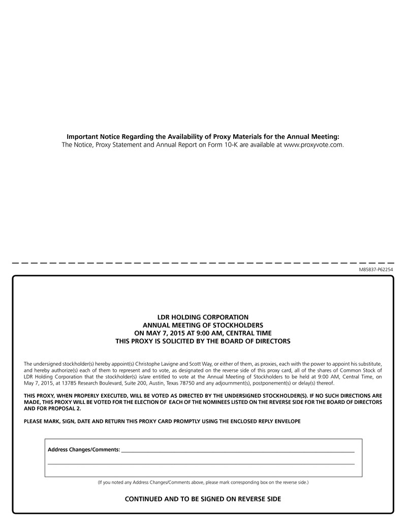 The 2015 Annual Meeting of Stockholders of LDR Holding Corporation will be held at 9:00 a.m. local time on May 7, 2015, at 13785 Research Boulevard, Suite 200, Austin, Texas 78750 for the following purposes: