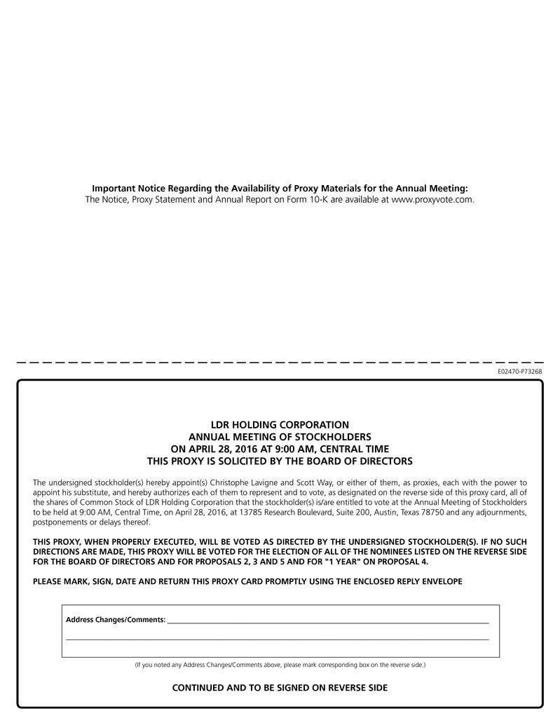 You are cordially invited to attend the 2016 Annual Meeting of Stockholders of LDR Holding Corporation to be held on April 28, 2016, beginning at 9:00 a.m. local time, at 13785 Research Boulevard, Suite 200, Austin, Texas 78750. Proxy materials, which include a Notice of the Meeting, proxy statement and proxy card, are enclosed with this letter. The enclosed proxy statement is first being mailed to stockholders of LDR Holding Corporation on or about March 18, 2016. We have also enclosed our 2015 Annual Report.