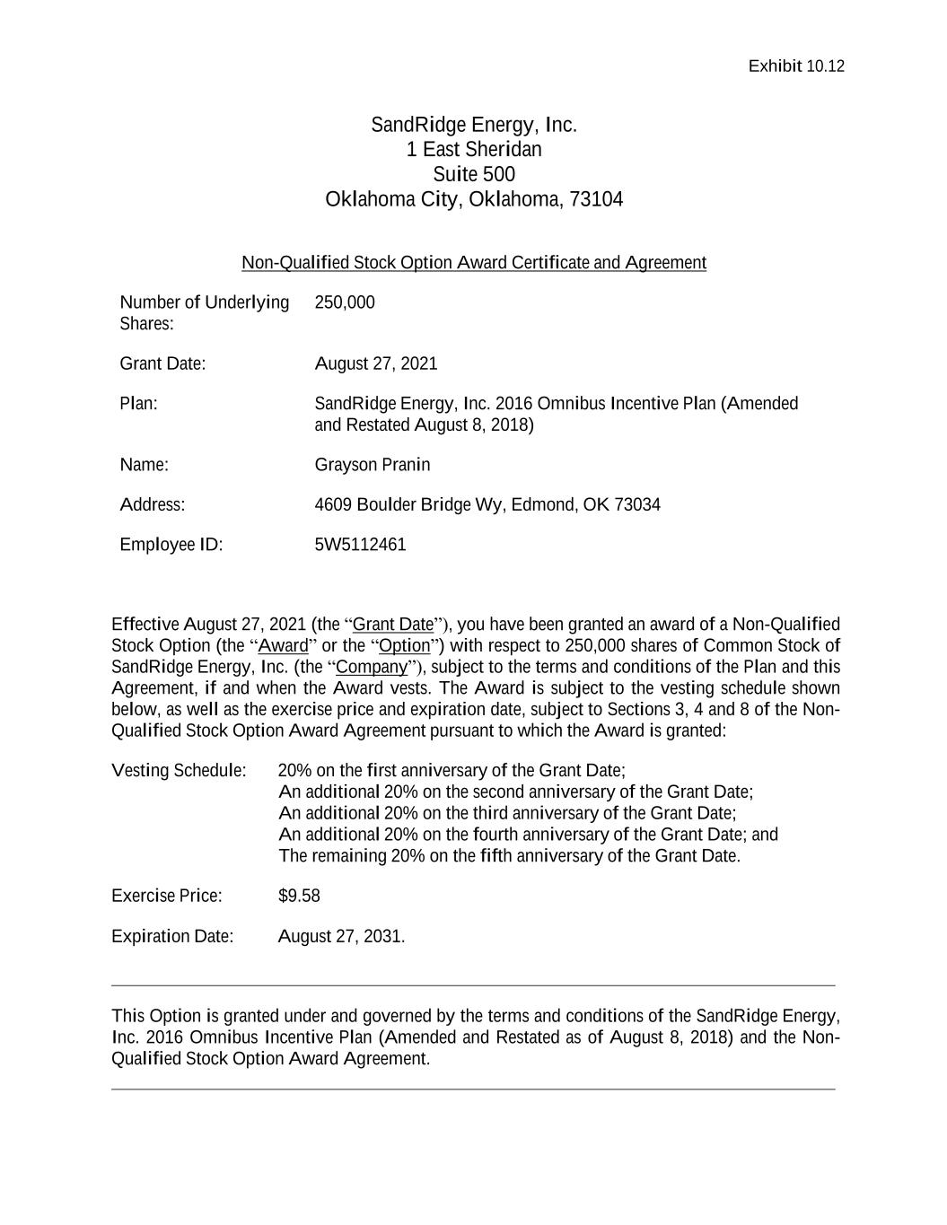 Exhibit 10.12 SandRidge Energy, Inc. 1 East Sheridan Suite 500 Oklahoma City, Oklahoma, 73104 Non-Qualified Stock Option Award Certificate and Agreement Number of Underlying Shares: 250,000 Grant Date: August 27, 2021 Plan: SandRidge Energy, Inc. 2016 Omnibus Incentive Plan (Amended and Restated August 8, 2018) Name: Grayson Pranin Address: 4609 Boulder Bridge Wy, Edmond, OK 73034 Employee ID: 5W5112461 Effective August 27, 2021 (the “Grant Date”), you have been granted an award of a Non-Qualified Stock Option (the “Award” or the “Option”) with respect to 250,000 shares of Common Stock of SandRidge Energy, Inc. (the “Company”), subject to the terms and conditions of the Plan and this Agreement, if and when the Award vests. The Award is subject to the vesting schedule shown below, as well as the exercise price and expiration date, subject to Sections 3, 4 and 8 of the Non- Qualified Stock Option Award Agreement pursuant to which the Award is granted: Vesting Schedule: 20% on the first anniversary of the Grant Date; An additional 20% on the second anniversary of the Grant Date; An additional 20% on the third anniversary of the Grant Date; An additional 20% on the fourth anniversary of the Grant Date; and The remaining 20% on the fifth anniversary of the Grant Date. Exercise Price: $9.58 Expiration Date: August 27, 2031. This Option is granted under and governed by the terms and conditions of the SandRidge Energy, Inc. 2016 Omnibus Incentive Plan (Amended and Restated as of August 8, 2018) and the Non- Qualified Stock Option Award Agreement.
