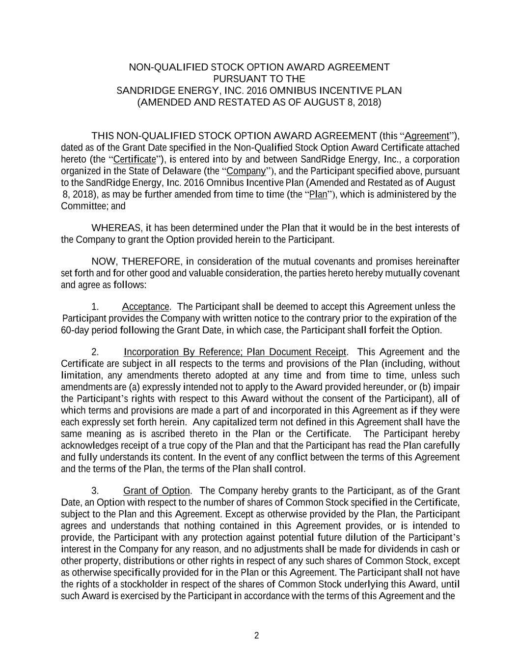 2 NON-QUALIFIED STOCK OPTION AWARD AGREEMENT PURSUANT TO THE SANDRIDGE ENERGY, INC. 2016 OMNIBUS INCENTIVE PLAN (AMENDED AND RESTATED AS OF AUGUST 8, 2018) THIS NON-QUALIFIED STOCK OPTION AWARD AGREEMENT (this “Agreement”), dated as of the Grant Date specified in the Non-Qualified Stock Option Award Certificate attached hereto (the “Certificate”), is entered into by and between SandRidge Energy, Inc., a corporation organized in the State of Delaware (the “Company”), and the Participant specified above, pursuant to the SandRidge Energy, Inc. 2016 Omnibus Incentive Plan (Amended and Restated as of August 8, 2018), as may be further amended from time to time (the “Plan”), which is administered by the Committee; and WHEREAS, it has been determined under the Plan that it would be in the best interests of the Company to grant the Option provided herein to the Participant. NOW, THEREFORE, in consideration of the mutual covenants and promises hereinafter set forth and for other good and valuable consideration, the parties hereto hereby mutually covenant and agree as follows: 1. Acceptance. The Participant shall be deemed to accept this Agreement unless the Participant provides the Company with written notice to the contrary prior to the expiration of the 60-day period following the Grant Date, in which case, the Participant shall forfeit the Option. 2. Incorporation By Reference; Plan Document Receipt. This Agreement and the Certificate are subject in all respects to the terms and provisions of the Plan (including, without limitation, any amendments thereto adopted at any time and from time to time, unless such amendments are (a) expressly intended not to apply to the Award provided hereunder, or (b) impair the Participant’s rights with respect to this Award without the consent of the Participant), all of which terms and provisions are made a part of and incorporated in this Agreement as if they were each expressly set forth herein. Any capitalized term not defined in this Agreement shall have the same meaning as is ascribed thereto in the Plan or the Certificate. The Participant hereby acknowledges receipt of a true copy of the Plan and that the Participant has read the Plan carefully and fully understands its content. In the event of any conflict between the terms of this Agreement and the terms of the Plan, the terms of the Plan shall control. 3. Grant of Option. The Company hereby grants to the Participant, as of the Grant Date, an Option with respect to the number of shares of Common Stock specified in the Certificate, subject to the Plan and this Agreement. Except as otherwise provided by the Plan, the Participant agrees and understands that nothing contained in this Agreement provides, or is intended to provide, the Participant with any protection against potential future dilution of the Participant’s interest in the Company for any reason, and no adjustments shall be made for dividends in cash or other property, distributions or other rights in respect of any such shares of Common Stock, except as otherwise specifically provided for in the Plan or this Agreement. The Participant shall not have the rights of a stockholder in respect of the shares of Common Stock underlying this Award, until such Award is exercised by the Participant in accordance with the terms of this Agreement and the