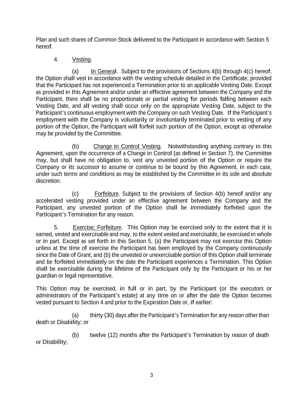 3 Plan and such shares of Common Stock delivered to the Participant in accordance with Section 5 hereof. 4. Vesting. (a) In General. Subject to the provisions of Sections 4(b) through 4(c) hereof, the Option shall vest in accordance with the vesting schedule detailed in the Certificate; provided that the Participant has not experienced a Termination prior to an applicable Vesting Date. Except as provided in this Agreement and/or under an effective agreement between the Company and the Participant, there shall be no proportionate or partial vesting for periods falling between each Vesting Date, and all vesting shall occur only on the appropriate Vesting Date, subject to the Participant’s continuous employment with the Company on such Vesting Date. If the Participant’s employment with the Company is voluntarily or involuntarily terminated prior to vesting of any portion of the Option, the Participant will forfeit such portion of the Option, except as otherwise may be provided by the Committee. (b) Change in Control Vesting. Notwithstanding anything contrary in this Agreement, upon the occurrence of a Change in Control (as defined in Section 7), the Committee may, but shall have no obligation to, vest any unvested portion of the Option or require the Company or its successor to assume or continue to be bound by this Agreement, in each case, under such terms and conditions as may be established by the Committee in its sole and absolute discretion. (c) Forfeiture. Subject to the provisions of Section 4(b) hereof and/or any accelerated vesting provided under an effective agreement between the Company and the Participant, any unvested portion of the Option shall be immediately forfeited upon the Participant’s Termination for any reason. 5. Exercise; Forfeiture. This Option may be exercised only to the extent that it is earned, vested and exercisable and may, to the extent vested and exercisable, be exercised in whole or in part. Except as set forth in this Section 5, (a) the Participant may not exercise this Option unless at the time of exercise the Participant has been employed by the Company continuously since the Date of Grant, and (b) the unvested or unexercisable portion of this Option shall terminate and be forfeited immediately on the date the Participant experiences a Termination. This Option shall be exercisable during the lifetime of the Participant only by the Participant or his or her guardian or legal representative. This Option may be exercised, in full or in part, by the Participant (or the executors or administrators of the Participant’s estate) at any time on or after the date the Option becomes vested pursuant to Section 4 and prior to the Expiration Date or, if earlier: (a) thirty (30) days after the Participant’s Termination for any reason other than death or Disability; or or Disability; (b) twelve (12) months after the Participant’s Termination by reason of death