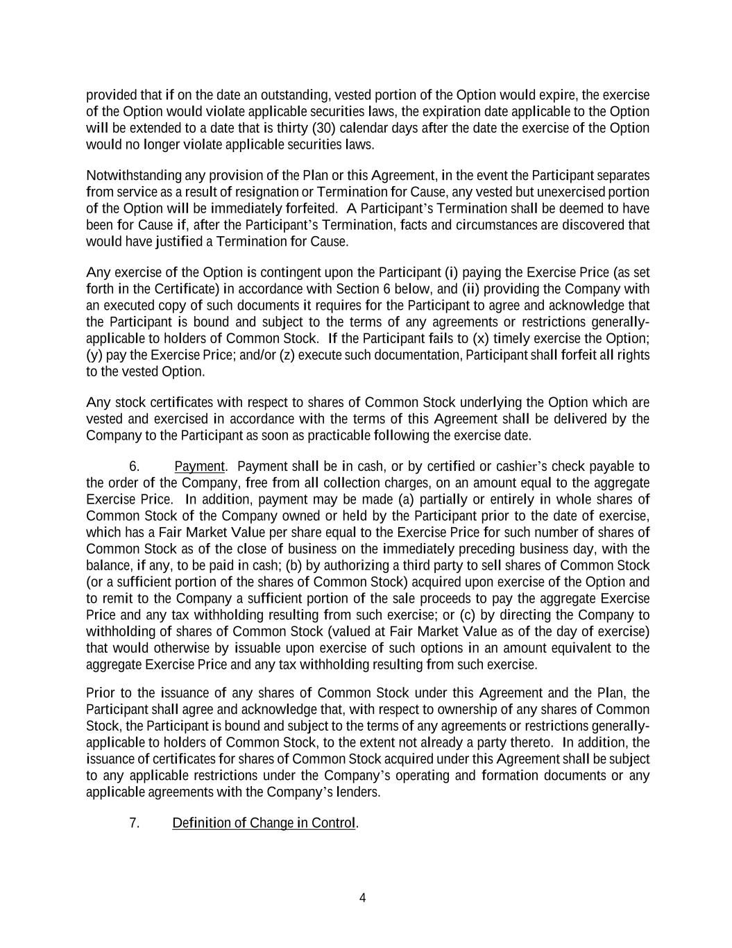 4 provided that if on the date an outstanding, vested portion of the Option would expire, the exercise of the Option would violate applicable securities laws, the expiration date applicable to the Option will be extended to a date that is thirty (30) calendar days after the date the exercise of the Option would no longer violate applicable securities laws. Notwithstanding any provision of the Plan or this Agreement, in the event the Participant separates from service as a result of resignation or Termination for Cause, any vested but unexercised portion of the Option will be immediately forfeited. A Participant’s Termination shall be deemed to have been for Cause if, after the Participant’s Termination, facts and circumstances are discovered that would have justified a Termination for Cause. Any exercise of the Option is contingent upon the Participant (i) paying the Exercise Price (as set forth in the Certificate) in accordance with Section 6 below, and (ii) providing the Company with an executed copy of such documents it requires for the Participant to agree and acknowledge that the Participant is bound and subject to the terms of any agreements or restrictions generally- applicable to holders of Common Stock. If the Participant fails to (x) timely exercise the Option; (y) pay the Exercise Price; and/or (z) execute such documentation, Participant shall forfeit all rights to the vested Option. Any stock certificates with respect to shares of Common Stock underlying the Option which are vested and exercised in accordance with the terms of this Agreement shall be delivered by the Company to the Participant as soon as practicable following the exercise date. 6. Payment. Payment shall be in cash, or by certified or cashier’s check payable to the order of the Company, free from all collection charges, on an amount equal to the aggregate Exercise Price. In addition, payment may be made (a) partially or entirely in whole shares of Common Stock of the Company owned or held by the Participant prior to the date of exercise, which has a Fair Market Value per share equal to the Exercise Price for such number of shares of Common Stock as of the close of business on the immediately preceding business day, with the balance, if any, to be paid in cash; (b) by authorizing a third party to sell shares of Common Stock (or a sufficient portion of the shares of Common Stock) acquired upon exercise of the Option and to remit to the Company a sufficient portion of the sale proceeds to pay the aggregate Exercise Price and any tax withholding resulting from such exercise; or (c) by directing the Company to withholding of shares of Common Stock (valued at Fair Market Value as of the day of exercise) that would otherwise by issuable upon exercise of such options in an amount equivalent to the aggregate Exercise Price and any tax withholding resulting from such exercise. Prior to the issuance of any shares of Common Stock under this Agreement and the Plan, the Participant shall agree and acknowledge that, with respect to ownership of any shares of Common Stock, the Participant is bound and subject to the terms of any agreements or restrictions generally- applicable to holders of Common Stock, to the extent not already a party thereto. In addition, the issuance of certificates for shares of Common Stock acquired under this Agreement shall be subject to any applicable restrictions under the Company’s operating and formation documents or any applicable agreements with the Company’s lenders. 7. Definition of Change in Control.