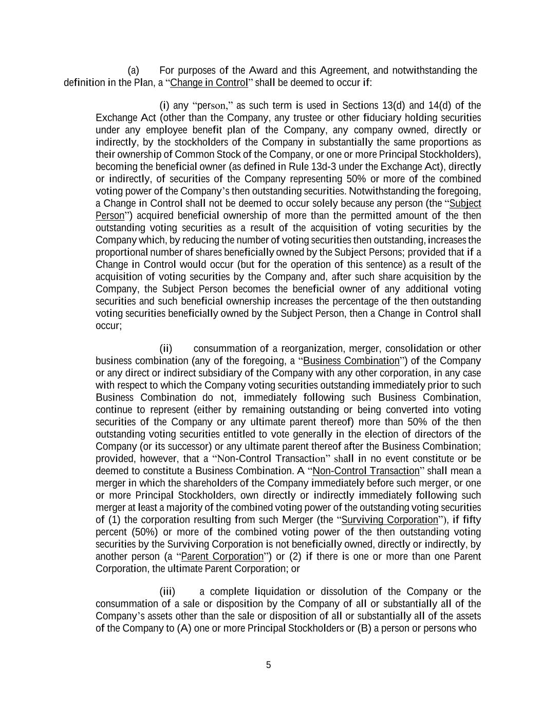 5 (a) For purposes of the Award and this Agreement, and notwithstanding the definition in the Plan, a “Change in Control” shall be deemed to occur if: (i) any “person,” as such term is used in Sections 13(d) and 14(d) of the Exchange Act (other than the Company, any trustee or other fiduciary holding securities under any employee benefit plan of the Company, any company owned, directly or indirectly, by the stockholders of the Company in substantially the same proportions as their ownership of Common Stock of the Company, or one or more Principal Stockholders), becoming the beneficial owner (as defined in Rule 13d-3 under the Exchange Act), directly or indirectly, of securities of the Company representing 50% or more of the combined voting power of the Company’s then outstanding securities. Notwithstanding the foregoing, a Change in Control shall not be deemed to occur solely because any person (the “Subject Person”) acquired beneficial ownership of more than the permitted amount of the then outstanding voting securities as a result of the acquisition of voting securities by the Company which, by reducing the number of voting securities then outstanding, increases the proportional number of shares beneficially owned by the Subject Persons; provided that if a Change in Control would occur (but for the operation of this sentence) as a result of the acquisition of voting securities by the Company and, after such share acquisition by the Company, the Subject Person becomes the beneficial owner of any additional voting securities and such beneficial ownership increases the percentage of the then outstanding voting securities beneficially owned by the Subject Person, then a Change in Control shall occur; (ii) consummation of a reorganization, merger, consolidation or other business combination (any of the foregoing, a “Business Combination”) of the Company or any direct or indirect subsidiary of the Company with any other corporation, in any case with respect to which the Company voting securities outstanding immediately prior to such Business Combination do not, immediately following such Business Combination, continue to represent (either by remaining outstanding or being converted into voting securities of the Company or any ultimate parent thereof) more than 50% of the then outstanding voting securities entitled to vote generally in the election of directors of the Company (or its successor) or any ultimate parent thereof after the Business Combination; provided, however, that a “Non-Control Transaction” shall in no event constitute or be deemed to constitute a Business Combination. A “Non-Control Transaction” shall mean a merger in which the shareholders of the Company immediately before such merger, or one or more Principal Stockholders, own directly or indirectly immediately following such merger at least a majority of the combined voting power of the outstanding voting securities of (1) the corporation resulting from such Merger (the “Surviving Corporation”), if fifty percent (50%) or more of the combined voting power of the then outstanding voting securities by the Surviving Corporation is not beneficially owned, directly or indirectly, by another person (a “Parent Corporation”) or (2) if there is one or more than one Parent Corporation, the ultimate Parent Corporation; or (iii) a complete liquidation or dissolution of the Company or the consummation of a sale or disposition by the Company of all or substantially all of the Company’s assets other than the sale or disposition of all or substantially all of the assets of the Company to (A) one or more Principal Stockholders or (B) a person or persons who