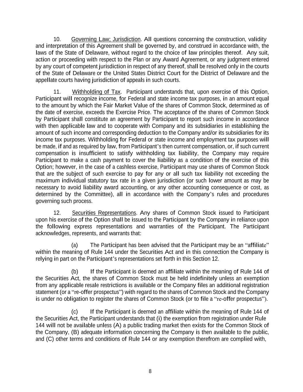 8 10. Governing Law; Jurisdiction. All questions concerning the construction, validity and interpretation of this Agreement shall be governed by, and construed in accordance with, the laws of the State of Delaware, without regard to the choice of law principles thereof. Any suit, action or proceeding with respect to the Plan or any Award Agreement, or any judgment entered by any court of competent jurisdiction in respect of any thereof, shall be resolved only in the courts of the State of Delaware or the United States District Court for the District of Delaware and the appellate courts having jurisdiction of appeals in such courts. 11. Withholding of Tax. Participant understands that, upon exercise of this Option, Participant will recognize income, for Federal and state income tax purposes, in an amount equal to the amount by which the Fair Market Value of the shares of Common Stock, determined as of the date of exercise, exceeds the Exercise Price. The acceptance of the shares of Common Stock by Participant shall constitute an agreement by Participant to report such income in accordance with then applicable law and to cooperate with Company and its subsidiaries in establishing the amount of such income and corresponding deduction to the Company and/or its subsidiaries for its income tax purposes. Withholding for Federal or state income and employment tax purposes will be made, if and as required by law, from Participant’s then current compensation, or, if such current compensation is insufficient to satisfy withholding tax liability, the Company may require Participant to make a cash payment to cover the liability as a condition of the exercise of this Option; however, in the case of a cashless exercise, Participant may use shares of Common Stock that are the subject of such exercise to pay for any or all such tax liability not exceeding the maximum individual statutory tax rate in a given jurisdiction (or such lower amount as may be necessary to avoid liability award accounting, or any other accounting consequence or cost, as determined by the Committee), all in accordance with the Company’s rules and procedures governing such process. 12. Securities Representations. Any shares of Common Stock issued to Participant upon his exercise of the Option shall be issued to the Participant by the Company in reliance upon the following express representations and warranties of the Participant. The Participant acknowledges, represents, and warrants that: (a) The Participant has been advised that the Participant may be an “affiliate” within the meaning of Rule 144 under the Securities Act and in this connection the Company is relying in part on the Participant’s representations set forth in this Section 12. (b) If the Participant is deemed an affiliate within the meaning of Rule 144 of the Securities Act, the shares of Common Stock must be held indefinitely unless an exemption from any applicable resale restrictions is available or the Company files an additional registration statement (or a “re-offer prospectus”) with regard to the shares of Common Stock and the Company is under no obligation to register the shares of Common Stock (or to file a “re-offer prospectus”). (c) If the Participant is deemed an affiliate within the meaning of Rule 144 of the Securities Act, the Participant understands that (i) the exemption from registration under Rule 144 will not be available unless (A) a public trading market then exists for the Common Stock of the Company, (B) adequate information concerning the Company is then available to the public, and (C) other terms and conditions of Rule 144 or any exemption therefrom are complied with,