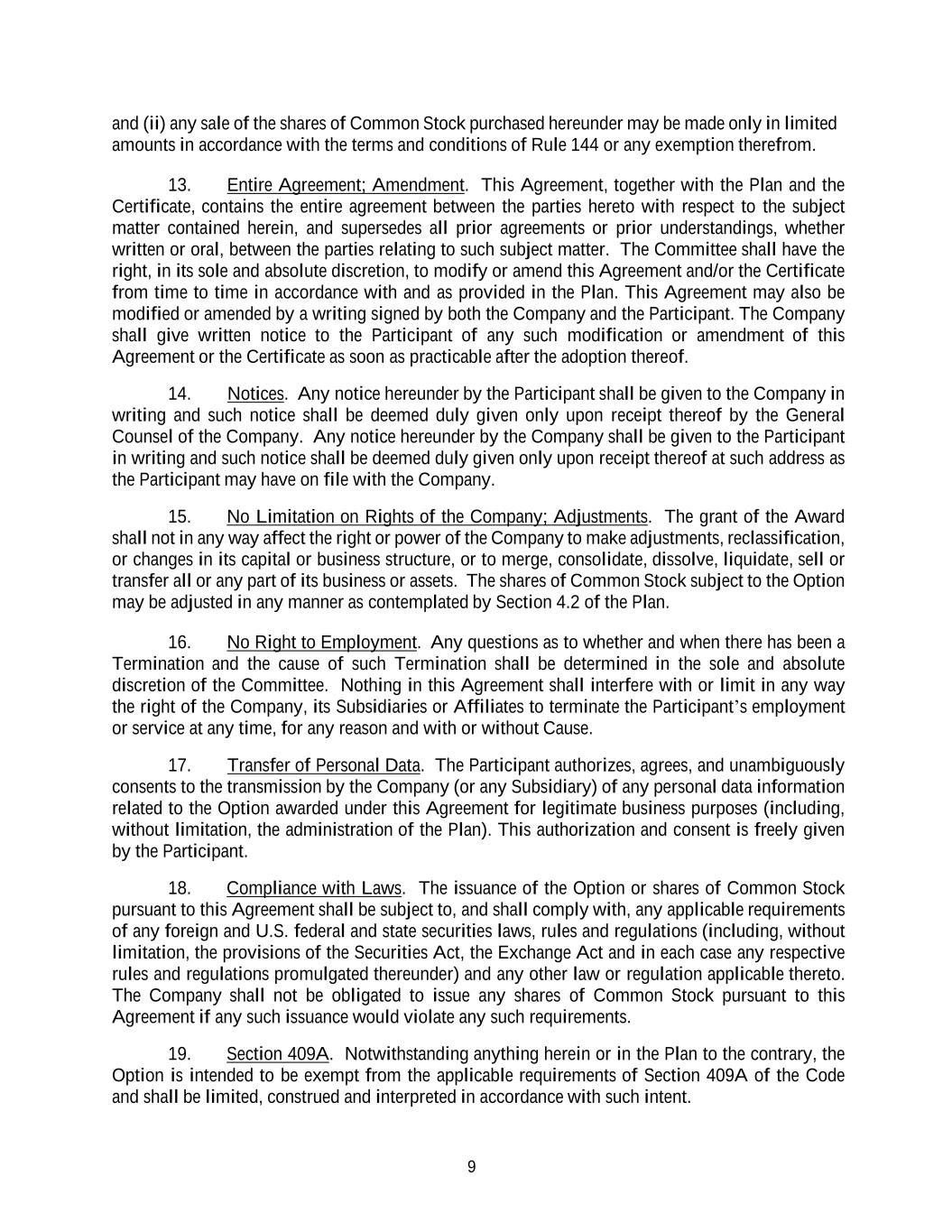 9 and (ii) any sale of the shares of Common Stock purchased hereunder may be made only in limited amounts in accordance with the terms and conditions of Rule 144 or any exemption therefrom. 13. Entire Agreement; Amendment. This Agreement, together with the Plan and the Certificate, contains the entire agreement between the parties hereto with respect to the subject matter contained herein, and supersedes all prior agreements or prior understandings, whether written or oral, between the parties relating to such subject matter. The Committee shall have the right, in its sole and absolute discretion, to modify or amend this Agreement and/or the Certificate from time to time in accordance with and as provided in the Plan. This Agreement may also be modified or amended by a writing signed by both the Company and the Participant. The Company shall give written notice to the Participant of any such modification or amendment of this Agreement or the Certificate as soon as practicable after the adoption thereof. 14. Notices. Any notice hereunder by the Participant shall be given to the Company in writing and such notice shall be deemed duly given only upon receipt thereof by the General Counsel of the Company. Any notice hereunder by the Company shall be given to the Participant in writing and such notice shall be deemed duly given only upon receipt thereof at such address as the Participant may have on file with the Company. 15. No Limitation on Rights of the Company; Adjustments. The grant of the Award shall not in any way affect the right or power of the Company to make adjustments, reclassification, or changes in its capital or business structure, or to merge, consolidate, dissolve, liquidate, sell or transfer all or any part of its business or assets. The shares of Common Stock subject to the Option may be adjusted in any manner as contemplated by Section 4.2 of the Plan. 16. No Right to Employment. Any questions as to whether and when there has been a Termination and the cause of such Termination shall be determined in the sole and absolute discretion of the Committee. Nothing in this Agreement shall interfere with or limit in any way the right of the Company, its Subsidiaries or Affiliates to terminate the Participant’s employment or service at any time, for any reason and with or without Cause. 17. Transfer of Personal Data. The Participant authorizes, agrees, and unambiguously consents to the transmission by the Company (or any Subsidiary) of any personal data information related to the Option awarded under this Agreement for legitimate business purposes (including, without limitation, the administration of the Plan). This authorization and consent is freely given by the Participant. 18. Compliance with Laws. The issuance of the Option or shares of Common Stock pursuant to this Agreement shall be subject to, and shall comply with, any applicable requirements of any foreign and U.S. federal and state securities laws, rules and regulations (including, without limitation, the provisions of the Securities Act, the Exchange Act and in each case any respective rules and regulations promulgated thereunder) and any other law or regulation applicable thereto. The Company shall not be obligated to issue any shares of Common Stock pursuant to this Agreement if any such issuance would violate any such requirements. 19. Section 409A. Notwithstanding anything herein or in the Plan to the contrary, the Option is intended to be exempt from the applicable requirements of Section 409A of the Code and shall be limited, construed and interpreted in accordance with such intent.