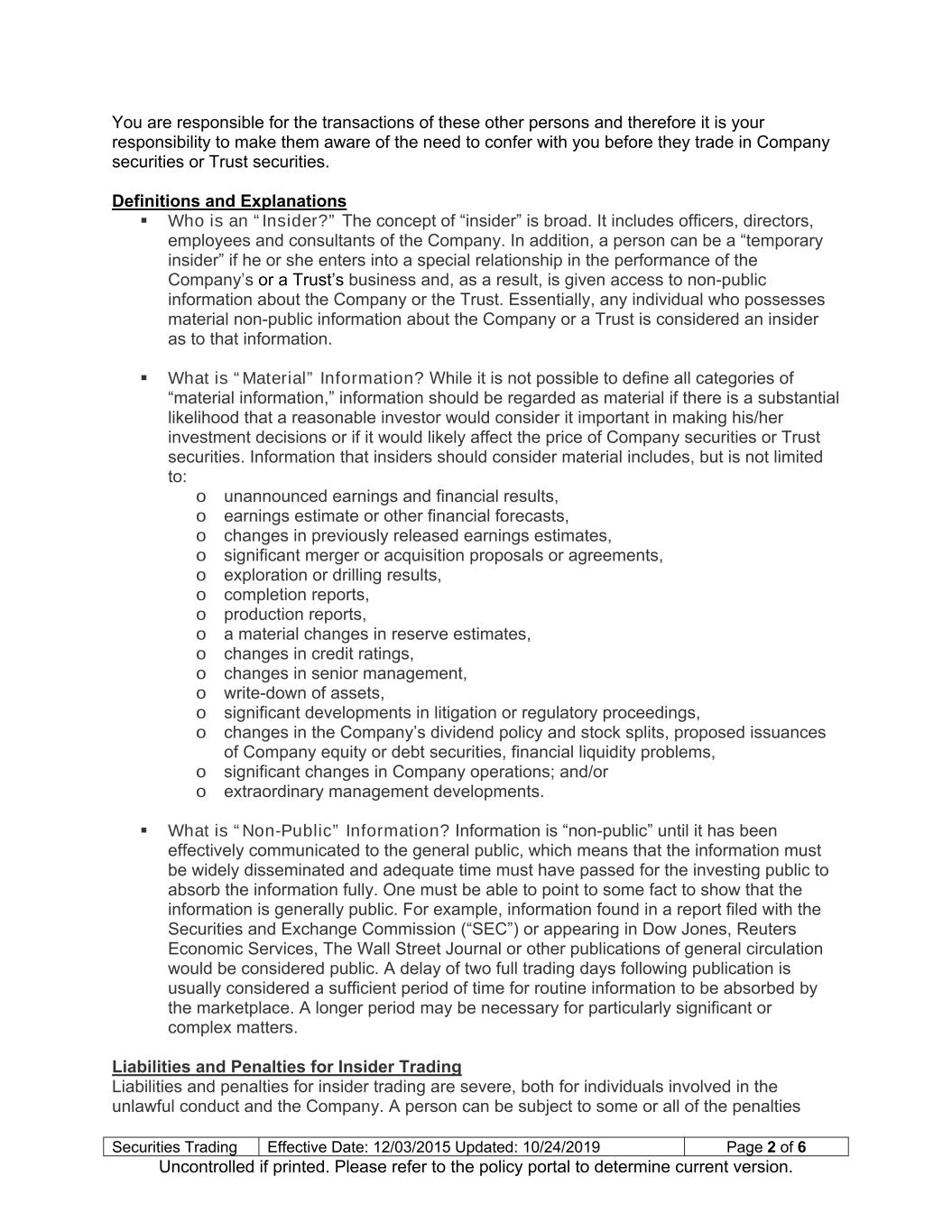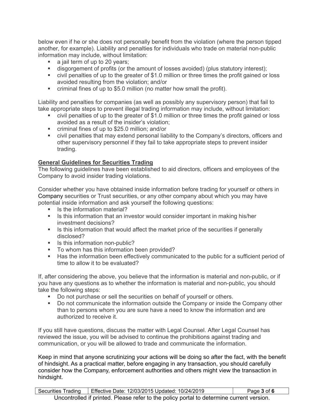 Securities Trading Effective Date: 12/03/2015 Updated: 10/24/2019 Page 3 of 6 Uncontrolled if printed. Please refer to the policy portal to determine current version. below even if he or she does not personally benefit from the violation (where the person tipped another, for example). Liability and penalties for individuals who trade on material non-public information may include, without limitation: a jail term of up to 20 years; disgorgement of profits (or the amount of losses avoided) (plus statutory interest); civil penalties of up to the greater of $1.0 million or three times the profit gained or loss avoided resulting from the violation; and/or criminal fines of up to $5.0 million (no matter how small the profit). Liability and penalties for companies (as well as possibly any supervisory person) that fail to take appropriate steps to prevent illegal trading information may include, without limitation: civil penalties of up to the greater of $1.0 million or three times the profit gained or loss avoided as a result of the insider’s violation; criminal fines of up to $25.0 million; and/or civil penalties that may extend personal liability to the Company’s directors, officers and other supervisory personnel if they fail to take appropriate steps to prevent insider trading. General Guidelines for Securities Trading The following guidelines have been established to aid directors, officers and employees of the Company to avoid insider trading violations. Consider whether you have obtained inside information before trading for yourself or others in Company securities or Trust securities, or any other company about which you may have potential inside information and ask yourself the following questions: Is the information material? Is this information that an investor would consider important in making his/her investment decisions? Is this information that would affect the market price of the securities if generally disclosed? Is this information non-public? To whom has this information been provided? Has the information been effectively communicated to the public for a sufficient period of time to allow it to be evaluated? If, after considering the above, you believe that the information is material and non-public, or if you have any questions as to whether the information is material and non-public, you should take the following steps: Do not purchase or sell the securities on behalf of yourself or others. Do not communicate the information outside the Company or inside the Company other than to persons whom you are sure have a need to know the information and are authorized to receive it. If you still have questions, discuss the matter with Legal Counsel. After Legal Counsel has reviewed the issue, you will be advised to continue the prohibitions against trading and communication, or you will be allowed to trade and communicate the information. Keep in mind that anyone scrutinizing your actions will be doing so after the fact, with the benefit of hindsight. As a practical matter, before engaging in any transaction, you should carefully consider how the Company, enforcement authorities and others might view the transaction in hindsight.
