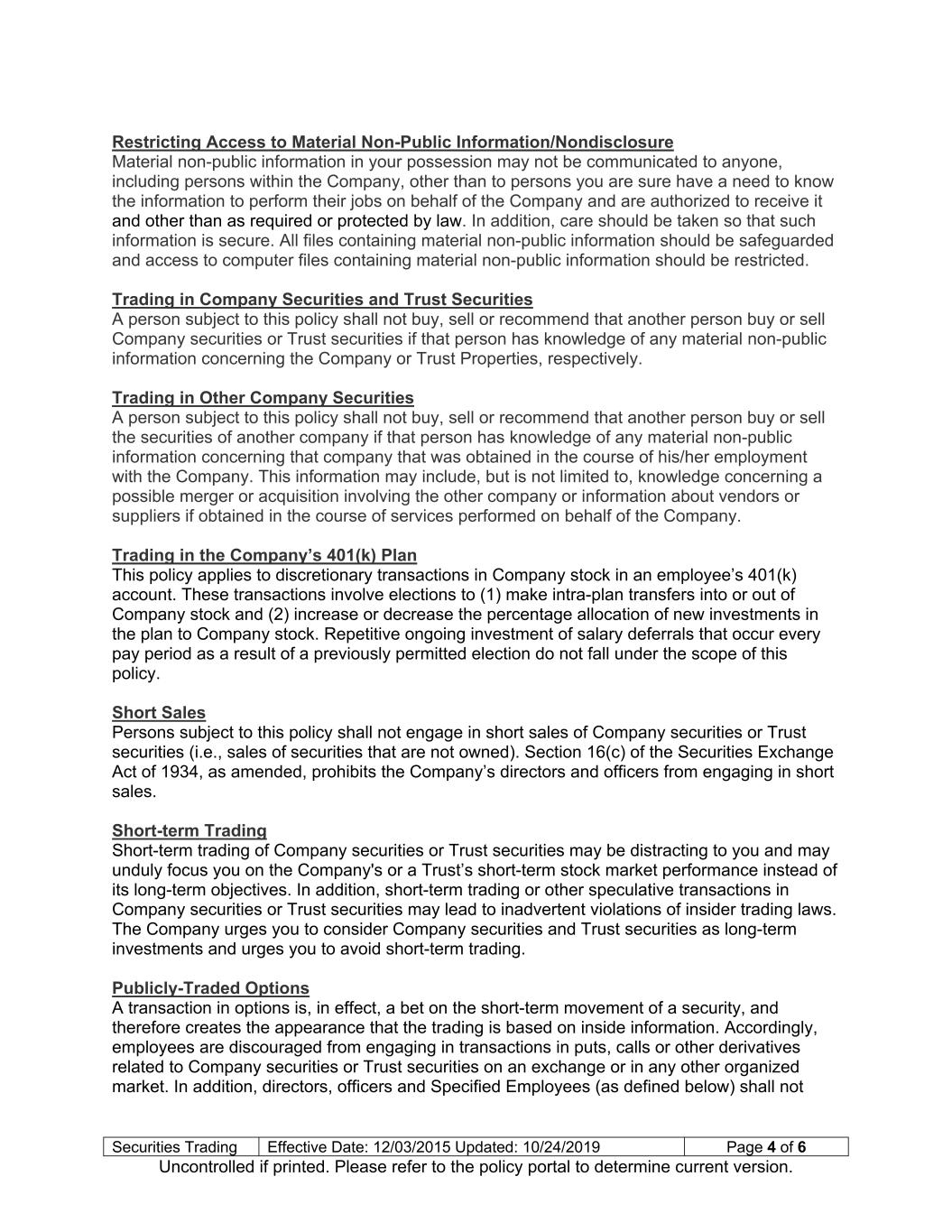 Securities Trading Effective Date: 12/03/2015 Updated: 10/24/2019 Page 4 of 6 Uncontrolled if printed. Please refer to the policy portal to determine current version. Restricting Access to Material Non-Public Information/Nondisclosure Material non-public information in your possession may not be communicated to anyone, including persons within the Company, other than to persons you are sure have a need to know the information to perform their jobs on behalf of the Company and are authorized to receive it and other than as required or protected by law. In addition, care should be taken so that such information is secure. All files containing material non-public information should be safeguarded and access to computer files containing material non-public information should be restricted. Trading in Company Securities and Trust Securities A person subject to this policy shall not buy, sell or recommend that another person buy or sell Company securities or Trust securities if that person has knowledge of any material non-public information concerning the Company or Trust Properties, respectively. Trading in Other Company Securities A person subject to this policy shall not buy, sell or recommend that another person buy or sell the securities of another company if that person has knowledge of any material non-public information concerning that company that was obtained in the course of his/her employment with the Company. This information may include, but is not limited to, knowledge concerning a possible merger or acquisition involving the other company or information about vendors or suppliers if obtained in the course of services performed on behalf of the Company. Trading in the Company’s 401(k) Plan This policy applies to discretionary transactions in Company stock in an employee’s 401(k) account. These transactions involve elections to (1) make intra-plan transfers into or out of Company stock and (2) increase or decrease the percentage allocation of new investments in the plan to Company stock. Repetitive ongoing investment of salary deferrals that occur every pay period as a result of a previously permitted election do not fall under the scope of this policy. Short Sales Persons subject to this policy shall not engage in short sales of Company securities or Trust securities (i.e., sales of securities that are not owned). Section 16(c) of the Securities Exchange Act of 1934, as amended, prohibits the Company’s directors and officers from engaging in short sales. Short-term Trading Short-term trading of Company securities or Trust securities may be distracting to you and may unduly focus you on the Company's or a Trust’s short-term stock market performance instead of its long-term objectives. In addition, short-term trading or other speculative transactions in Company securities or Trust securities may lead to inadvertent violations of insider trading laws. The Company urges you to consider Company securities and Trust securities as long-term investments and urges you to avoid short-term trading. Publicly-Traded Options A transaction in options is, in effect, a bet on the short-term movement of a security, and therefore creates the appearance that the trading is based on inside information. Accordingly, employees are discouraged from engaging in transactions in puts, calls or other derivatives related to Company securities or Trust securities on an exchange or in any other organized market. In addition, directors, officers and Specified Employees (as defined below) shall not