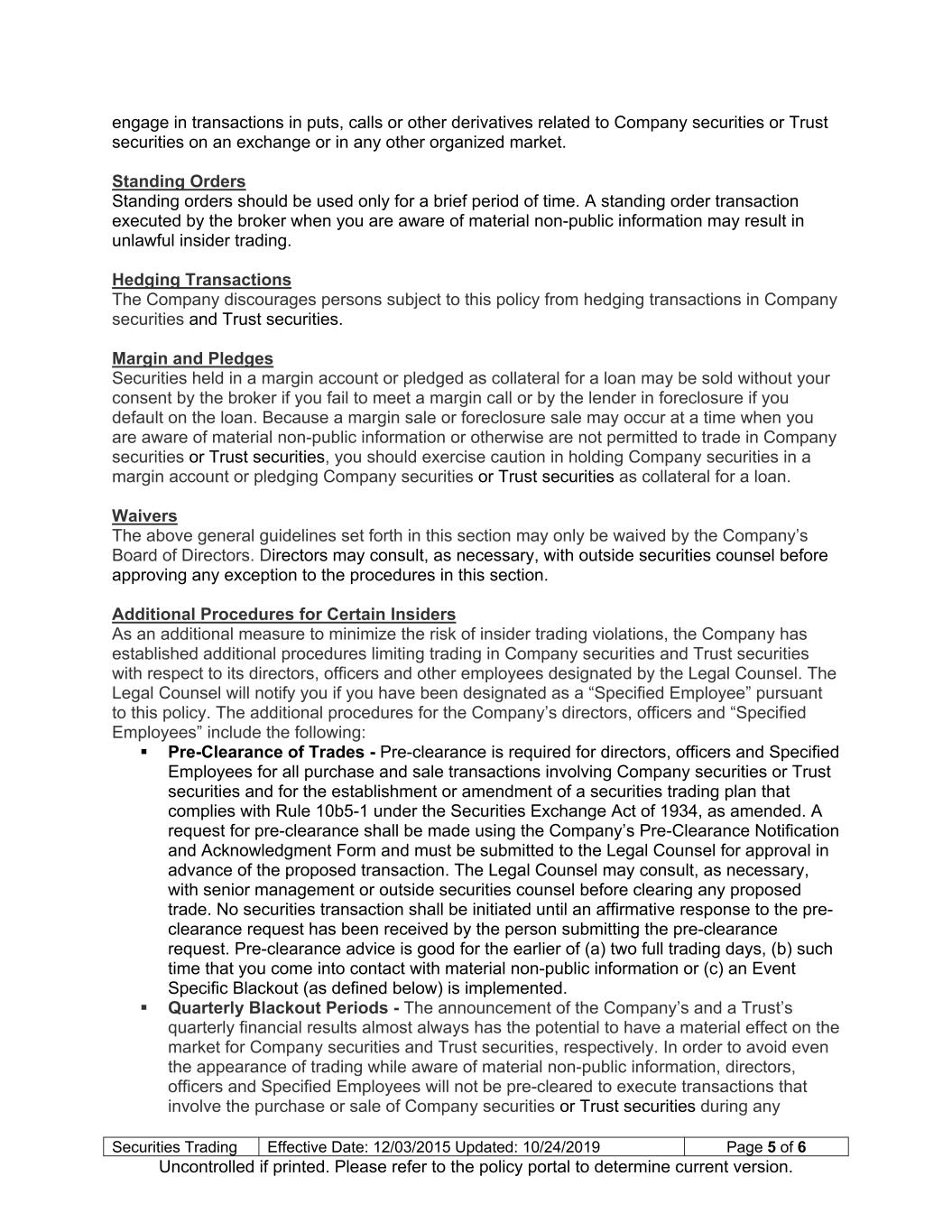 Securities Trading Effective Date: 12/03/2015 Updated: 10/24/2019 Page 5 of 6 Uncontrolled if printed. Please refer to the policy portal to determine current version. engage in transactions in puts, calls or other derivatives related to Company securities or Trust securities on an exchange or in any other organized market. Standing Orders Standing orders should be used only for a brief period of time. A standing order transaction executed by the broker when you are aware of material non-public information may result in unlawful insider trading. Hedging Transactions The Company discourages persons subject to this policy from hedging transactions in Company securities and Trust securities. Margin and Pledges Securities held in a margin account or pledged as collateral for a loan may be sold without your consent by the broker if you fail to meet a margin call or by the lender in foreclosure if you default on the loan. Because a margin sale or foreclosure sale may occur at a time when you are aware of material non-public information or otherwise are not permitted to trade in Company securities or Trust securities, you should exercise caution in holding Company securities in a margin account or pledging Company securities or Trust securities as collateral for a loan. Waivers The above general guidelines set forth in this section may only be waived by the Company’s Board of Directors. Directors may consult, as necessary, with outside securities counsel before approving any exception to the procedures in this section. Additional Procedures for Certain Insiders As an additional measure to minimize the risk of insider trading violations, the Company has established additional procedures limiting trading in Company securities and Trust securities with respect to its directors, officers and other employees designated by the Legal Counsel. The Legal Counsel will notify you if you have been designated as a “Specified Employee” pursuant to this policy. The additional procedures for the Company’s directors, officers and “Specified Employees” include the following: Pre-Clearance of Trades - Pre-clearance is required for directors, officers and Specified Employees for all purchase and sale transactions involving Company securities or Trust securities and for the establishment or amendment of a securities trading plan that complies with Rule 10b5-1 under the Securities Exchange Act of 1934, as amended. A request for pre-clearance shall be made using the Company’s Pre-Clearance Notification and Acknowledgment Form and must be submitted to the Legal Counsel for approval in advance of the proposed transaction. The Legal Counsel may consult, as necessary, with senior management or outside securities counsel before clearing any proposed trade. No securities transaction shall be initiated until an affirmative response to the pre- clearance request has been received by the person submitting the pre-clearance request. Pre-clearance advice is good for the earlier of (a) two full trading days, (b) such time that you come into contact with material non-public information or (c) an Event Specific Blackout (as defined below) is implemented. Quarterly Blackout Periods - The announcement of the Company’s and a Trust’s quarterly financial results almost always has the potential to have a material effect on the market for Company securities and Trust securities, respectively. In order to avoid even the appearance of trading while aware of material non-public information, directors, officers and Specified Employees will not be pre-cleared to execute transactions that involve the purchase or sale of Company securities or Trust securities during any