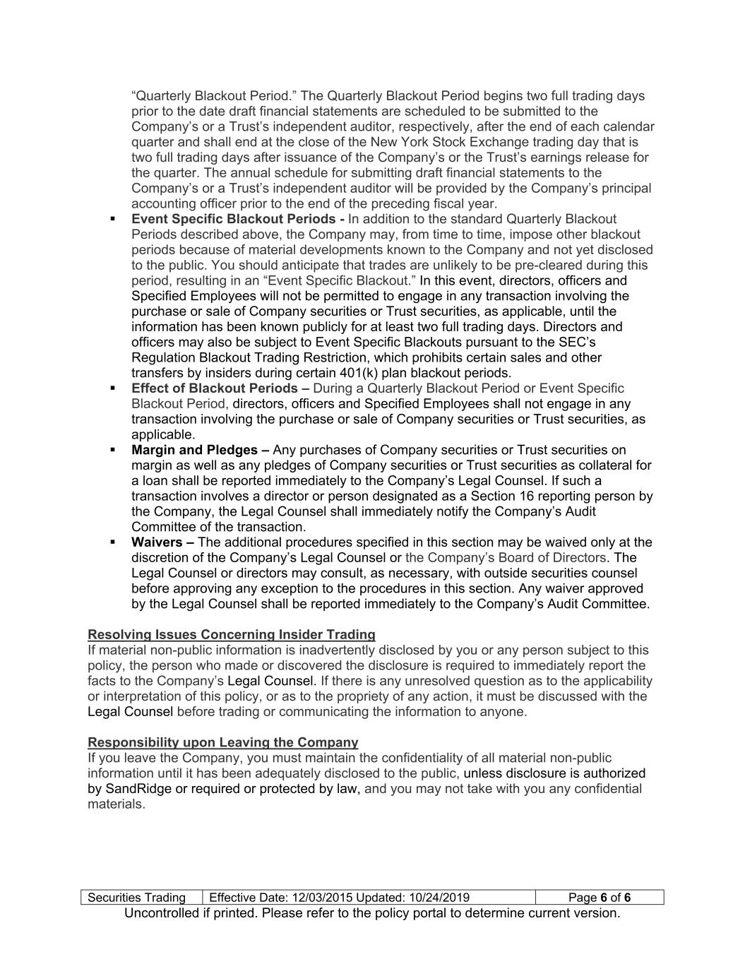 Securities Trading Effective Date: 12/03/2015 Updated: 10/24/2019 Page 6 of 6 Uncontrolled if printed. Please refer to the policy portal to determine current version. “Quarterly Blackout Period.” The Quarterly Blackout Period begins two full trading days prior to the date draft financial statements are scheduled to be submitted to the Company’s or a Trust’s independent auditor, respectively, after the end of each calendar quarter and shall end at the close of the New York Stock Exchange trading day that is two full trading days after issuance of the Company’s or the Trust’s earnings release for the quarter. The annual schedule for submitting draft financial statements to the Company’s or a Trust’s independent auditor will be provided by the Company’s principal accounting officer prior to the end of the preceding fiscal year. Event Specific Blackout Periods - In addition to the standard Quarterly Blackout Periods described above, the Company may, from time to time, impose other blackout periods because of material developments known to the Company and not yet disclosed to the public. You should anticipate that trades are unlikely to be pre-cleared during this period, resulting in an “Event Specific Blackout.” In this event, directors, officers and Specified Employees will not be permitted to engage in any transaction involving the purchase or sale of Company securities or Trust securities, as applicable, until the information has been known publicly for at least two full trading days. Directors and officers may also be subject to Event Specific Blackouts pursuant to the SEC’s Regulation Blackout Trading Restriction, which prohibits certain sales and other transfers by insiders during certain 401(k) plan blackout periods. Effect of Blackout Periods – During a Quarterly Blackout Period or Event Specific Blackout Period, directors, officers and Specified Employees shall not engage in any transaction involving the purchase or sale of Company securities or Trust securities, as applicable. Margin and Pledges – Any purchases of Company securities or Trust securities on margin as well as any pledges of Company securities or Trust securities as collateral for a loan shall be reported immediately to the Company’s Legal Counsel. If such a transaction involves a director or person designated as a Section 16 reporting person by the Company, the Legal Counsel shall immediately notify the Company’s Audit Committee of the transaction. Waivers – The additional procedures specified in this section may be waived only at the discretion of the Company’s Legal Counsel or the Company’s Board of Directors. The Legal Counsel or directors may consult, as necessary, with outside securities counsel before approving any exception to the procedures in this section. Any waiver approved by the Legal Counsel shall be reported immediately to the Company’s Audit Committee. Resolving Issues Concerning Insider Trading If material non-public information is inadvertently disclosed by you or any person subject to this policy, the person who made or discovered the disclosure is required to immediately report the facts to the Company’s Legal Counsel. If there is any unresolved question as to the applicability or interpretation of this policy, or as to the propriety of any action, it must be discussed with the Legal Counsel before trading or communicating the information to anyone. Responsibility upon Leaving the Company If you leave the Company, you must maintain the confidentiality of all material non-public information until it has been adequately disclosed to the public, unless disclosure is authorized by SandRidge or required or protected by law, and you may not take with you any confidential materials.