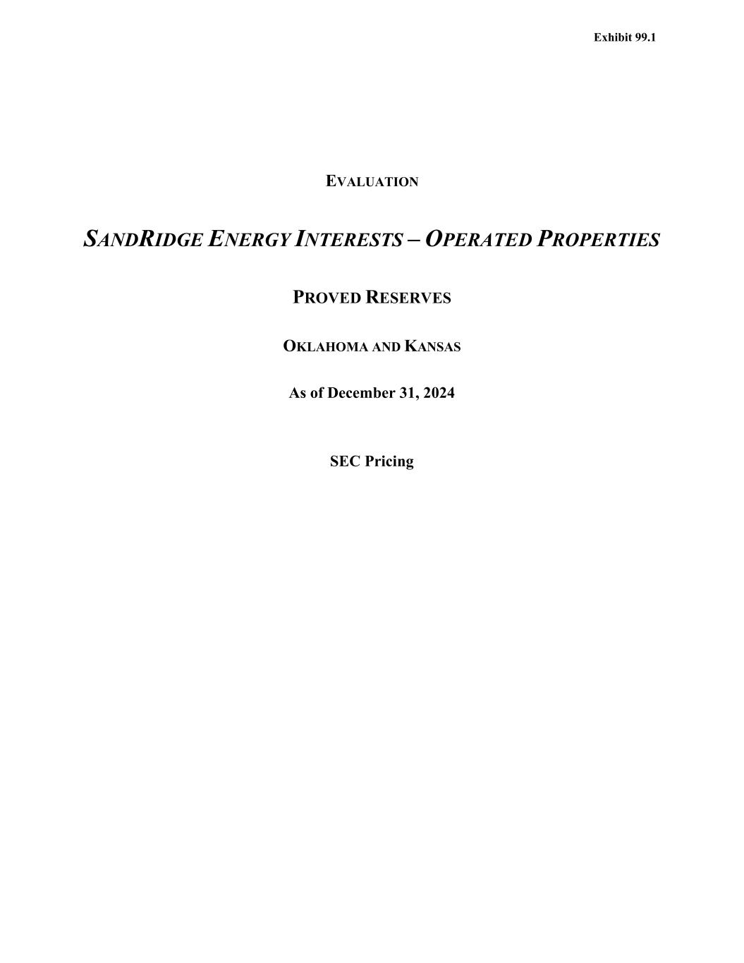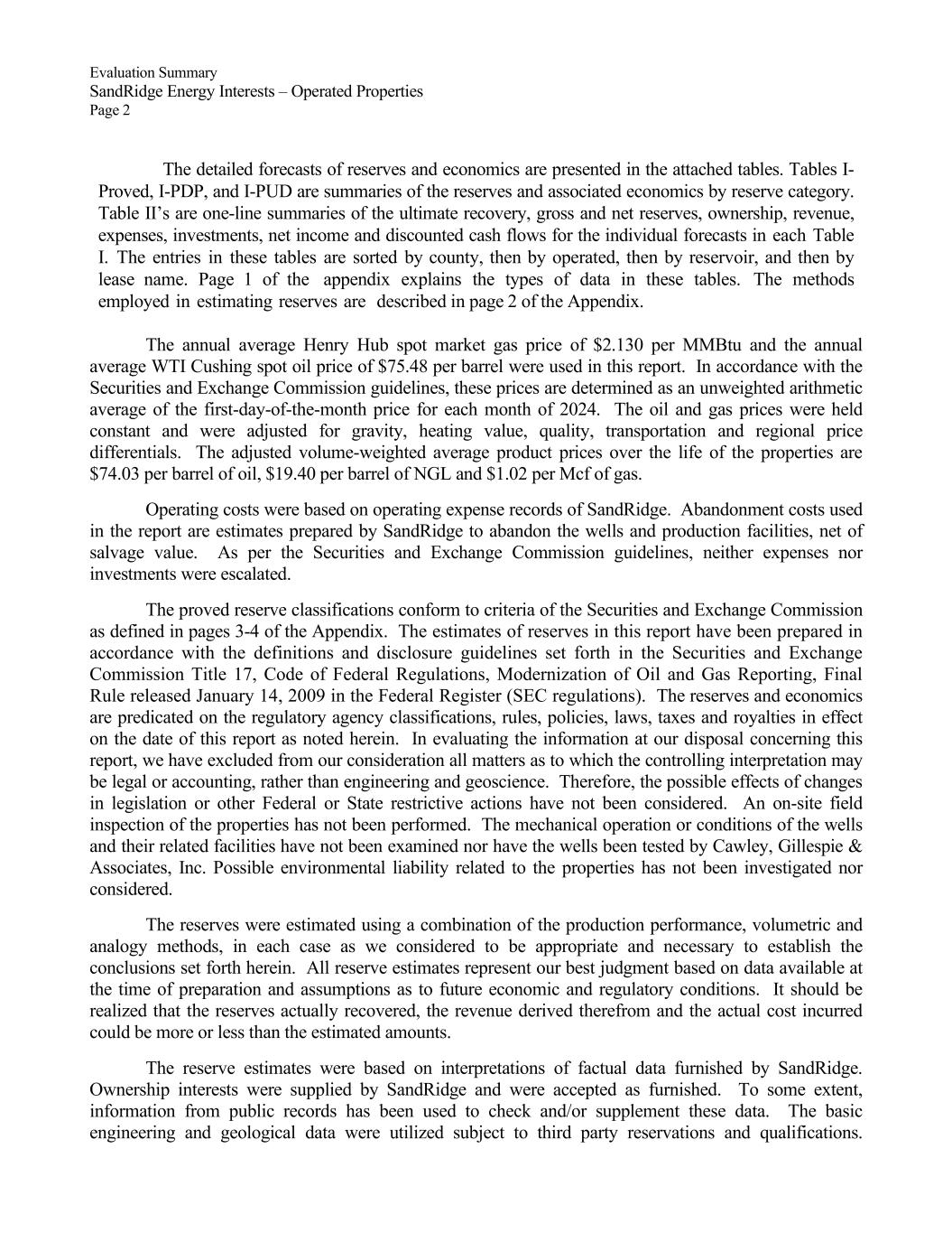 Evaluation Summary SandRidge Energy Interests – Operated Properties Page 2 The detailed forecasts of reserves and economics are presented in the attached tables. Tables I- Proved, I-PDP, and I-PUD are summaries of the reserves and associated economics by reserve category. Table II’s are one-line summaries of the ultimate recovery, gross and net reserves, ownership, revenue, expenses, investments, net income and discounted cash flows for the individual forecasts in each Table I. The entries in these tables are sorted by county, then by operated, then by reservoir, and then by lease name. Page 1 of the appendix explains the types of data in these tables. The methods employed in estimating reserves are described in page 2 of the Appendix. The annual average Henry Hub spot market gas price of $2.130 per MMBtu and the annual average WTI Cushing spot oil price of $75.48 per barrel were used in this report. In accordance with the Securities and Exchange Commission guidelines, these prices are determined as an unweighted arithmetic average of the first-day-of-the-month price for each month of 2024. The oil and gas prices were held constant and were adjusted for gravity, heating value, quality, transportation and regional price differentials. The adjusted volume-weighted average product prices over the life of the properties are $74.03 per barrel of oil, $19.40 per barrel of NGL and $1.02 per Mcf of gas. Operating costs were based on operating expense records of SandRidge. Abandonment costs used in the report are estimates prepared by SandRidge to abandon the wells and production facilities, net of salvage value. As per the Securities and Exchange Commission guidelines, neither expenses nor investments were escalated. The proved reserve classifications conform to criteria of the Securities and Exchange Commission as defined in pages 3-4 of the Appendix. The estimates of reserves in this report have been prepared in accordance with the definitions and disclosure guidelines set forth in the Securities and Exchange Commission Title 17, Code of Federal Regulations, Modernization of Oil and Gas Reporting, Final Rule released January 14, 2009 in the Federal Register (SEC regulations). The reserves and economics are predicated on the regulatory agency classifications, rules, policies, laws, taxes and royalties in effect on the date of this report as noted herein. In evaluating the information at our disposal concerning this report, we have excluded from our consideration all matters as to which the controlling interpretation may be legal or accounting, rather than engineering and geoscience. Therefore, the possible effects of changes in legislation or other Federal or State restrictive actions have not been considered. An on-site field inspection of the properties has not been performed. The mechanical operation or conditions of the wells and their related facilities have not been examined nor have the wells been tested by Cawley, Gillespie & Associates, Inc. Possible environmental liability related to the properties has not been investigated nor considered. The reserves were estimated using a combination of the production performance, volumetric and analogy methods, in each case as we considered to be appropriate and necessary to establish the conclusions set forth herein. All reserve estimates represent our best judgment based on data available at the time of preparation and assumptions as to future economic and regulatory conditions. It should be realized that the reserves actually recovered, the revenue derived therefrom and the actual cost incurred could be more or less than the estimated amounts. The reserve estimates were based on interpretations of factual data furnished by SandRidge. Ownership interests were supplied by SandRidge and were accepted as furnished. To some extent, information from public records has been used to check and/or supplement these data. The basic engineering and geological data were utilized subject to third party reservations and qualifications.