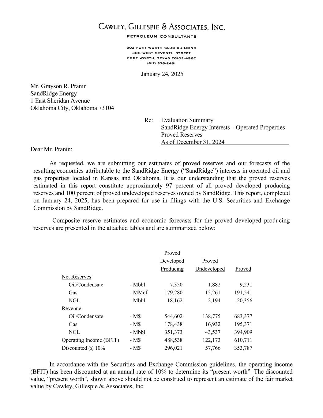 January 24, 2025 Mr. Grayson R. Pranin SandRidge Energy 1 East Sheridan Avenue Oklahoma City, Oklahoma 73104 Re: Evaluation Summary SandRidge Energy Interests – Operated Properties Proved Reserves As of December 31, 2024 Dear Mr. Pranin: As requested, we are submitting our estimates of proved reserves and our forecasts of the resulting economics attributable to the SandRidge Energy (“SandRidge”) interests in operated oil and gas properties located in Kansas and Oklahoma. It is our understanding that the proved reserves estimated in this report constitute approximately 97 percent of all proved developed producing reserves and 100 percent of proved undeveloped reserves owned by SandRidge. This report, completed on January 24, 2025, has been prepared for use in filings with the U.S. Securities and Exchange Commission by SandRidge. Composite reserve estimates and economic forecasts for the proved developed producing reserves are presented in the attached tables and are summarized below: Proved Developed Proved Producing Undeveloped Proved Net Reserves Oil/Condensate - Mbbl 7,350 1,882 9,231 Gas - MMcf 179,280 12,261 191,541 NGL - Mbbl 18,162 2,194 20,356 Revenue Oil/Condensate - M$ 544,602 138,775 683,377 Gas - M$ 178,438 16,932 195,371 NGL - Mbbl 351,373 43,537 394,909 Operating Income (BFIT) - M$ 488,538 122,173 610,711 Discounted @ 10% - M$ 296,021 57,766 353,787 In accordance with the Securities and Exchange Commission guidelines, the operating income (BFIT) has been discounted at an annual rate of 10% to determine its “present worth”. The discounted value, “present worth”, shown above should not be construed to represent an estimate of the fair market value by Cawley, Gillespie & Associates, Inc.