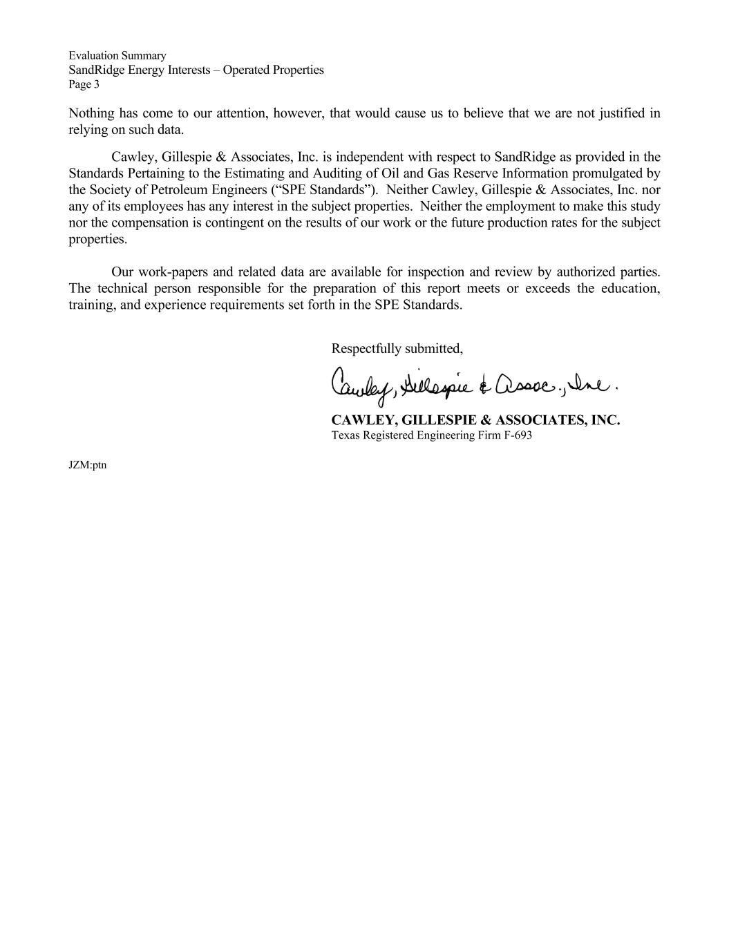 Evaluation Summary SandRidge Energy Interests – Operated Properties Page 3 Nothing has come to our attention, however, that would cause us to believe that we are not justified in relying on such data. Cawley, Gillespie & Associates, Inc. is independent with respect to SandRidge as provided in the Standards Pertaining to the Estimating and Auditing of Oil and Gas Reserve Information promulgated by the Society of Petroleum Engineers (“SPE Standards”). Neither Cawley, Gillespie & Associates, Inc. nor any of its employees has any interest in the subject properties. Neither the employment to make this study nor the compensation is contingent on the results of our work or the future production rates for the subject properties. Our work-papers and related data are available for inspection and review by authorized parties. The technical person responsible for the preparation of this report meets or exceeds the education, training, and experience requirements set forth in the SPE Standards. Respectfully submitted, CAWLEY, GILLESPIE & ASSOCIATES, INC. Texas Registered Engineering Firm F-693 JZM:ptn