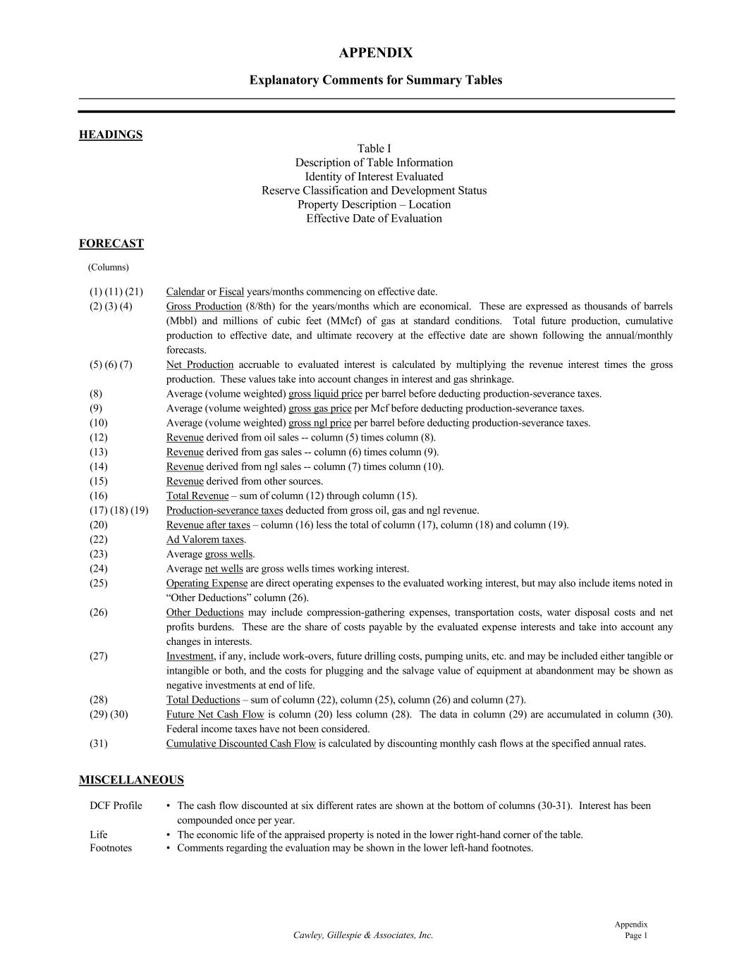 Appendix Cawley, Gillespie & Associates, Inc. Page 1 APPENDIX Explanatory Comments for Summary Tables HEADINGS Table I Description of Table Information Identity of Interest Evaluated Reserve Classification and Development Status Property Description – Location Effective Date of Evaluation FORECAST (Columns) (1) (11) (21) Calendar or Fiscal years/months commencing on effective date. (2) (3) (4) Gross Production (8/8th) for the years/months which are economical. These are expressed as thousands of barrels (Mbbl) and millions of cubic feet (MMcf) of gas at standard conditions. Total future production, cumulative production to effective date, and ultimate recovery at the effective date are shown following the annual/monthly forecasts. (5) (6) (7) Net Production accruable to evaluated interest is calculated by multiplying the revenue interest times the gross production. These values take into account changes in interest and gas shrinkage. (8) Average (volume weighted) gross liquid price per barrel before deducting production-severance taxes. (9) Average (volume weighted) gross gas price per Mcf before deducting production-severance taxes. (10) Average (volume weighted) gross ngl price per barrel before deducting production-severance taxes. (12) Revenue derived from oil sales -- column (5) times column (8). (13) Revenue derived from gas sales -- column (6) times column (9). (14) Revenue derived from ngl sales -- column (7) times column (10). (15) Revenue derived from other sources. (16) Total Revenue – sum of column (12) through column (15). (17) (18) (19) Production-severance taxes deducted from gross oil, gas and ngl revenue. (20) Revenue after taxes – column (16) less the total of column (17), column (18) and column (19). (22) Ad Valorem taxes. (23) Average gross wells. (24) Average net wells are gross wells times working interest. (25) Operating Expense are direct operating expenses to the evaluated working interest, but may also include items noted in “Other Deductions” column (26). (26) Other Deductions may include compression-gathering expenses, transportation costs, water disposal costs and net profits burdens. These are the share of costs payable by the evaluated expense interests and take into account any changes in interests. (27) Investment, if any, include work-overs, future drilling costs, pumping units, etc. and may be included either tangible or intangible or both, and the costs for plugging and the salvage value of equipment at abandonment may be shown as negative investments at end of life. (28) Total Deductions – sum of column (22), column (25), column (26) and column (27). (29) (30) Future Net Cash Flow is column (20) less column (28). The data in column (29) are accumulated in column (30). Federal income taxes have not been considered. (31) Cumulative Discounted Cash Flow is calculated by discounting monthly cash flows at the specified annual rates. MISCELLANEOUS DCF Profile • The cash flow discounted at six different rates are shown at the bottom of columns (30-31). Interest has been compounded once per year. Life • The economic life of the appraised property is noted in the lower right-hand corner of the table. Footnotes • Comments regarding the evaluation may be shown in the lower left-hand footnotes.
