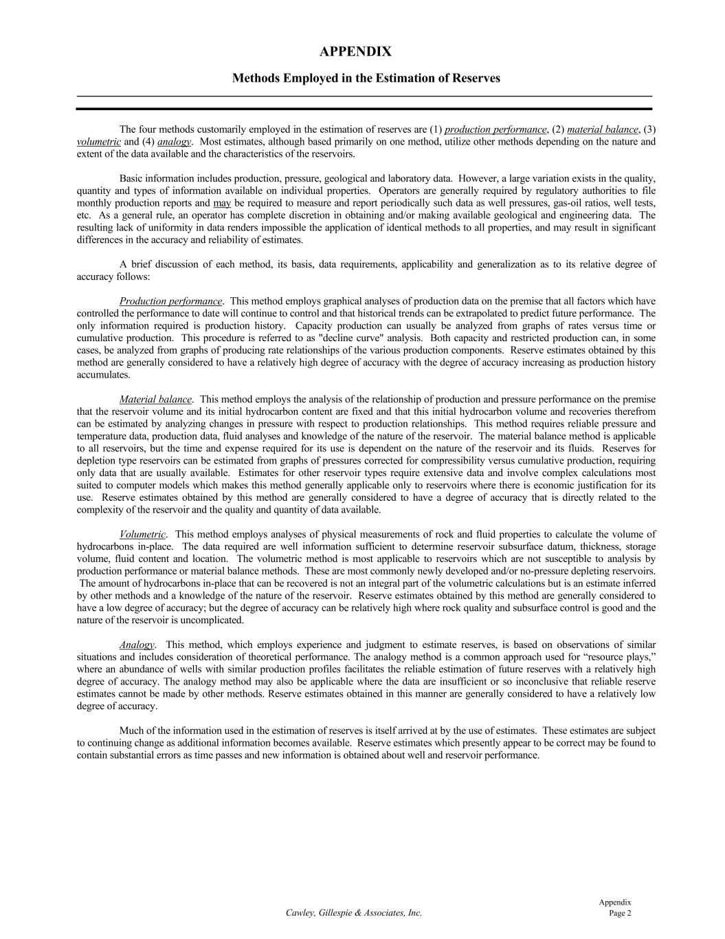 Appendix Cawley, Gillespie & Associates, Inc. Page 2 APPENDIX Methods Employed in the Estimation of Reserves The four methods customarily employed in the estimation of reserves are (1) production performance, (2) material balance, (3) volumetric and (4) analogy. Most estimates, although based primarily on one method, utilize other methods depending on the nature and extent of the data available and the characteristics of the reservoirs. Basic information includes production, pressure, geological and laboratory data. However, a large variation exists in the quality, quantity and types of information available on individual properties. Operators are generally required by regulatory authorities to file monthly production reports and may be required to measure and report periodically such data as well pressures, gas-oil ratios, well tests, etc. As a general rule, an operator has complete discretion in obtaining and/or making available geological and engineering data. The resulting lack of uniformity in data renders impossible the application of identical methods to all properties, and may result in significant differences in the accuracy and reliability of estimates. A brief discussion of each method, its basis, data requirements, applicability and generalization as to its relative degree of accuracy follows: Production performance. This method employs graphical analyses of production data on the premise that all factors which have controlled the performance to date will continue to control and that historical trends can be extrapolated to predict future performance. The only information required is production history. Capacity production can usually be analyzed from graphs of rates versus time or cumulative production. This procedure is referred to as "decline curve" analysis. Both capacity and restricted production can, in some cases, be analyzed from graphs of producing rate relationships of the various production components. Reserve estimates obtained by this method are generally considered to have a relatively high degree of accuracy with the degree of accuracy increasing as production history accumulates. Material balance. This method employs the analysis of the relationship of production and pressure performance on the premise that the reservoir volume and its initial hydrocarbon content are fixed and that this initial hydrocarbon volume and recoveries therefrom can be estimated by analyzing changes in pressure with respect to production relationships. This method requires reliable pressure and temperature data, production data, fluid analyses and knowledge of the nature of the reservoir. The material balance method is applicable to all reservoirs, but the time and expense required for its use is dependent on the nature of the reservoir and its fluids. Reserves for depletion type reservoirs can be estimated from graphs of pressures corrected for compressibility versus cumulative production, requiring only data that are usually available. Estimates for other reservoir types require extensive data and involve complex calculations most suited to computer models which makes this method generally applicable only to reservoirs where there is economic justification for its use. Reserve estimates obtained by this method are generally considered to have a degree of accuracy that is directly related to the complexity of the reservoir and the quality and quantity of data available. Volumetric. This method employs analyses of physical measurements of rock and fluid properties to calculate the volume of hydrocarbons in-place. The data required are well information sufficient to determine reservoir subsurface datum, thickness, storage volume, fluid content and location. The volumetric method is most applicable to reservoirs which are not susceptible to analysis by production performance or material balance methods. These are most commonly newly developed and/or no-pressure depleting reservoirs. The amount of hydrocarbons in-place that can be recovered is not an integral part of the volumetric calculations but is an estimate inferred by other methods and a knowledge of the nature of the reservoir. Reserve estimates obtained by this method are generally considered to have a low degree of accuracy; but the degree of accuracy can be relatively high where rock quality and subsurface control is good and the nature of the reservoir is uncomplicated. Analogy. This method, which employs experience and judgment to estimate reserves, is based on observations of similar situations and includes consideration of theoretical performance. The analogy method is a common approach used for “resource plays,” where an abundance of wells with similar production profiles facilitates the reliable estimation of future reserves with a relatively high degree of accuracy. The analogy method may also be applicable where the data are insufficient or so inconclusive that reliable reserve estimates cannot be made by other methods. Reserve estimates obtained in this manner are generally considered to have a relatively low degree of accuracy. Much of the information used in the estimation of reserves is itself arrived at by the use of estimates. These estimates are subject to continuing change as additional information becomes available. Reserve estimates which presently appear to be correct may be found to contain substantial errors as time passes and new information is obtained about well and reservoir performance.