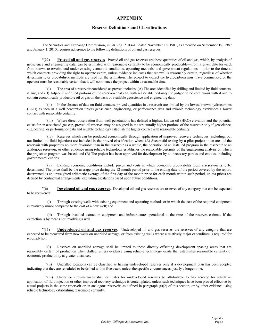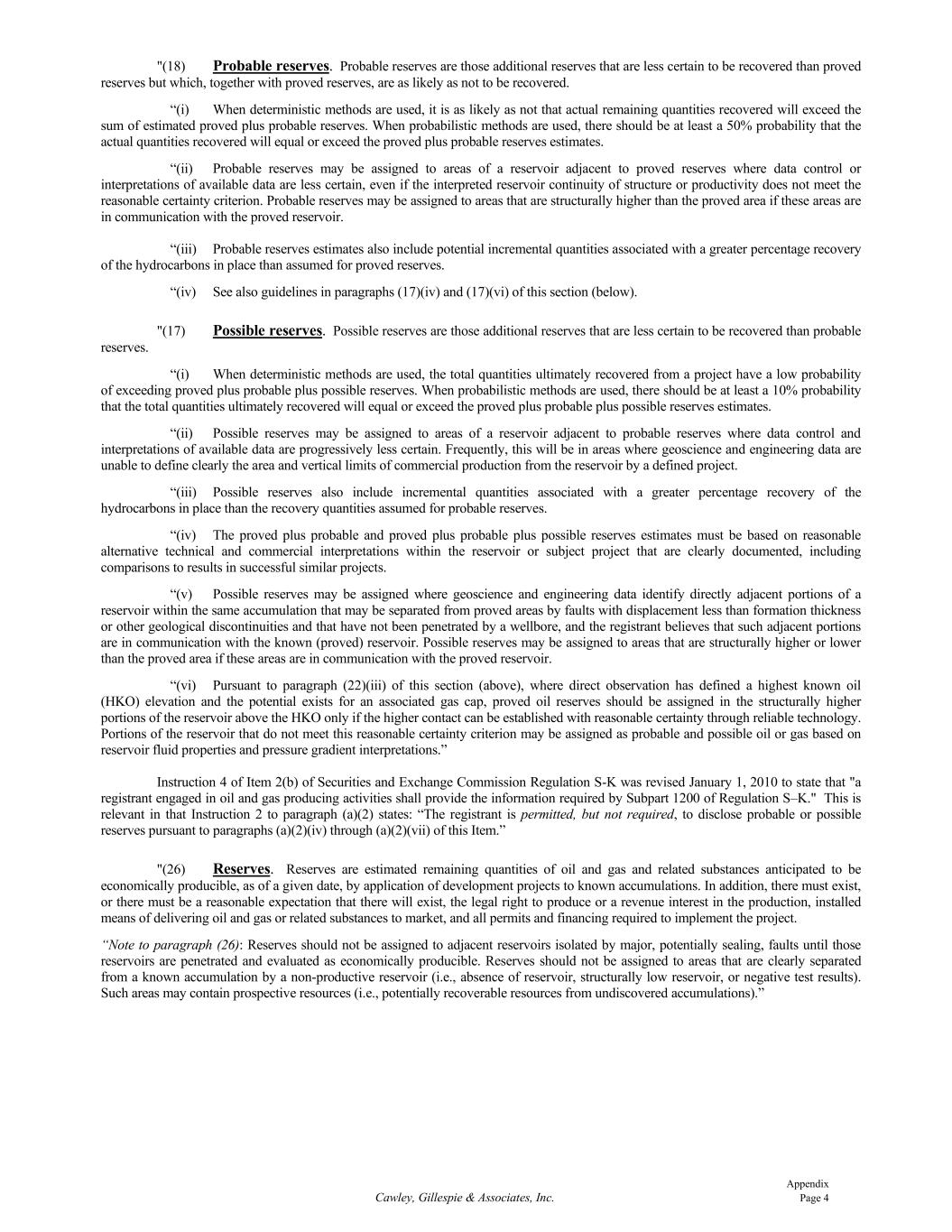 Appendix Cawley, Gillespie & Associates, Inc. Page 4 "(18) Probable reserves. Probable reserves are those additional reserves that are less certain to be recovered than proved reserves but which, together with proved reserves, are as likely as not to be recovered. “(i) When deterministic methods are used, it is as likely as not that actual remaining quantities recovered will exceed the sum of estimated proved plus probable reserves. When probabilistic methods are used, there should be at least a 50% probability that the actual quantities recovered will equal or exceed the proved plus probable reserves estimates. “(ii) Probable reserves may be assigned to areas of a reservoir adjacent to proved reserves where data control or interpretations of available data are less certain, even if the interpreted reservoir continuity of structure or productivity does not meet the reasonable certainty criterion. Probable reserves may be assigned to areas that are structurally higher than the proved area if these areas are in communication with the proved reservoir. “(iii) Probable reserves estimates also include potential incremental quantities associated with a greater percentage recovery of the hydrocarbons in place than assumed for proved reserves. “(iv) See also guidelines in paragraphs (17)(iv) and (17)(vi) of this section (below). "(17) Possible reserves. Possible reserves are those additional reserves that are less certain to be recovered than probable reserves. “(i) When deterministic methods are used, the total quantities ultimately recovered from a project have a low probability of exceeding proved plus probable plus possible reserves. When probabilistic methods are used, there should be at least a 10% probability that the total quantities ultimately recovered will equal or exceed the proved plus probable plus possible reserves estimates. “(ii) Possible reserves may be assigned to areas of a reservoir adjacent to probable reserves where data control and interpretations of available data are progressively less certain. Frequently, this will be in areas where geoscience and engineering data are unable to define clearly the area and vertical limits of commercial production from the reservoir by a defined project. “(iii) Possible reserves also include incremental quantities associated with a greater percentage recovery of the hydrocarbons in place than the recovery quantities assumed for probable reserves. “(iv) The proved plus probable and proved plus probable plus possible reserves estimates must be based on reasonable alternative technical and commercial interpretations within the reservoir or subject project that are clearly documented, including comparisons to results in successful similar projects. “(v) Possible reserves may be assigned where geoscience and engineering data identify directly adjacent portions of a reservoir within the same accumulation that may be separated from proved areas by faults with displacement less than formation thickness or other geological discontinuities and that have not been penetrated by a wellbore, and the registrant believes that such adjacent portions are in communication with the known (proved) reservoir. Possible reserves may be assigned to areas that are structurally higher or lower than the proved area if these areas are in communication with the proved reservoir. “(vi) Pursuant to paragraph (22)(iii) of this section (above), where direct observation has defined a highest known oil (HKO) elevation and the potential exists for an associated gas cap, proved oil reserves should be assigned in the structurally higher portions of the reservoir above the HKO only if the higher contact can be established with reasonable certainty through reliable technology. Portions of the reservoir that do not meet this reasonable certainty criterion may be assigned as probable and possible oil or gas based on reservoir fluid properties and pressure gradient interpretations.” Instruction 4 of Item 2(b) of Securities and Exchange Commission Regulation S-K was revised January 1, 2010 to state that "a registrant engaged in oil and gas producing activities shall provide the information required by Subpart 1200 of Regulation S–K." This is relevant in that Instruction 2 to paragraph (a)(2) states: “The registrant is permitted, but not required, to disclose probable or possible reserves pursuant to paragraphs (a)(2)(iv) through (a)(2)(vii) of this Item.” "(26) Reserves. Reserves are estimated remaining quantities of oil and gas and related substances anticipated to be economically producible, as of a given date, by application of development projects to known accumulations. In addition, there must exist, or there must be a reasonable expectation that there will exist, the legal right to produce or a revenue interest in the production, installed means of delivering oil and gas or related substances to market, and all permits and financing required to implement the project. “Note to paragraph (26): Reserves should not be assigned to adjacent reservoirs isolated by major, potentially sealing, faults until those reservoirs are penetrated and evaluated as economically producible. Reserves should not be assigned to areas that are clearly separated from a known accumulation by a non-productive reservoir (i.e., absence of reservoir, structurally low reservoir, or negative test results). Such areas may contain prospective resources (i.e., potentially recoverable resources from undiscovered accumulations).”