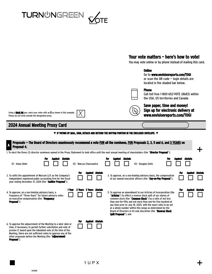 4. To approve, on a non-binding advisory basis, afrequency of "Three Years" for future advisory voteson executive compensation (the "FrequencyProposal");2Years3YearsAbstain1YearProposals?TheBoardofDirectorsrecommendavoteFORallthenomineeslisted,FORProposalsX?XandforeveryXYEARSonProposalX.1UPX01 - Amos Kohn02 - Marcus CharuvastraForAgainstAbstainForAgainstAbstain03 - Douglas GintzForAgainstAbstainUsing a blackinkpen, mark your votes with an Xas shown in this example.Please do not write outside the designated areas.040IRB++2. To ratify the appointment of Marcum LLP, as the Company'sindependent registered public accounting firm for the fiscalyear ending December 31, 2024 (the "AuditorProposal"); 3. To approve, on a non-binding advisory basis, the compensationof our named executive officers (the "Say-on-PayProposal");ForAgainstAbstain6. To approve the adjournment of the Meeting to a later date ortime, if necessary, to permit further solicitation and vote ofproxies if, based upon the tabulated vote at the time of theMeeting, there are not sufficient votes to approve any of theother proposals before the Meeting (the "AdjournmentProposal").ForAgainstAbstain5. To approve an amendment to our Articles of Incorporation (the"Articles") to effect a reverse stock split of our shares ofcommon stock (the "CommonStock") by a ratio of not lessthan one-for-fifty and not more than one-for-five hundred atany time prior to July 18, 2025, with the exact ratio to be setat a whole number within this range as determined by theBoard of Directors in its sole discretion (the "ReverseStockSplitProposal"); and qIFVOTINGBYMAIL,SIGN,DETACHANDRETURNTHEBOTTOMPORTIONINTHEENCLOSEDENVELOPE.q2024AnnualMeetingProxyCardForAgainstAbstainForAgainstAbstainProposals?TheBoardofDirectorsunanimouslyrecommendavoteFORallthenominees,FORProposals2,3,5and6,and3YEARSonProposal4.A1. To elect the three (3) director nominees named in the Proxy Statement to hold office until the next annual meeting of shareholders (the "DirectorProposal");You may vote online or by phone instead of mailing this card.OnlineGo to www.envisionreports.com/TOGIor scan the QR code ? login details arelocated in the shaded bar below.Savepaper,timeandmoney!Signupforelectronicdeliveryatwww.envisionreports.com/TOGIPhoneCall toll free 1-800-652-VOTE (8683) withinthe USA, US territories and CanadaYourvotematters?here'showtovote!