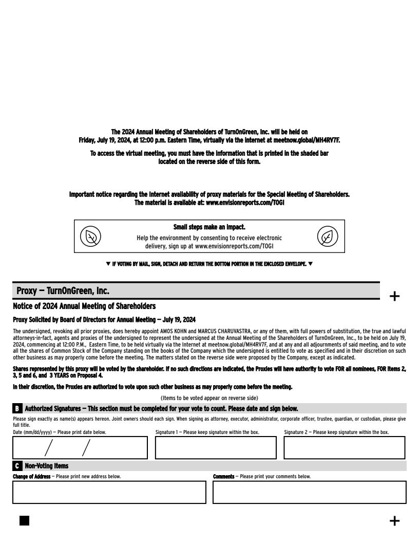 Notice of 2024 Annual Meeting of ShareholdersProxy Solicited by Board of Directors for Annual Meeting ? July 19, 2024The undersigned, revoking all prior proxies, does hereby appoint AMOS KOHN and MARCUS CHARUVASTRA, or any of them, with full powers of substitution, the true and lawfulattorneys-in-fact, agents and proxies of the undersigned to represent the undersigned at the Annual Meeting of the Shareholders of TurnOnGreen, Inc., to be held on July 19,2024, commencing at 12:00 P.M., Eastern Time, to be held virtually via the Internet at meetnow.global/MH4RV7F, and at any and all adjournments of said meeting, and to voteall the shares of Common Stock of the Company standing on the books of the Company which the undersigned is entitled to vote as specified and in their discretion on suchother business as may properly come before the meeting. The matters stated on the reverse side were proposed by the Company, except as indicated.Shares represented by this proxy will be voted by the shareholder. If no such directions are indicated, the Proxies will have authority to vote FOR all nominees, FOR items 2,3, 5 and 6, and 3 YEARS on Proposal 4.In their discretion, the Proxies are authorized to vote upon such other business as may properly come before the meeting.(Items to be voted appear on reverse side)Proxy ? TurnOnGreen, Inc.qIF VOTING BY MAIL, SIGN, DETACH AND RETURN THE BOTTOM PORTION IN THE ENCLOSED ENVELOPE.q++Please sign exactly as name(s) appears hereon. Joint owners should each sign. When signing as attorney, executor, administrator, corporate officer, trustee, guardian, or custodian, please give full title.Signature 1 ? Please keep signature within the box.Signature 2 ? Please keep signature within the box.Date (mm/dd/yyyy) ? Please print date below.Authorized Signatures ? This section must be completed for your vote to count. Please date and sign below.BImportant notice regarding the Internet availability of proxy materials for the Special Meeting of Shareholders. The material is available at: www.edocumentview.com/TOGI