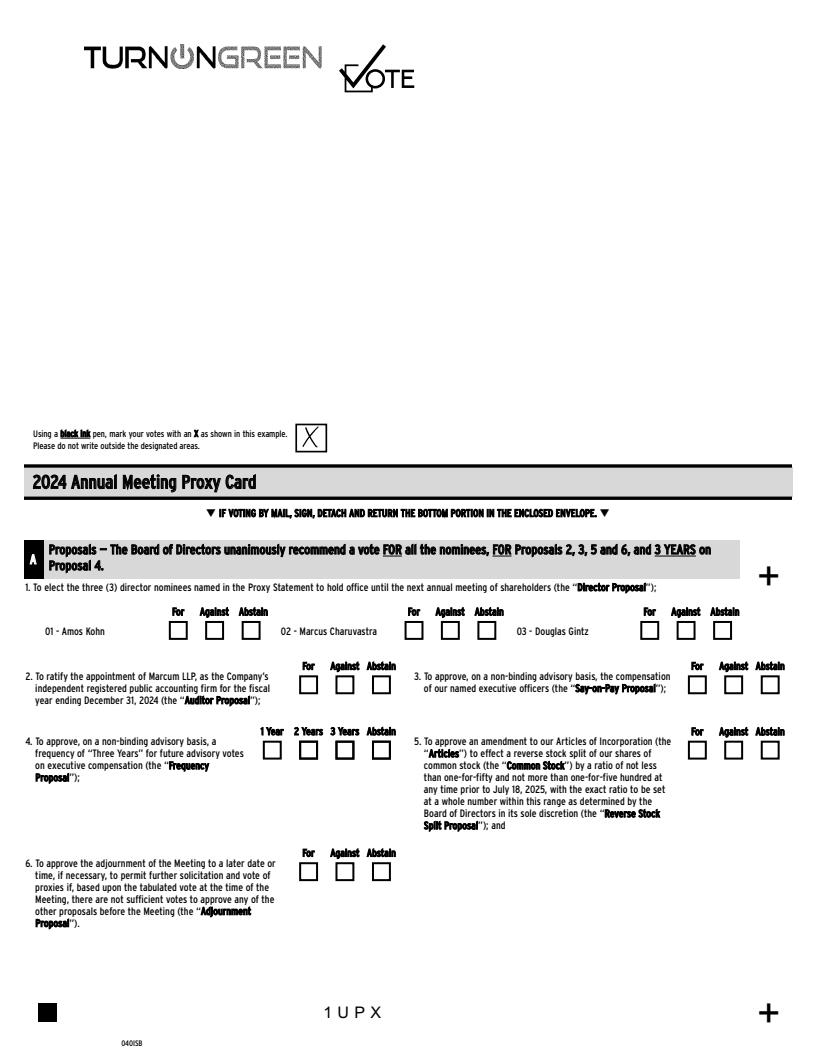 Small steps make an impact.Help the environment by consenting to receive electronic delivery, sign up at www.envisionreports.com/TOGINotice of 2024 Annual Meeting of ShareholdersProxy Solicited by Board of Directors for Annual Meeting ? July 19, 2024The undersigned, revoking all prior proxies, does hereby appoint AMOS KOHN and MARCUS CHARUVASTRA, or any of them, with full powers of substitution, the true and lawfulattorneys-in-fact, agents and proxies of the undersigned to represent the undersigned at the Annual Meeting of the Shareholders of TurnOnGreen, Inc., to be held on July 19,2024, commencing at 12:00 P.M., Eastern Time, to be held virtually via the Internet at meetnow.global/MH4RV7F, and at any and all adjournments of said meeting, and to voteall the shares of Common Stock of the Company standing on the books of the Company which the undersigned is entitled to vote as specified and in their discretion on suchother business as may properly come before the meeting. The matters stated on the reverse side were proposed by the Company, except as indicated.Shares represented by this proxy will be voted by the shareholder. If no such directions are indicated, the Proxies will have authority to vote FOR all nominees, FOR items 2,3, 5 and 6, and 3 YEARS on Proposal 4.In their discretion, the Proxies are authorized to vote upon such other business as may properly come before the meeting.(Items to be voted appear on reverse side)Proxy ? TurnOnGreen, Inc.qIF VOTING BY MAIL, SIGN, DETACH AND RETURN THE BOTTOM PORTION IN THE ENCLOSED ENVELOPE.qChange of Address ?Please print new address below.Comments? Please print your comments below.Non-Voting ItemsC++Please sign exactly as name(s) appears hereon. Joint owners should each sign. When signing as attorney, executor, administrator, corporate officer, trustee, guardian, or custodian, please give full title.Signature 1 ? Please keep signature within the box.Signature 2 ? Please keep signature within the box.Date (mm/dd/yyyy) ? Please print date below.Authorized Signatures ? This section must be completed for your vote to count. Please date and sign below.BImportant notice regarding the Internet availability of proxy materials for the Special Meeting of Shareholders. The material is available at: www.envisionreports.com/TOGIThe 2024 Annual Meeting of Shareholders of TurnOnGreen, Inc. will be held on Friday, July 19, 2024, at 12:00 p.m. Eastern Time, virtually via the internet at meetnow.global/MH4RV7F.To access the virtual meeting, you must have the information that is printed in the shaded bar located on the reverse side of this form.
