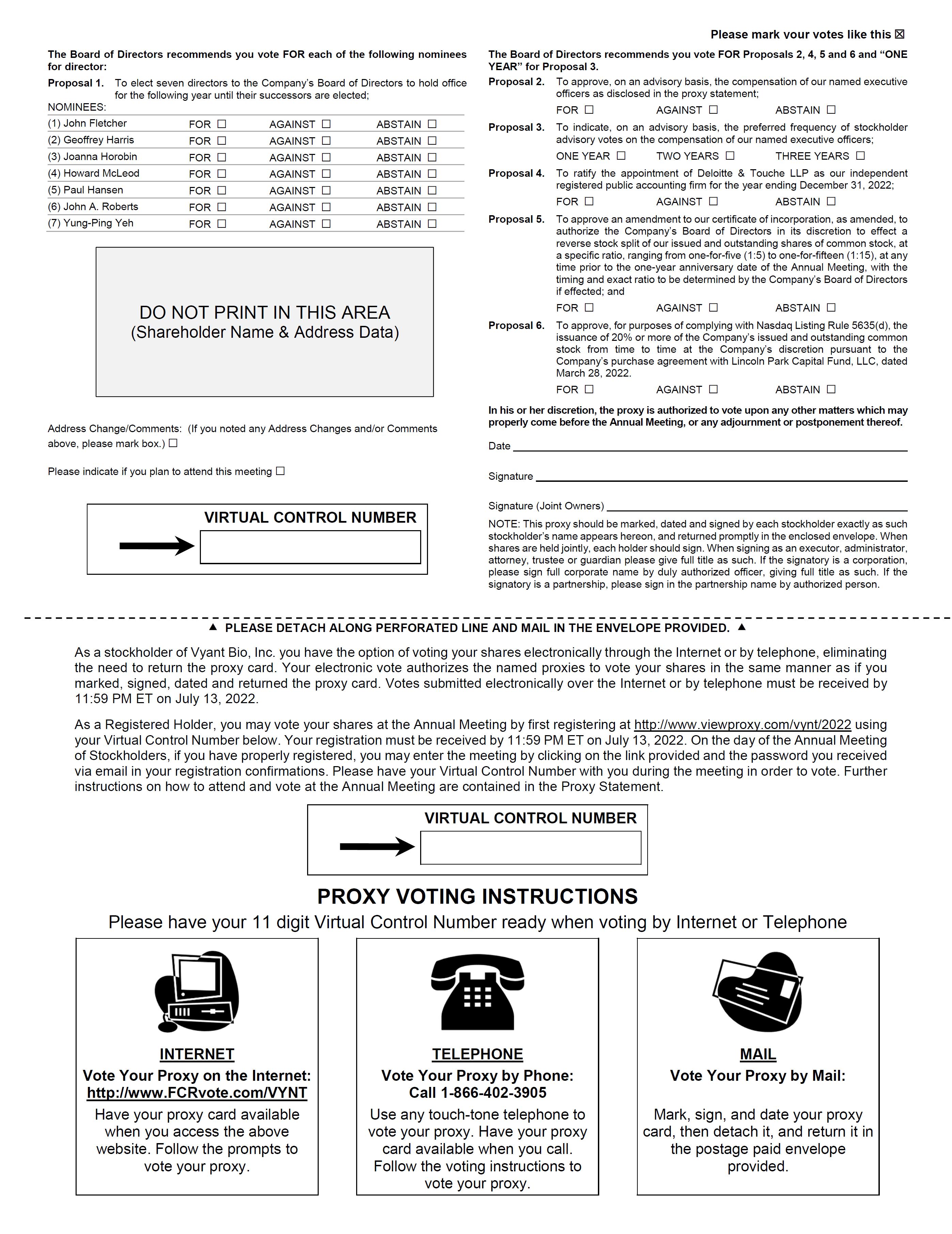 5. In Person at the Annual Meeting – You will have the right to vote at the Annual Meeting. You will have the right to vote on the day of, or during, the Annual Meeting at www.viewproxy.com/VYNT/2022, but the site will only record votes from attending stockholders. To demonstrate proof of stock ownership, you will need to enter the control number received with your Notice, proxy card or voting instruction form to vote at our Annual Meeting.
