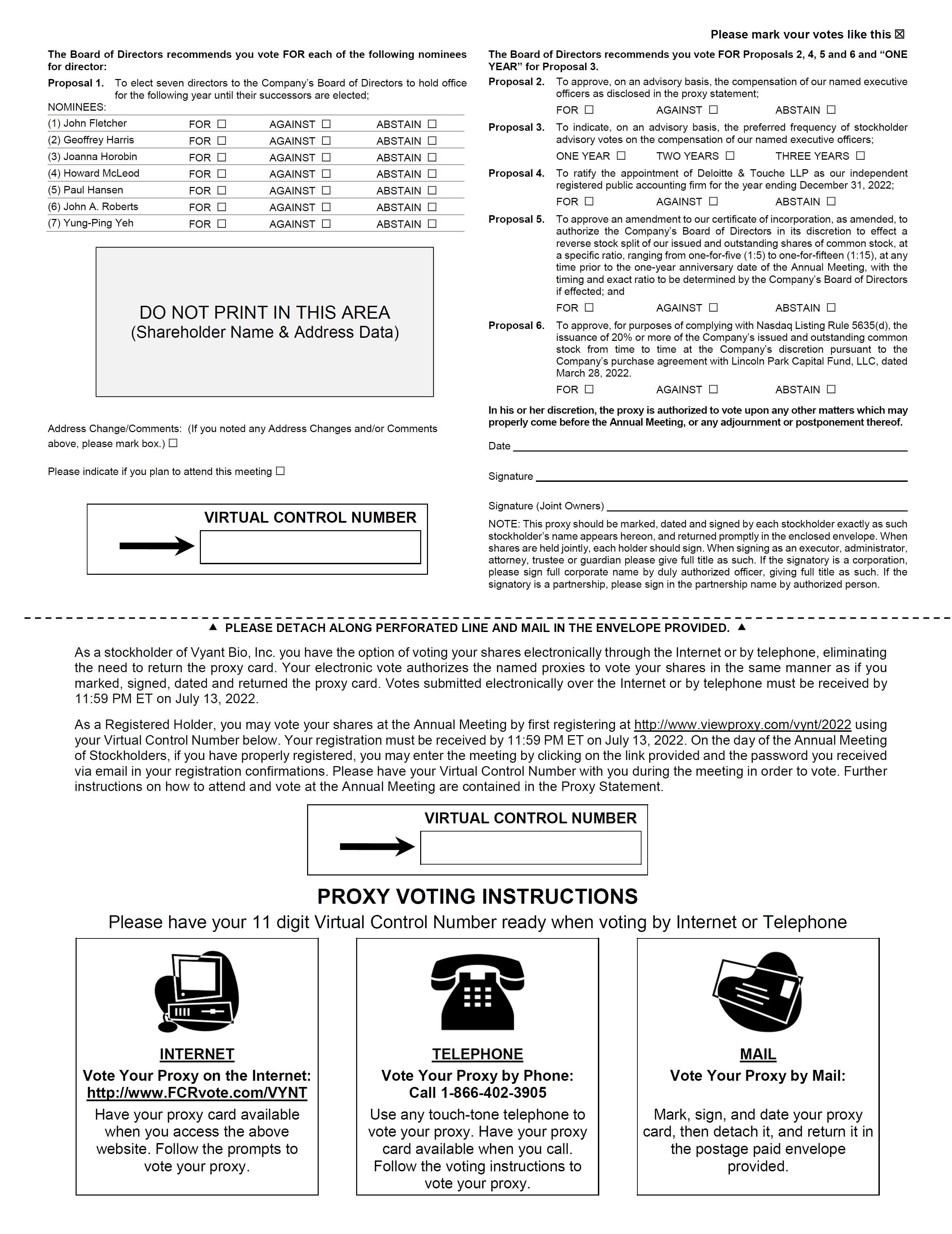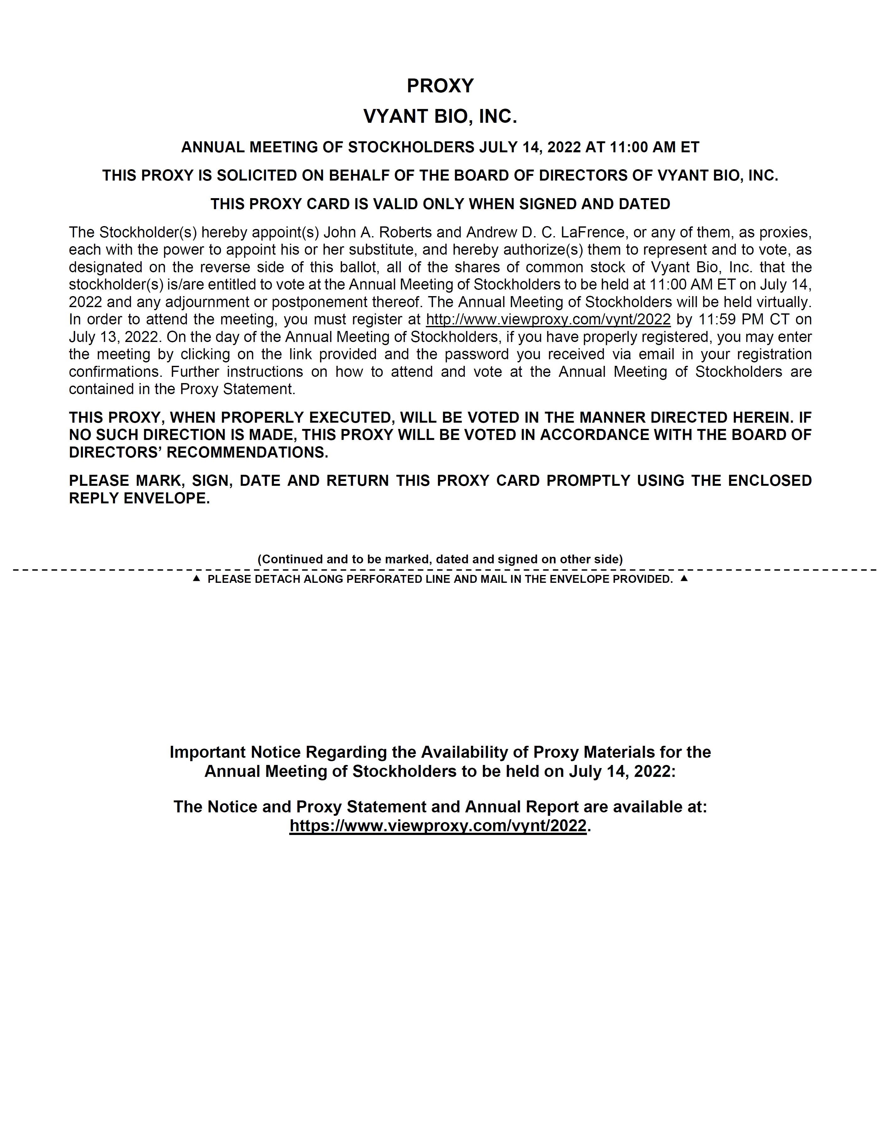 NOTICE IS HEREBY GIVEN that the Annual Meeting of Stockholders (the “Annual Meeting”) of Vyant Bio, Inc. (the “Company”, “we”, “us”, and “our”) will be held on Thursday, July 14, 2022 at 11:00 a.m. Eastern Time. In light of the coronavirus pandemic, and in the best interests of public health and the health and safety of our stockholders, employees and Board of Directors, we are planning to hold the Annual Meeting virtually via the Internet. In order to attend the meeting, you must register at http://www.viewproxy.com/vynt/2022 by 11:59 PM ET on July 13, 2022. On the day of the Annual Meeting, if you have properly registered, you may enter the meeting by clicking on the link provided and entering the password you received via email in your registration confirmations. You will not be able to attend the Annual Meeting at a physical location. At the Annual Meeting, stockholders will act on the following matters: