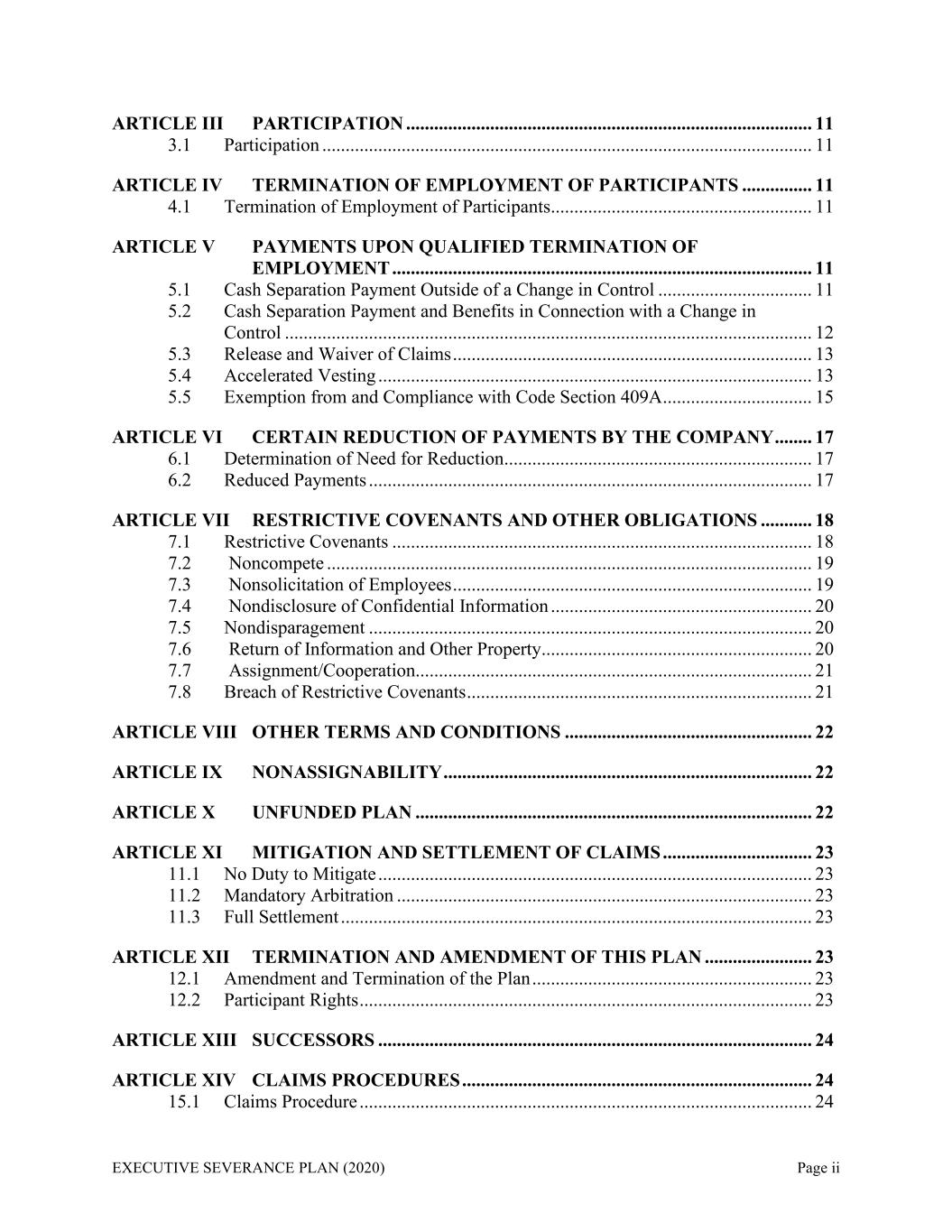 EXECUTIVE SEVERANCE PLAN (2020) Page ii ARTICLE III PARTICIPATION ....................................................................................... 11 3.1 Participation ......................................................................................................... 11 ARTICLE IV TERMINATION OF EMPLOYMENT OF PARTICIPANTS ............... 11 4.1 Termination of Employment of Participants........................................................ 11 ARTICLE V PAYMENTS UPON QUALIFIED TERMINATION OF EMPLOYMENT .......................................................................................... 11 5.1 Cash Separation Payment Outside of a Change in Control ................................. 11 5.2 Cash Separation Payment and Benefits in Connection with a Change in Control ................................................................................................................. 12 5.3 Release and Waiver of Claims ............................................................................. 13 5.4 Accelerated Vesting ............................................................................................. 13 5.5 Exemption from and Compliance with Code Section 409A ................................ 15 ARTICLE VI CERTAIN REDUCTION OF PAYMENTS BY THE COMPANY ........ 17 6.1 Determination of Need for Reduction .................................................................. 17 6.2 Reduced Payments ............................................................................................... 17 ARTICLE VII RESTRICTIVE COVENANTS AND OTHER OBLIGATIONS ........... 18 7.1 Restrictive Covenants .......................................................................................... 18 7.2 Noncompete ........................................................................................................ 19 7.3 Nonsolicitation of Employees ............................................................................. 19 7.4 Nondisclosure of Confidential Information ........................................................ 20 7.5 Nondisparagement ............................................................................................... 20 7.6 Return of Information and Other Property.......................................................... 20 7.7 Assignment/Cooperation..................................................................................... 21 7.8 Breach of Restrictive Covenants .......................................................................... 21 ARTICLE VIII OTHER TERMS AND CONDITIONS ..................................................... 22 ARTICLE IX NONASSIGNABILITY ............................................................................... 22 ARTICLE X UNFUNDED PLAN ..................................................................................... 22 ARTICLE XI MITIGATION AND SETTLEMENT OF CLAIMS ................................ 23 11.1 No Duty to Mitigate ............................................................................................. 23 11.2 Mandatory Arbitration ......................................................................................... 23 11.3 Full Settlement ..................................................................................................... 23 ARTICLE XII TERMINATION AND AMENDMENT OF THIS PLAN ....................... 23 12.1 Amendment and Termination of the Plan ............................................................ 23 12.2 Participant Rights ................................................................................................. 23 ARTICLE XIII SUCCESSORS ............................................................................................. 24 ARTICLE XIV CLAIMS PROCEDURES ........................................................................... 24 15.1 Claims Procedure ................................................................................................. 24