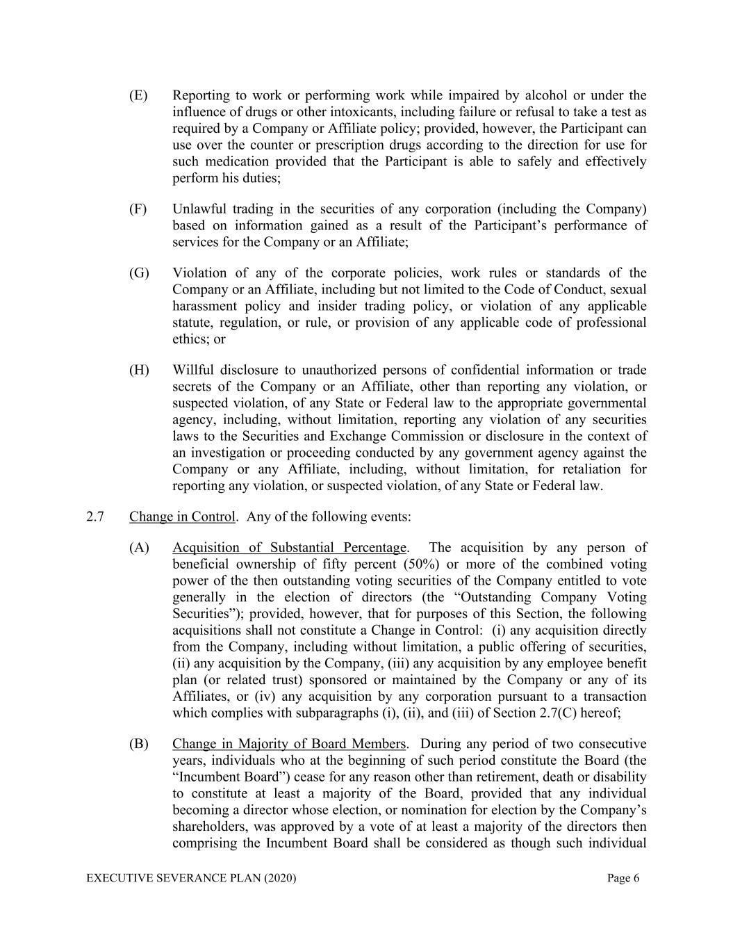 EXECUTIVE SEVERANCE PLAN (2020) Page 6 (E) Reporting to work or performing work while impaired by alcohol or under the influence of drugs or other intoxicants, including failure or refusal to take a test as required by a Company or Affiliate policy; provided, however, the Participant can use over the counter or prescription drugs according to the direction for use for such medication provided that the Participant is able to safely and effectively perform his duties; (F) Unlawful trading in the securities of any corporation (including the Company) based on information gained as a result of the Participant’s performance of services for the Company or an Affiliate; (G) Violation of any of the corporate policies, work rules or standards of the Company or an Affiliate, including but not limited to the Code of Conduct, sexual harassment policy and insider trading policy, or violation of any applicable statute, regulation, or rule, or provision of any applicable code of professional ethics; or (H) Willful disclosure to unauthorized persons of confidential information or trade secrets of the Company or an Affiliate, other than reporting any violation, or suspected violation, of any State or Federal law to the appropriate governmental agency, including, without limitation, reporting any violation of any securities laws to the Securities and Exchange Commission or disclosure in the context of an investigation or proceeding conducted by any government agency against the Company or any Affiliate, including, without limitation, for retaliation for reporting any violation, or suspected violation, of any State or Federal law. 2.7 Change in Control. Any of the following events: (A) Acquisition of Substantial Percentage. The acquisition by any person of beneficial ownership of fifty percent (50%) or more of the combined voting power of the then outstanding voting securities of the Company entitled to vote generally in the election of directors (the “Outstanding Company Voting Securities”); provided, however, that for purposes of this Section, the following acquisitions shall not constitute a Change in Control: (i) any acquisition directly from the Company, including without limitation, a public offering of securities, (ii) any acquisition by the Company, (iii) any acquisition by any employee benefit plan (or related trust) sponsored or maintained by the Company or any of its Affiliates, or (iv) any acquisition by any corporation pursuant to a transaction which complies with subparagraphs (i), (ii), and (iii) of Section 2.7(C) hereof; (B) Change in Majority of Board Members. During any period of two consecutive years, individuals who at the beginning of such period constitute the Board (the “Incumbent Board”) cease for any reason other than retirement, death or disability to constitute at least a majority of the Board, provided that any individual becoming a director whose election, or nomination for election by the Company’s shareholders, was approved by a vote of at least a majority of the directors then comprising the Incumbent Board shall be considered as though such individual