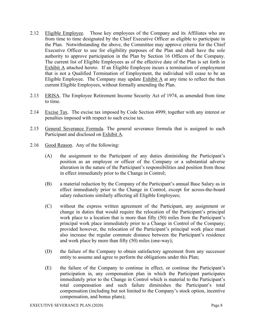 EXECUTIVE SEVERANCE PLAN (2020) Page 8 2.12 Eligible Employee. Those key employees of the Company and its Affiliates who are from time to time designated by the Chief Executive Officer as eligible to participate in the Plan. Notwithstanding the above, the Committee may approve criteria for the Chief Executive Officer to use for eligibility purposes of the Plan and shall have the sole authority to approve participation in the Plan by Section 16 Officers of the Company. The current list of Eligible Employees as of the effective date of the Plan is set forth in Exhibit A attached hereto. If an Eligible Employee incurs a termination of employment that is not a Qualified Termination of Employment, the individual will cease to be an Eligible Employee. The Company may update Exhibit A at any time to reflect the then current Eligible Employees, without formally amending the Plan. 2.13 ERISA. The Employee Retirement Income Security Act of 1974, as amended from time to time. 2.14 Excise Tax. The excise tax imposed by Code Section 4999, together with any interest or penalties imposed with respect to such excise tax. 2.15 General Severance Formula. The general severance formula that is assigned to each Participant and disclosed on Exhibit A. 2.16 Good Reason. Any of the following: (A) the assignment to the Participant of any duties diminishing the Participant’s position as an employee or officer of the Company or a substantial adverse alteration in the nature of the Participant’s responsibilities and position from those in effect immediately prior to the Change in Control; (B) a material reduction by the Company of the Participant’s annual Base Salary as in effect immediately prior to the Change in Control, except for across-the-board salary reductions similarly affecting all Eligible Employees; (C) without the express written agreement of the Participant, any assignment or change in duties that would require the relocation of the Participant’s principal work place to a location that is more than fifty (50) miles from the Participant’s principal work place immediately prior to a Change in Control of the Company; provided however, the relocation of the Participant’s principal work place must also increase the regular commute distance between the Participant’s residence and work place by more than fifty (50) miles (one-way); (D) the failure of the Company to obtain satisfactory agreement from any successor entity to assume and agree to perform the obligations under this Plan; (E) the failure of the Company to continue in effect, or continue the Participant’s participation in, any compensation plan in which the Participant participates immediately prior to the Change in Control which is material to the Participant’s total compensation and such failure diminishes the Participant’s total compensation (including but not limited to the Company’s stock option, incentive compensation, and bonus plans);
