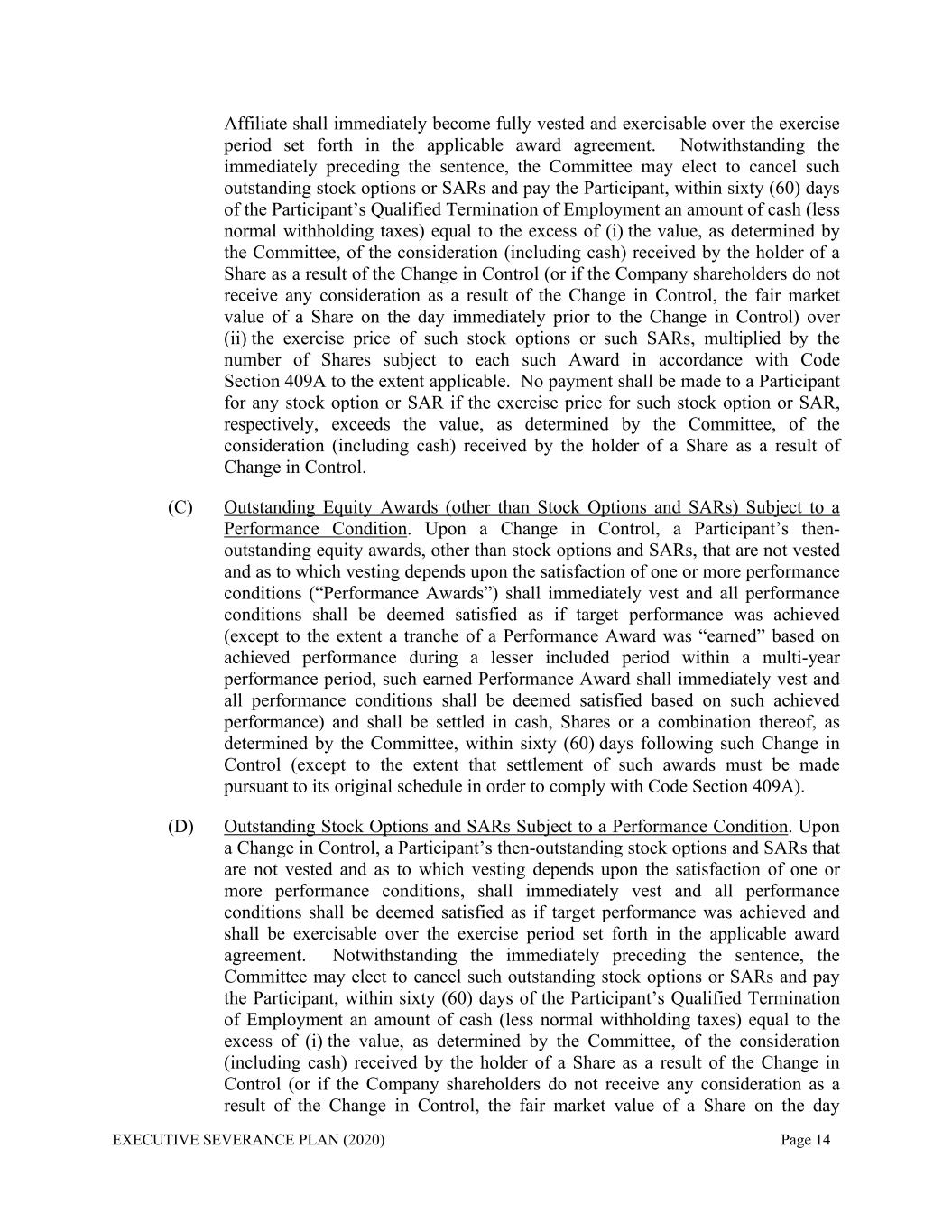 EXECUTIVE SEVERANCE PLAN (2020) Page 14 Affiliate shall immediately become fully vested and exercisable over the exercise period set forth in the applicable award agreement. Notwithstanding the immediately preceding the sentence, the Committee may elect to cancel such outstanding stock options or SARs and pay the Participant, within sixty (60) days of the Participant’s Qualified Termination of Employment an amount of cash (less normal withholding taxes) equal to the excess of (i) the value, as determined by the Committee, of the consideration (including cash) received by the holder of a Share as a result of the Change in Control (or if the Company shareholders do not receive any consideration as a result of the Change in Control, the fair market value of a Share on the day immediately prior to the Change in Control) over (ii) the exercise price of such stock options or such SARs, multiplied by the number of Shares subject to each such Award in accordance with Code Section 409A to the extent applicable. No payment shall be made to a Participant for any stock option or SAR if the exercise price for such stock option or SAR, respectively, exceeds the value, as determined by the Committee, of the consideration (including cash) received by the holder of a Share as a result of Change in Control. (C) Outstanding Equity Awards (other than Stock Options and SARs) Subject to a Performance Condition. Upon a Change in Control, a Participant’s then- outstanding equity awards, other than stock options and SARs, that are not vested and as to which vesting depends upon the satisfaction of one or more performance conditions (“Performance Awards”) shall immediately vest and all performance conditions shall be deemed satisfied as if target performance was achieved (except to the extent a tranche of a Performance Award was “earned” based on achieved performance during a lesser included period within a multi-year performance period, such earned Performance Award shall immediately vest and all performance conditions shall be deemed satisfied based on such achieved performance) and shall be settled in cash, Shares or a combination thereof, as determined by the Committee, within sixty (60) days following such Change in Control (except to the extent that settlement of such awards must be made pursuant to its original schedule in order to comply with Code Section 409A). (D) Outstanding Stock Options and SARs Subject to a Performance Condition. Upon a Change in Control, a Participant’s then-outstanding stock options and SARs that are not vested and as to which vesting depends upon the satisfaction of one or more performance conditions, shall immediately vest and all performance conditions shall be deemed satisfied as if target performance was achieved and shall be exercisable over the exercise period set forth in the applicable award agreement. Notwithstanding the immediately preceding the sentence, the Committee may elect to cancel such outstanding stock options or SARs and pay the Participant, within sixty (60) days of the Participant’s Qualified Termination of Employment an amount of cash (less normal withholding taxes) equal to the excess of (i) the value, as determined by the Committee, of the consideration (including cash) received by the holder of a Share as a result of the Change in Control (or if the Company shareholders do not receive any consideration as a result of the Change in Control, the fair market value of a Share on the day
