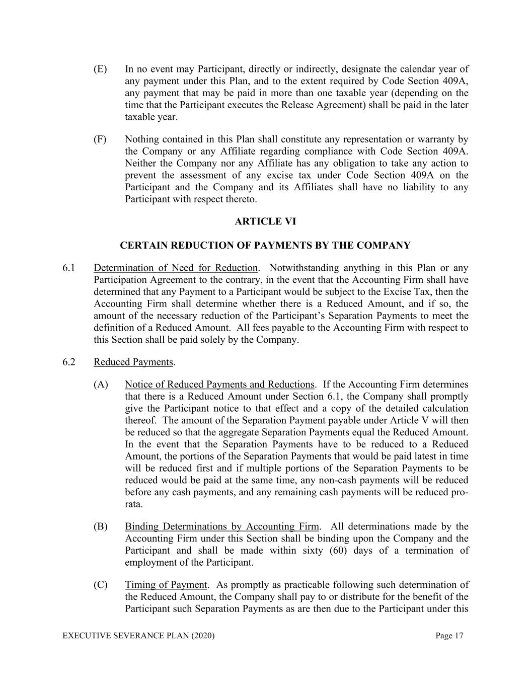 EXECUTIVE SEVERANCE PLAN (2020) Page 17 (E) In no event may Participant, directly or indirectly, designate the calendar year of any payment under this Plan, and to the extent required by Code Section 409A, any payment that may be paid in more than one taxable year (depending on the time that the Participant executes the Release Agreement) shall be paid in the later taxable year. (F) Nothing contained in this Plan shall constitute any representation or warranty by the Company or any Affiliate regarding compliance with Code Section 409A. Neither the Company nor any Affiliate has any obligation to take any action to prevent the assessment of any excise tax under Code Section 409A on the Participant and the Company and its Affiliates shall have no liability to any Participant with respect thereto. ARTICLE VI CERTAIN REDUCTION OF PAYMENTS BY THE COMPANY 6.1 Determination of Need for Reduction. Notwithstanding anything in this Plan or any Participation Agreement to the contrary, in the event that the Accounting Firm shall have determined that any Payment to a Participant would be subject to the Excise Tax, then the Accounting Firm shall determine whether there is a Reduced Amount, and if so, the amount of the necessary reduction of the Participant’s Separation Payments to meet the definition of a Reduced Amount. All fees payable to the Accounting Firm with respect to this Section shall be paid solely by the Company. 6.2 Reduced Payments. (A) Notice of Reduced Payments and Reductions. If the Accounting Firm determines that there is a Reduced Amount under Section 6.1, the Company shall promptly give the Participant notice to that effect and a copy of the detailed calculation thereof. The amount of the Separation Payment payable under Article V will then be reduced so that the aggregate Separation Payments equal the Reduced Amount. In the event that the Separation Payments have to be reduced to a Reduced Amount, the portions of the Separation Payments that would be paid latest in time will be reduced first and if multiple portions of the Separation Payments to be reduced would be paid at the same time, any non-cash payments will be reduced before any cash payments, and any remaining cash payments will be reduced pro- rata. (B) Binding Determinations by Accounting Firm. All determinations made by the Accounting Firm under this Section shall be binding upon the Company and the Participant and shall be made within sixty (60) days of a termination of employment of the Participant. (C) Timing of Payment. As promptly as practicable following such determination of the Reduced Amount, the Company shall pay to or distribute for the benefit of the Participant such Separation Payments as are then due to the Participant under this