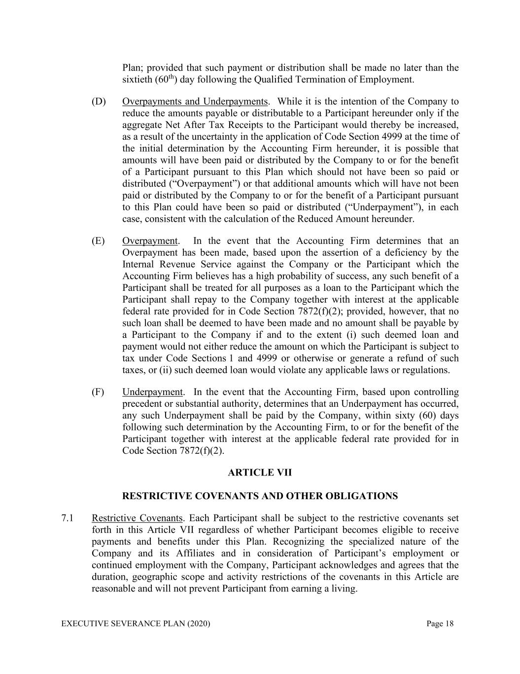 EXECUTIVE SEVERANCE PLAN (2020) Page 18 Plan; provided that such payment or distribution shall be made no later than the sixtieth (60th) day following the Qualified Termination of Employment. (D) Overpayments and Underpayments. While it is the intention of the Company to reduce the amounts payable or distributable to a Participant hereunder only if the aggregate Net After Tax Receipts to the Participant would thereby be increased, as a result of the uncertainty in the application of Code Section 4999 at the time of the initial determination by the Accounting Firm hereunder, it is possible that amounts will have been paid or distributed by the Company to or for the benefit of a Participant pursuant to this Plan which should not have been so paid or distributed (“Overpayment”) or that additional amounts which will have not been paid or distributed by the Company to or for the benefit of a Participant pursuant to this Plan could have been so paid or distributed (“Underpayment”), in each case, consistent with the calculation of the Reduced Amount hereunder. (E) Overpayment. In the event that the Accounting Firm determines that an Overpayment has been made, based upon the assertion of a deficiency by the Internal Revenue Service against the Company or the Participant which the Accounting Firm believes has a high probability of success, any such benefit of a Participant shall be treated for all purposes as a loan to the Participant which the Participant shall repay to the Company together with interest at the applicable federal rate provided for in Code Section 7872(f)(2); provided, however, that no such loan shall be deemed to have been made and no amount shall be payable by a Participant to the Company if and to the extent (i) such deemed loan and payment would not either reduce the amount on which the Participant is subject to tax under Code Sections 1 and 4999 or otherwise or generate a refund of such taxes, or (ii) such deemed loan would violate any applicable laws or regulations. (F) Underpayment. In the event that the Accounting Firm, based upon controlling precedent or substantial authority, determines that an Underpayment has occurred, any such Underpayment shall be paid by the Company, within sixty (60) days following such determination by the Accounting Firm, to or for the benefit of the Participant together with interest at the applicable federal rate provided for in Code Section 7872(f)(2). ARTICLE VII RESTRICTIVE COVENANTS AND OTHER OBLIGATIONS 7.1 Restrictive Covenants. Each Participant shall be subject to the restrictive covenants set forth in this Article VII regardless of whether Participant becomes eligible to receive payments and benefits under this Plan. Recognizing the specialized nature of the Company and its Affiliates and in consideration of Participant’s employment or continued employment with the Company, Participant acknowledges and agrees that the duration, geographic scope and activity restrictions of the covenants in this Article are reasonable and will not prevent Participant from earning a living.